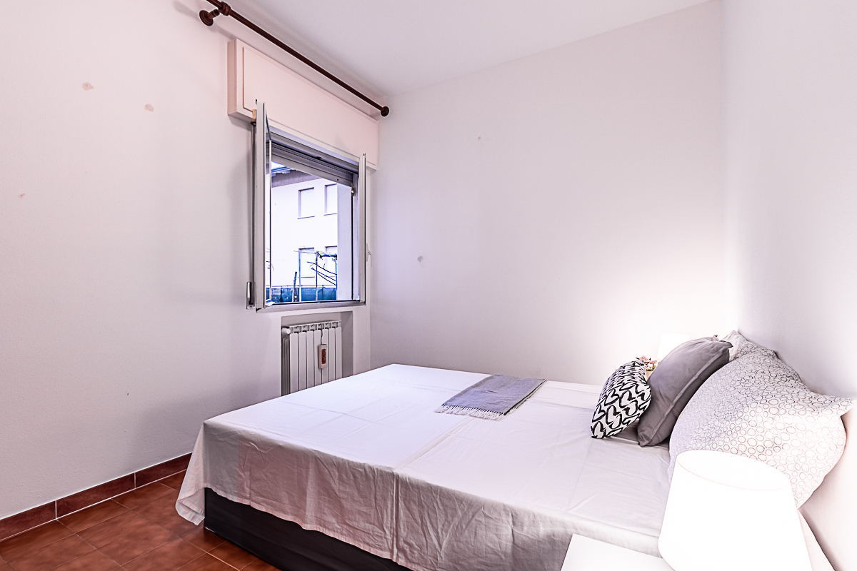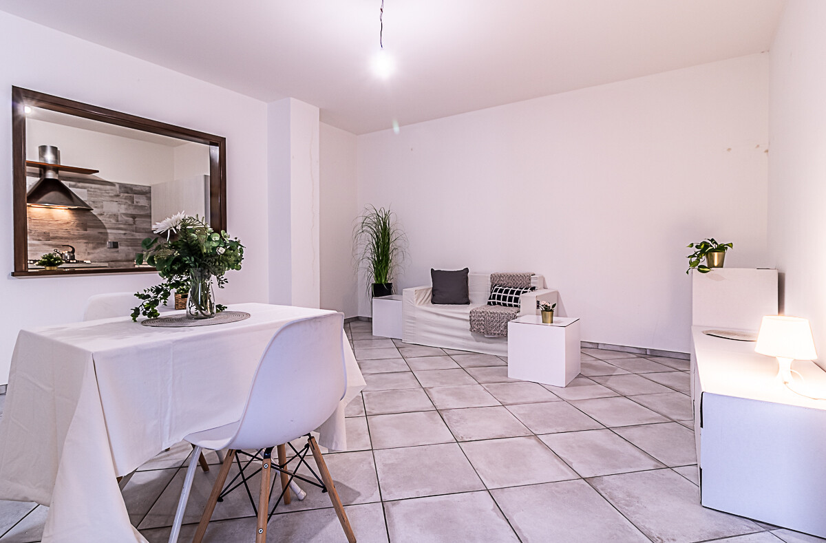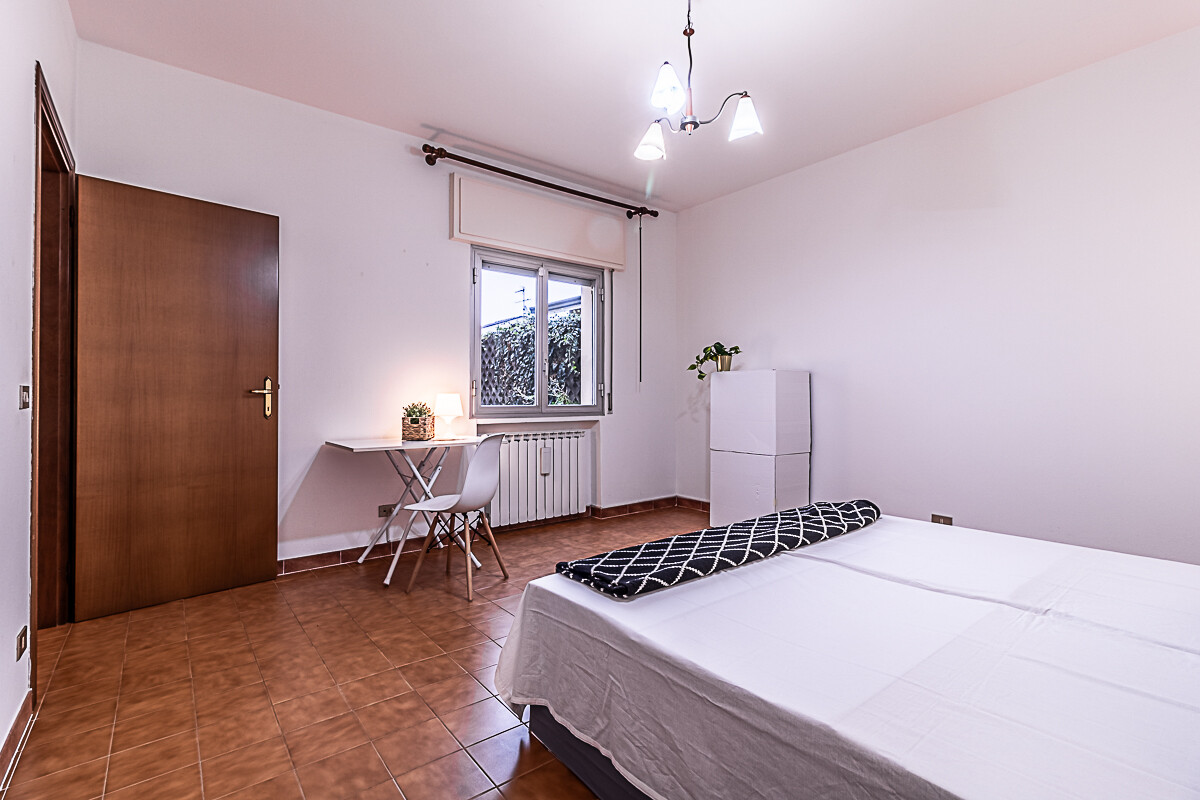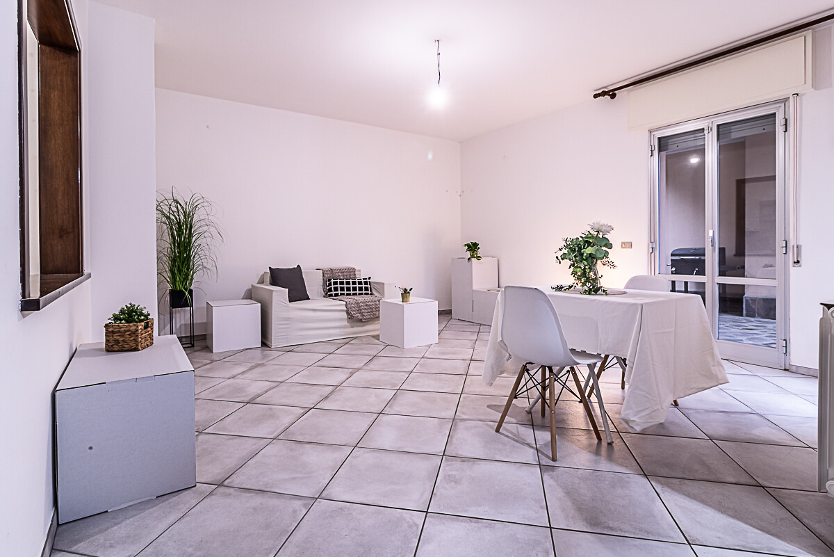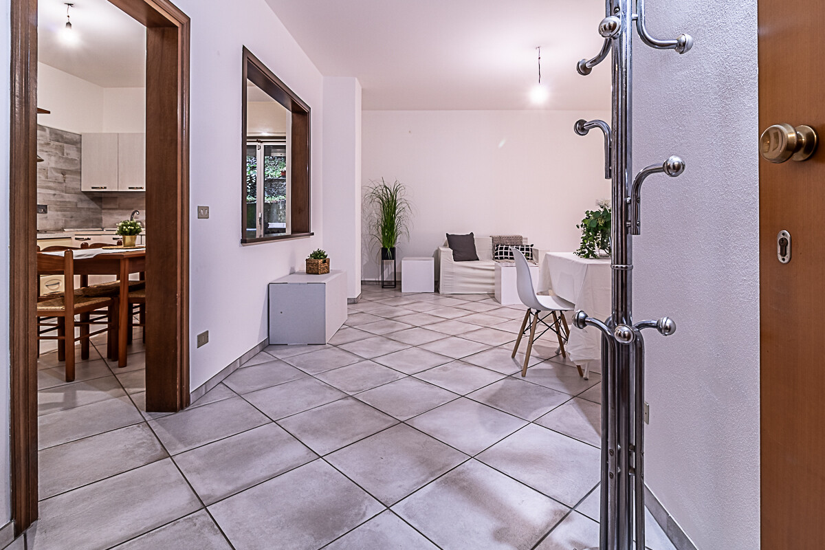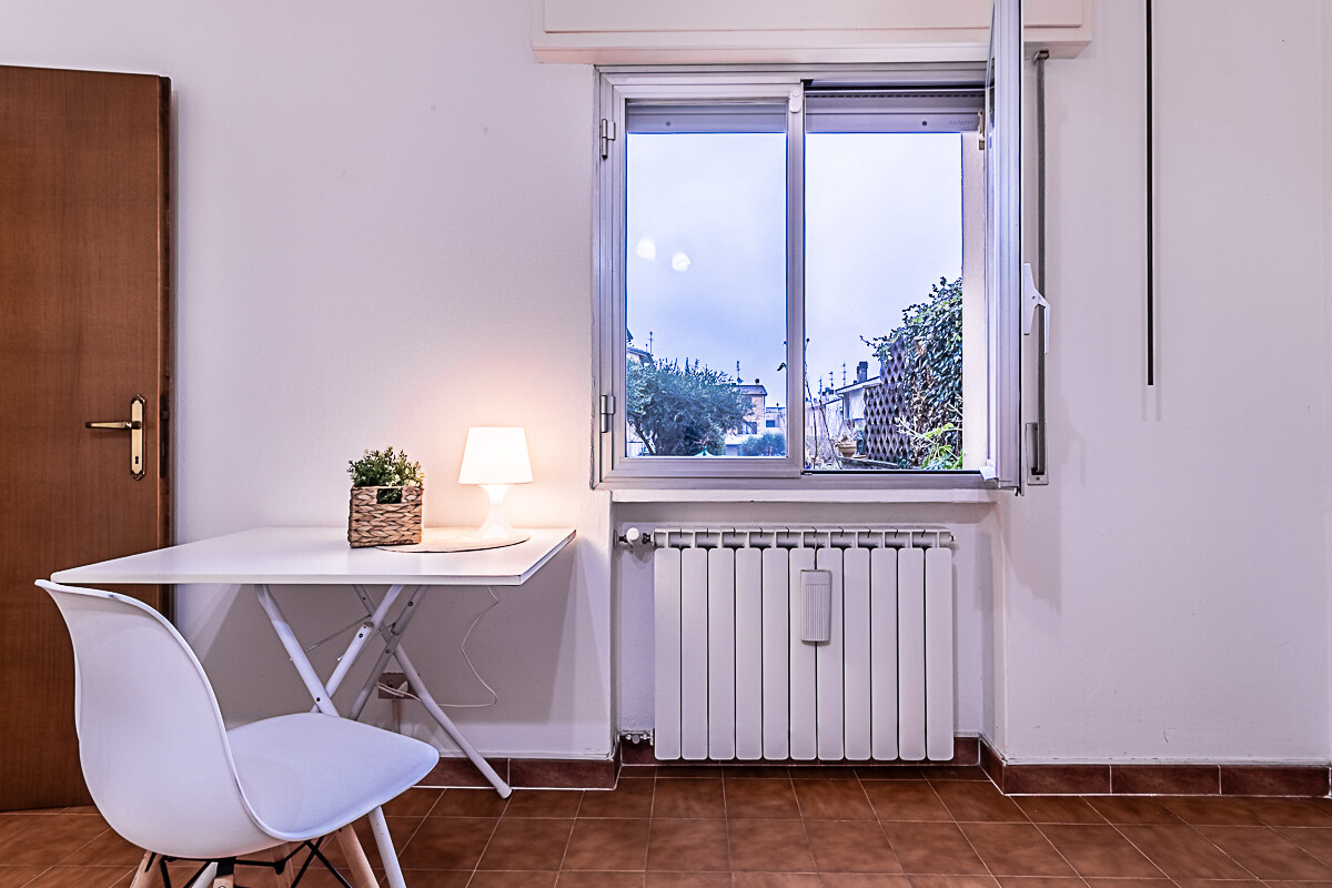 L’appartamento è composto dall’ingresso che conduce alla zona giorno composta da una sala luminosa e da una cucina abitabile, entrambe con affacci verso la corte esterna condominiale. Un disimpegno organizza la zona notte, dove sono presenti una camera singola, una camera doppia e un piccolo stanzino finestrato, ideale come studio, ripostiglio o spazio di servizio. Sull’altro lato del disimpegno si collocano la camera matrimoniale e il bagno finestrato con doccia, garantendo una buona separazione tra gli ambienti.