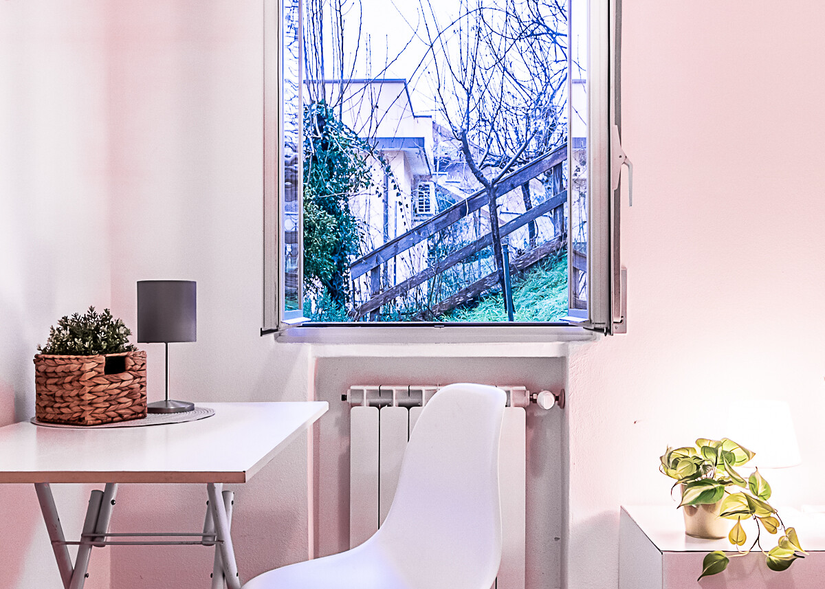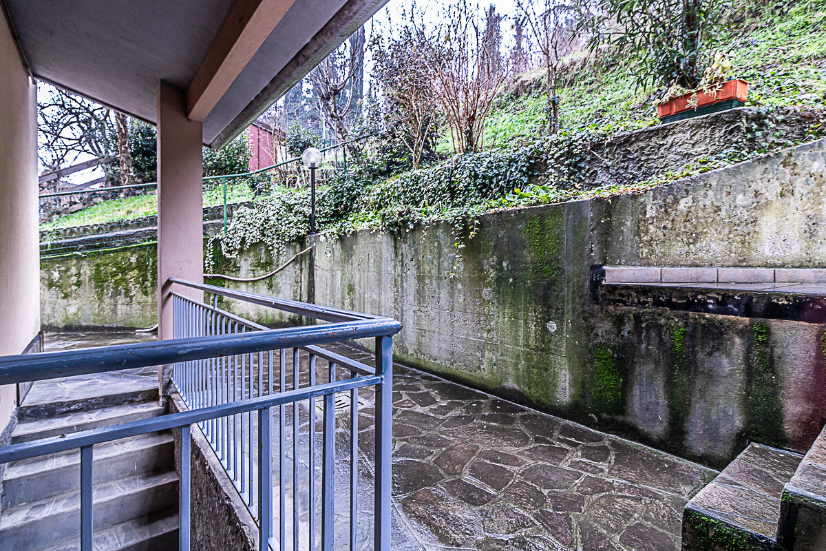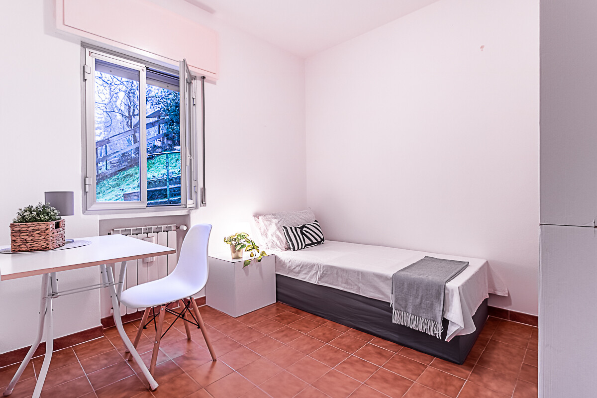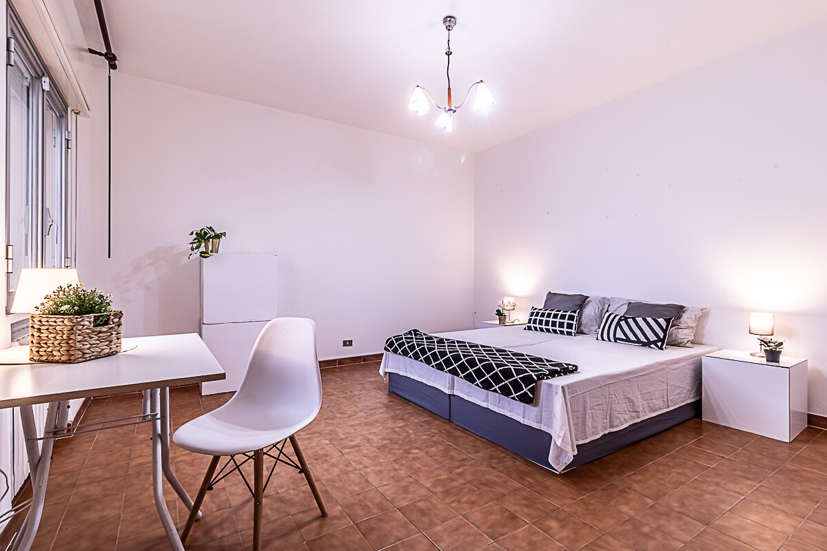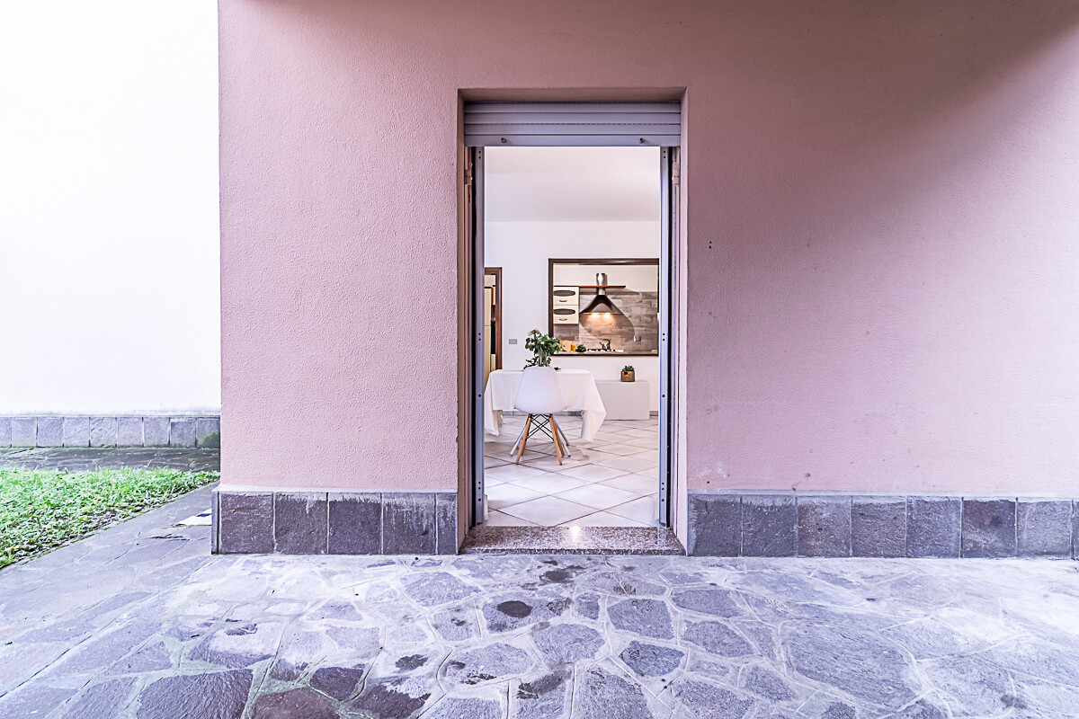 L’appartamento è composto dall’ingresso che conduce alla zona giorno composta da una sala luminosa e da una cucina abitabile, entrambe con affacci verso la corte esterna condominiale. Un disimpegno organizza la zona notte, dove sono presenti una camera singola, una camera doppia e un piccolo stanzino finestrato, ideale come studio, ripostiglio o spazio di servizio. Sull’altro lato del disimpegno si collocano la camera matrimoniale e il bagno finestrato con doccia, garantendo una buona separazione tra gli ambienti.