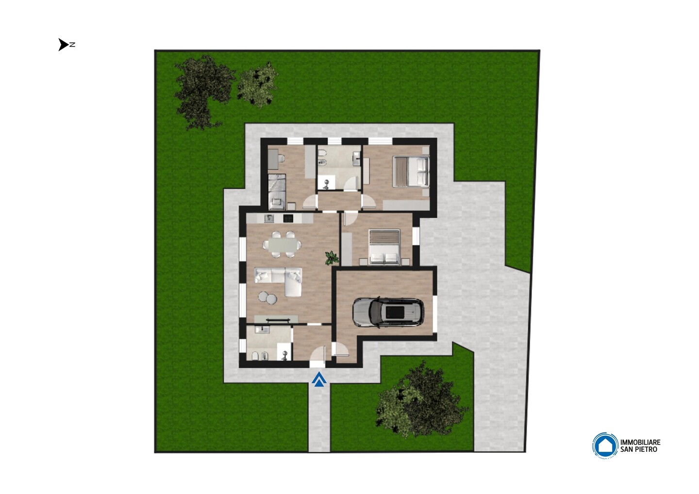 La villa monofamiliare si sviluppa su unico piano e si compone di ingresso arredabile, sala di oltre 30 mq con cucina a vista, disimpegno zona notte con 3 camere (2 matrimoniali e 1 singola) e 2 bagni finestrati. La soluzione è caratterizzata da grande luminosità in ogni ora della giornata, grazie alle ampie porte finestre sia nella zona giorno che in tutte le camere, che danno accesso al giardino di 500 mq.