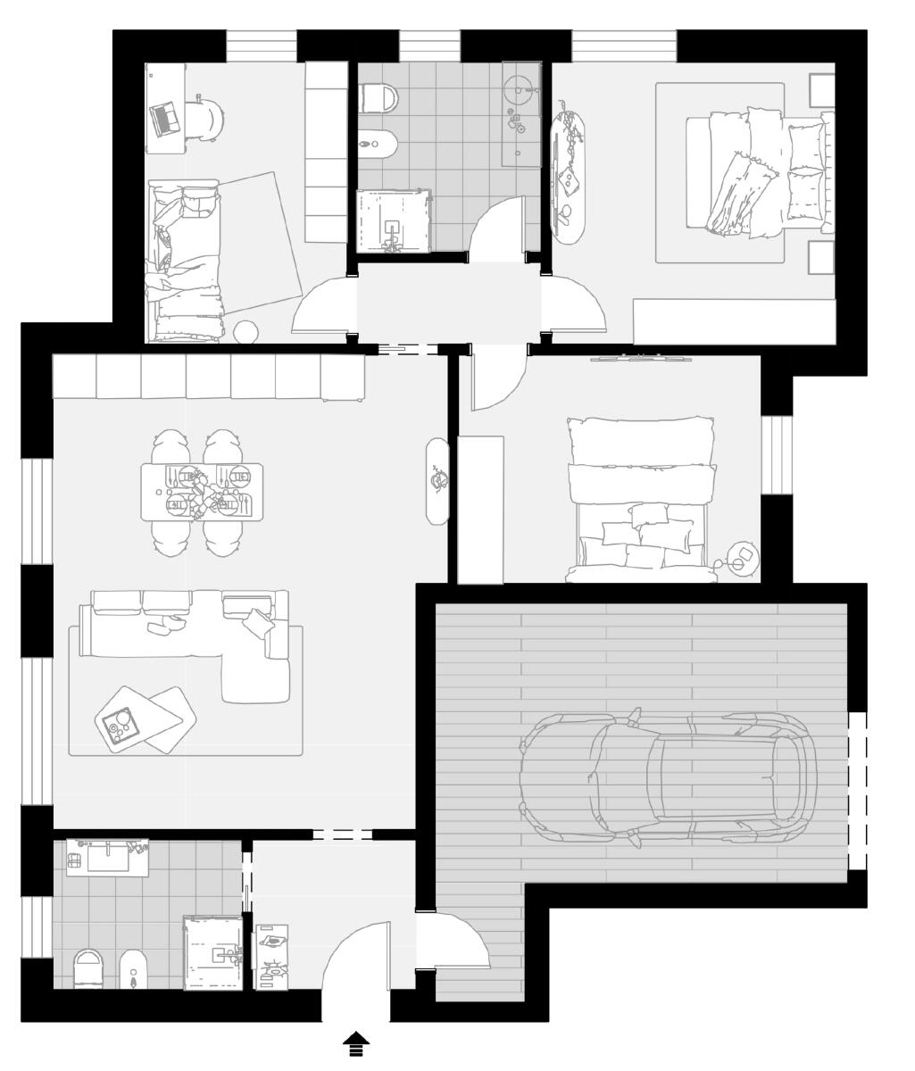 Completa la proprietà l’autorimessa, collegata anche internamente all’immobile e nel cortile spazio per il posto auto.