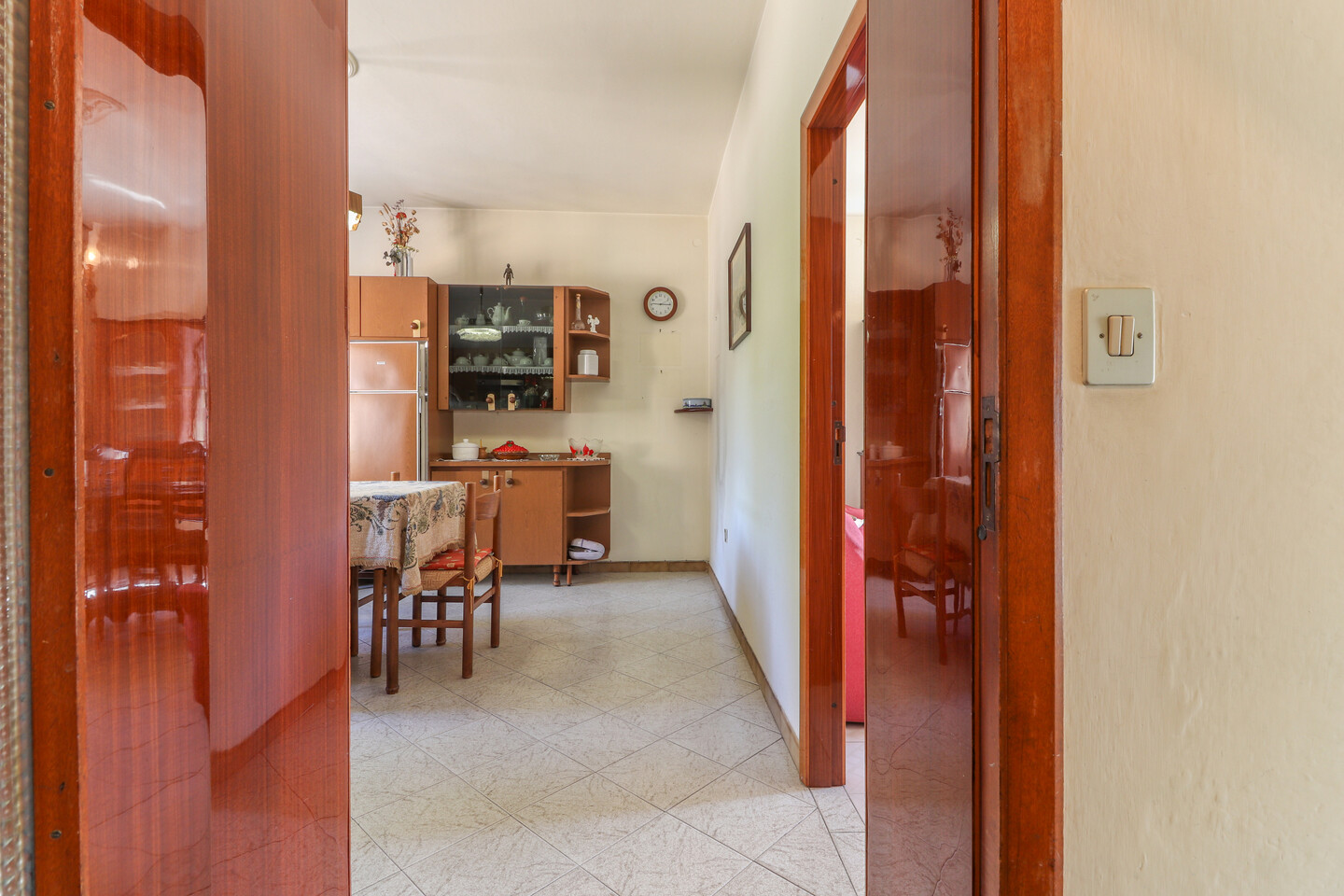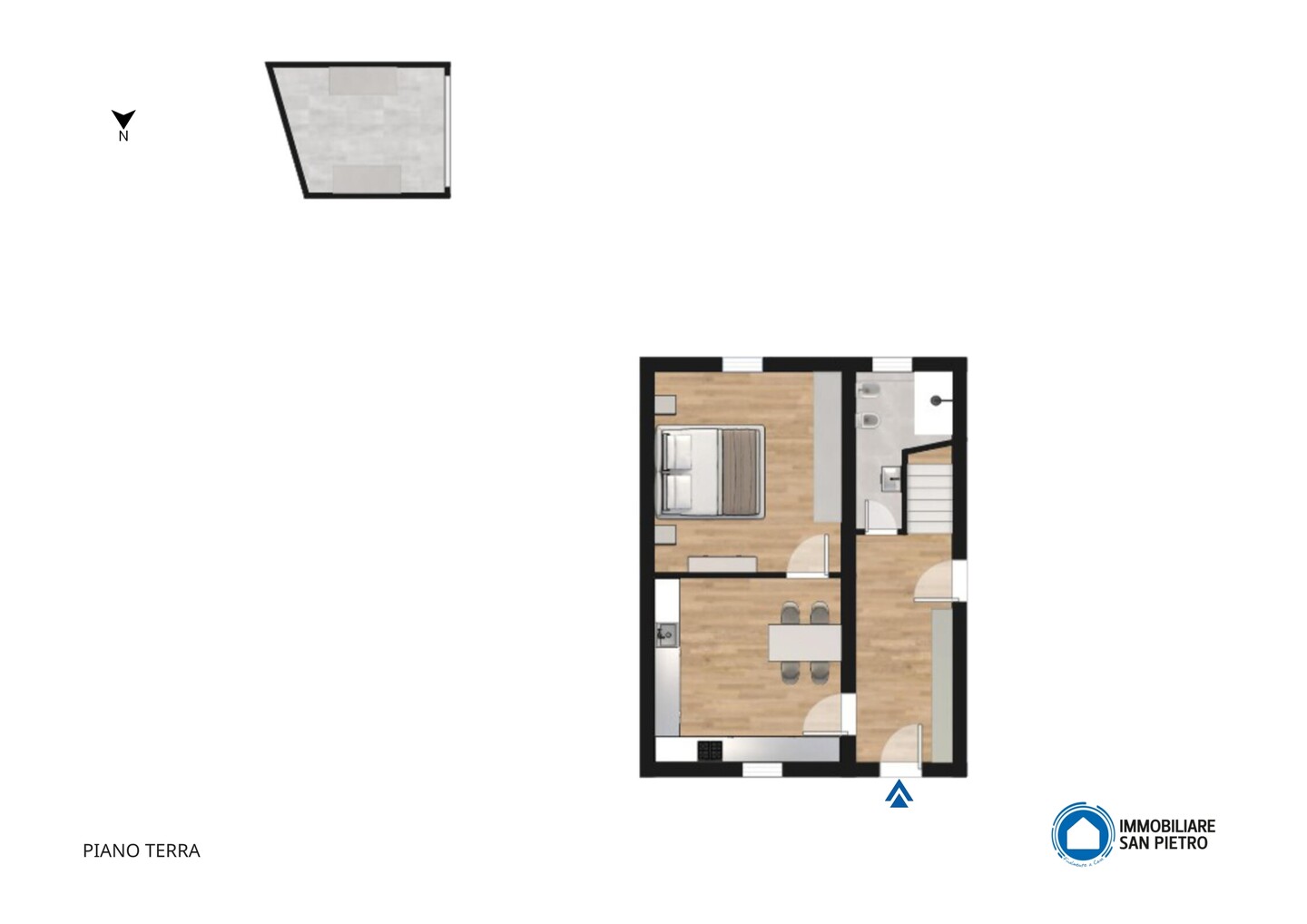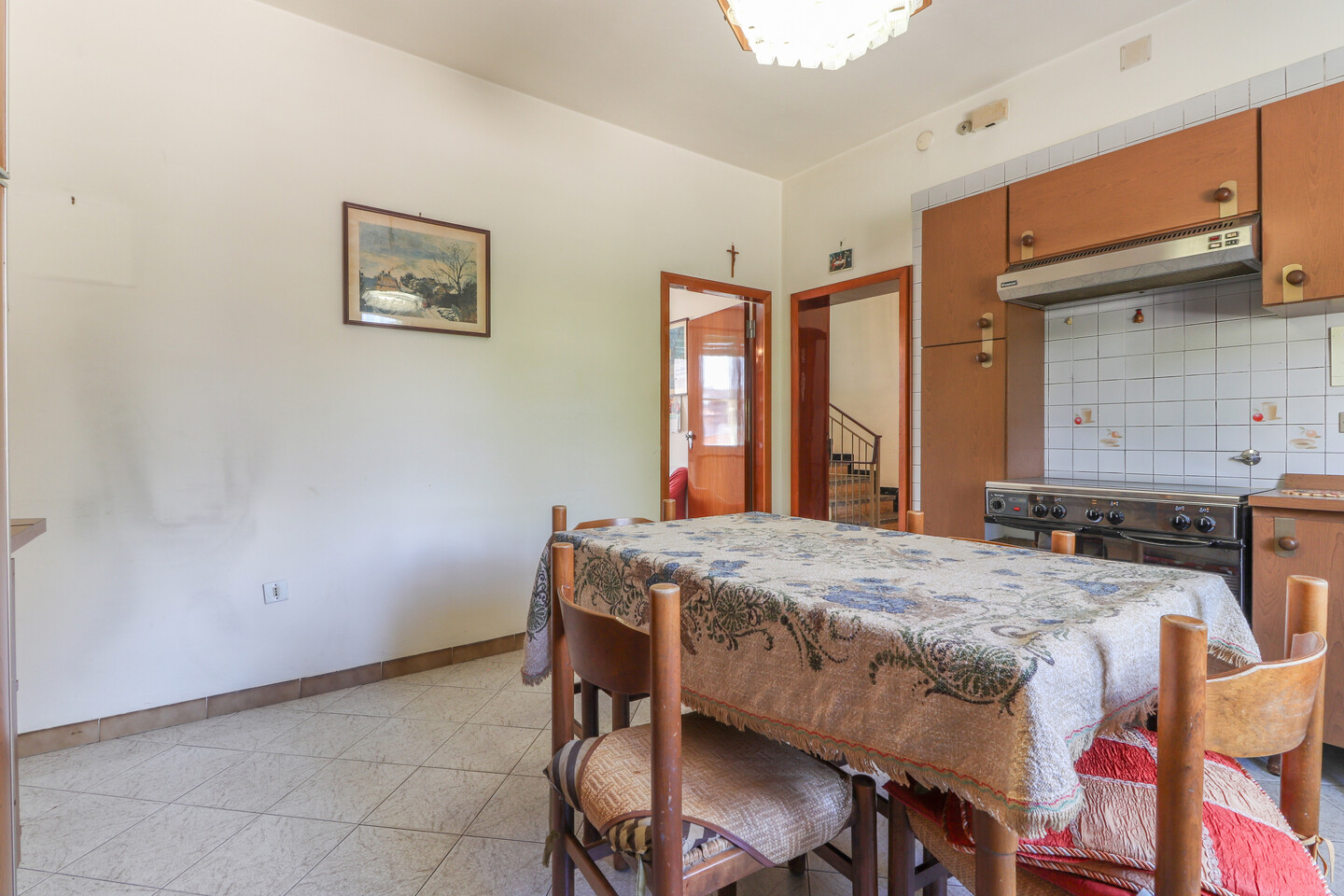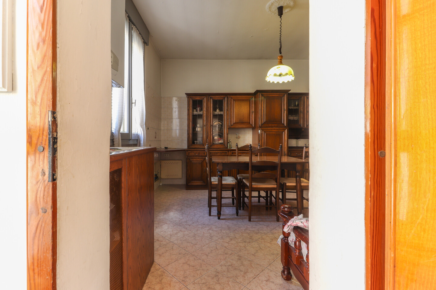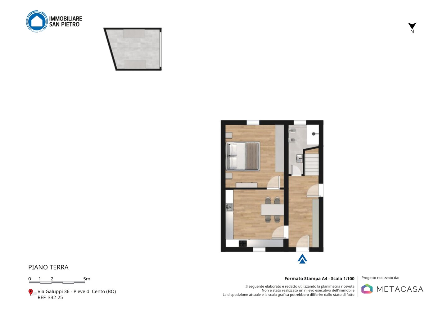 Porzione di casa indipendente composta da: al piano terra ingresso, cucina, letto e bagno. Al piano primo soggiorno, cucina e bagno. Al piano secondo due camere e un ripostiglio. Completa la proprietà un locale di circa 11 mq ad uso autorimessa all’interno di una corte comune.
