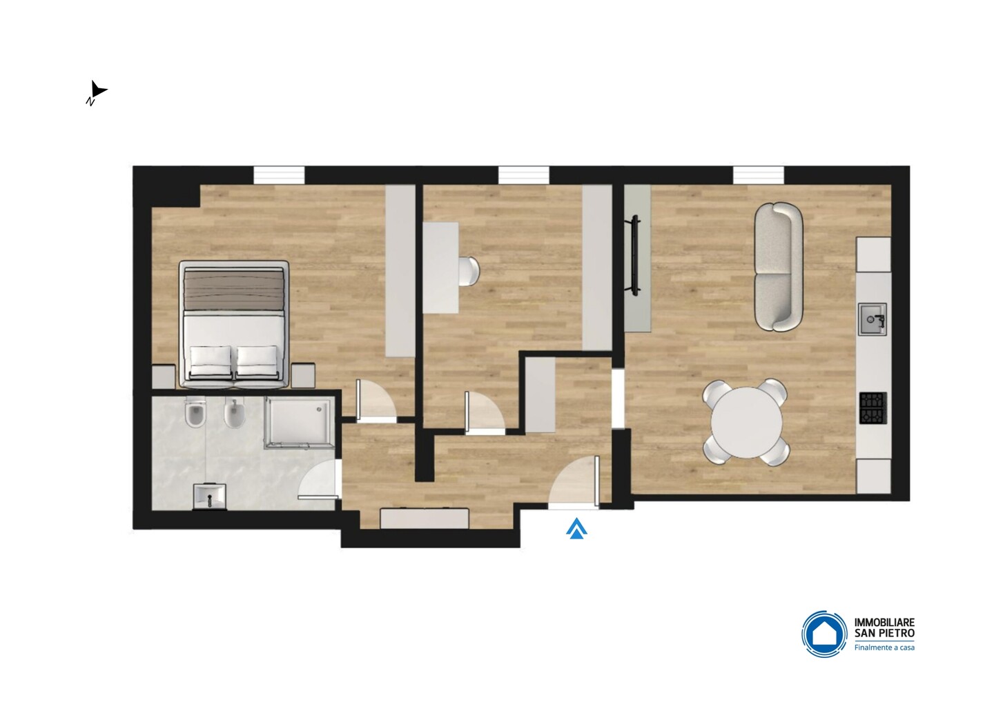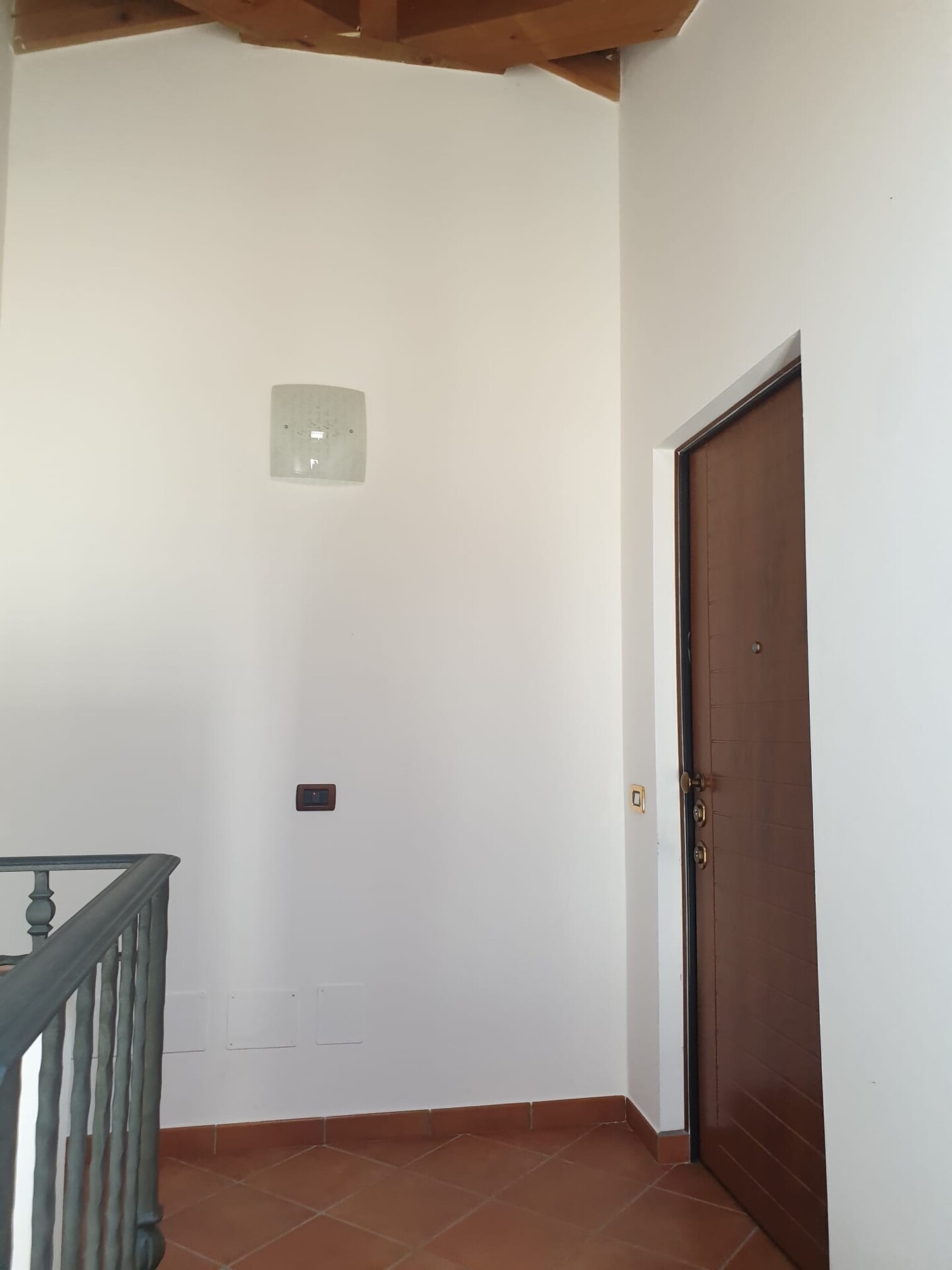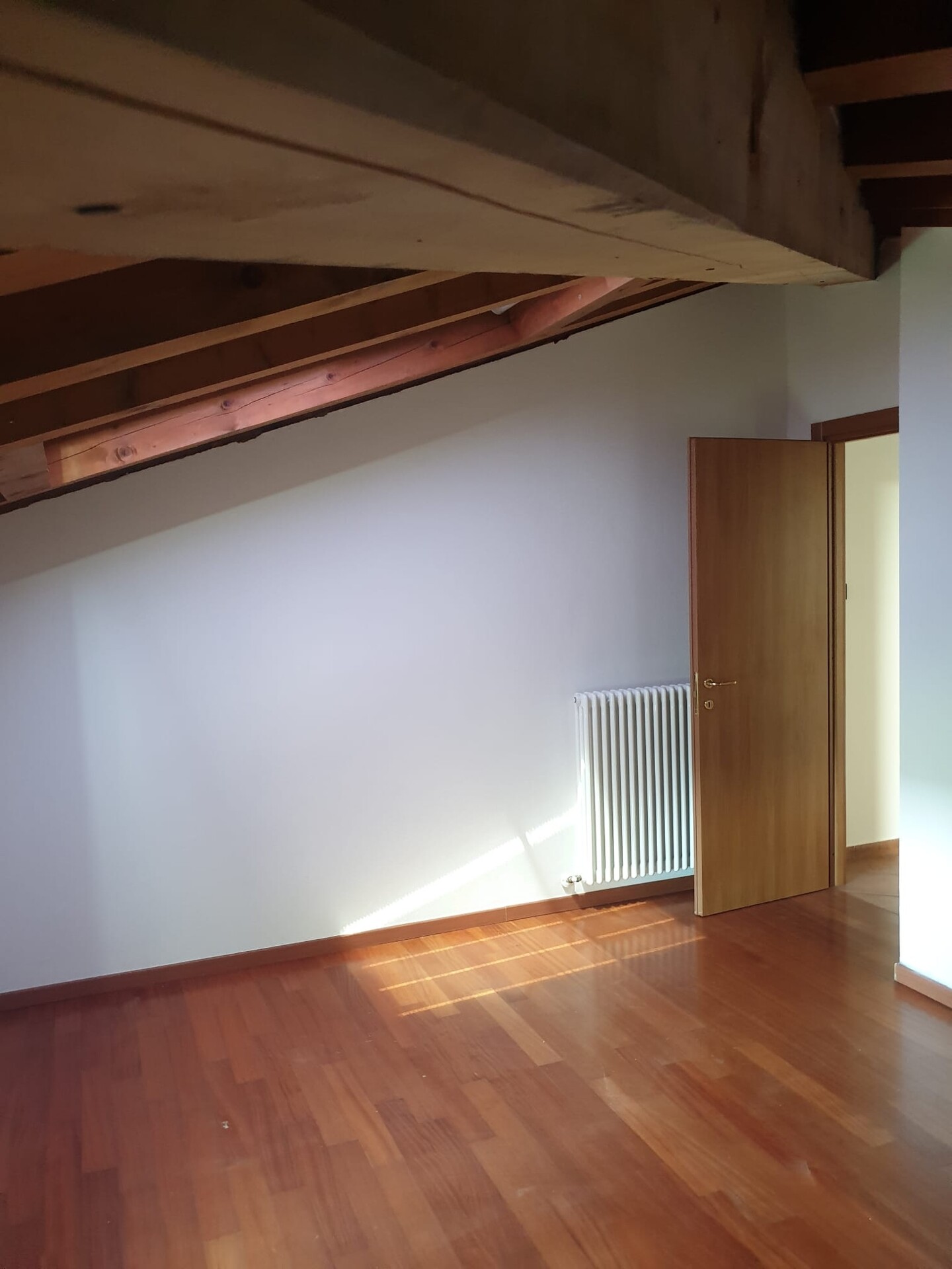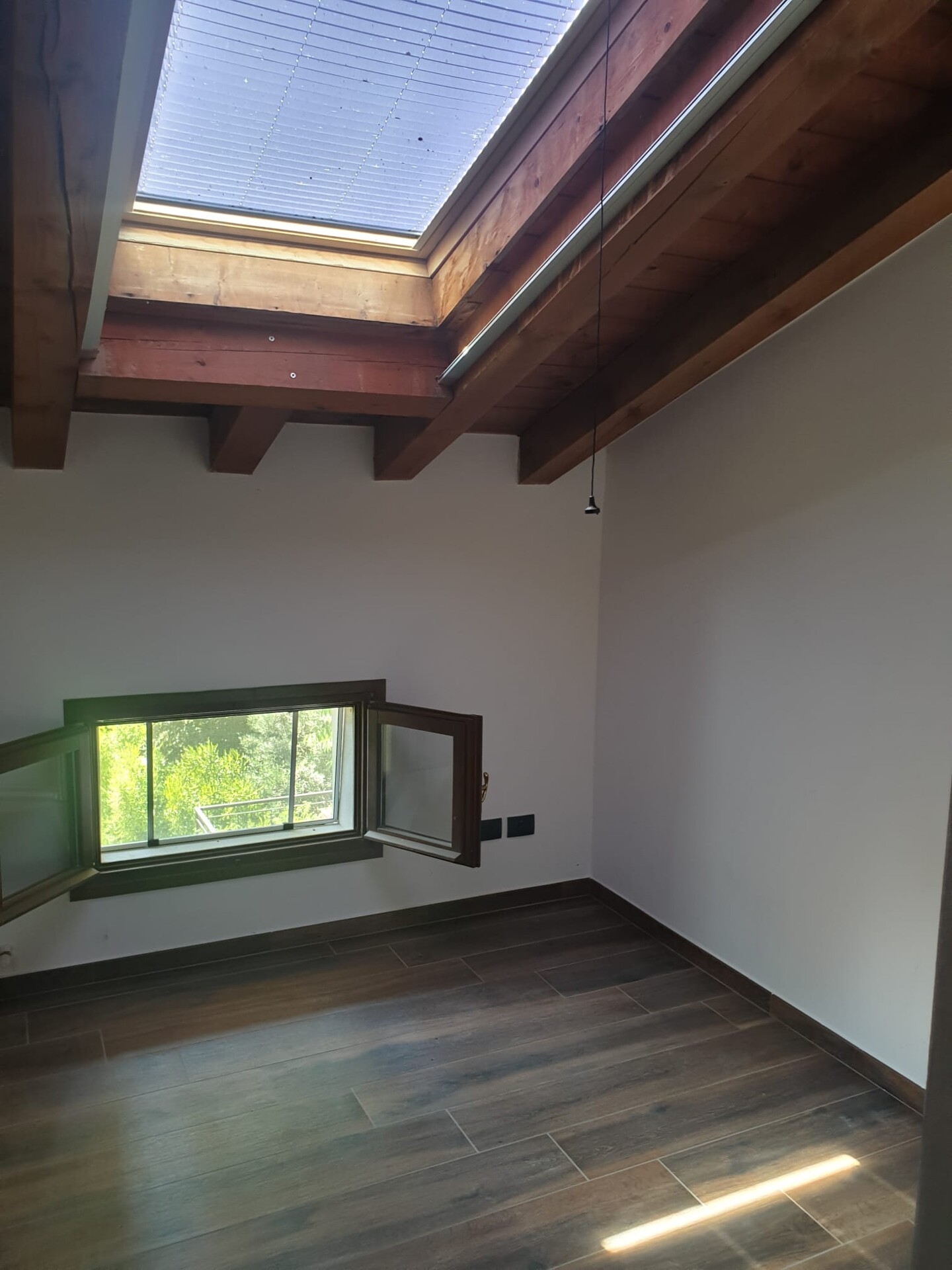 L’appartamento è composto da ingresso su disimpegno, soggiorno con angolo cottura, 1 camera matrimoniale, 1 camera singola o studio e 1 bagno. Ha soffitti mansardati con travi a vista in legno e diversi velux, che donano ottima luminosità all’immobile, porta blindata, videocitofono e riscaldamento autonomo a radiatori. Completa la proprietà un giardino condominiale che circonda la palazzina, offrendo uno spazio verde comune.