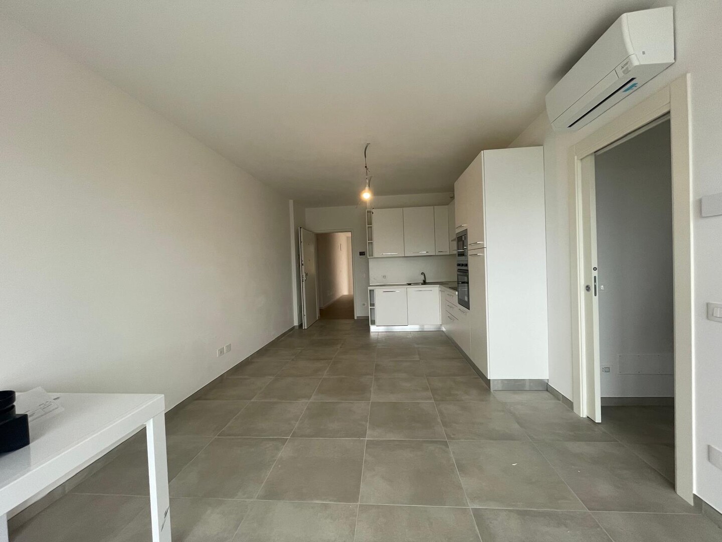 Ingresso su soggiorno con angolo cottura ed accesso al balcone, disimpegno, camera da letto matrimoniale, camera da letto doppia, camera da letto singola e 2 bagni. Al piano terra ampio garage.