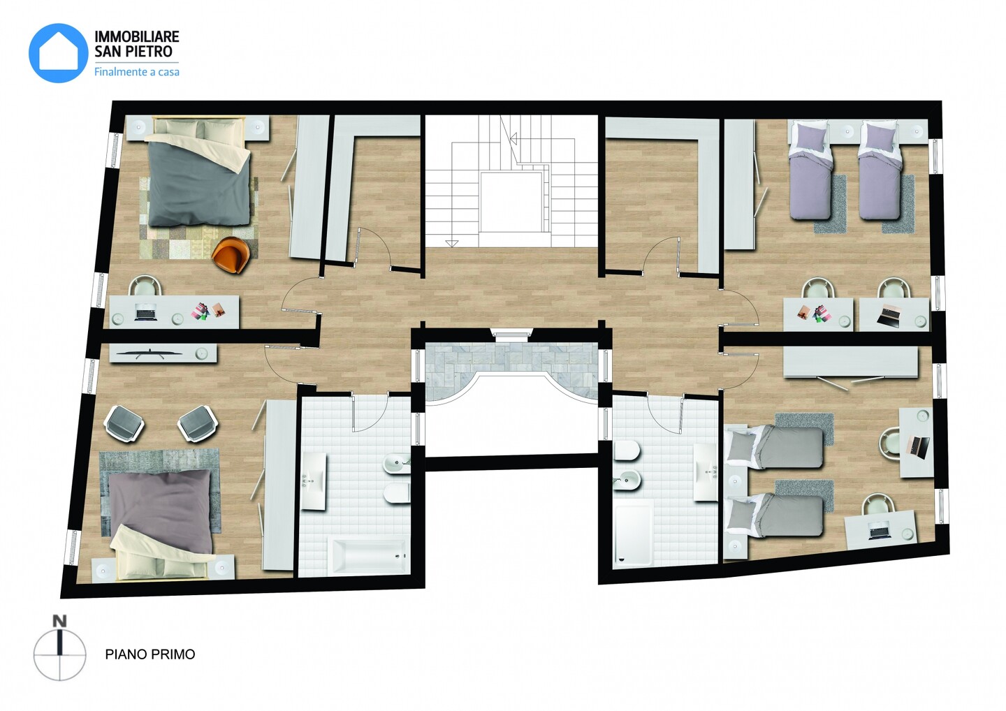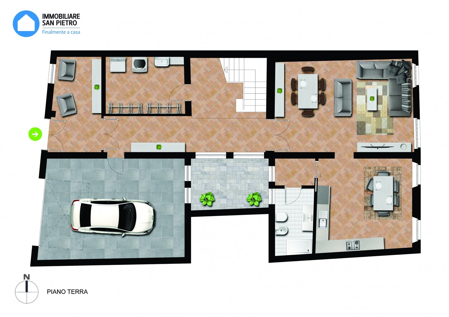 Porzione di casa indipendente composta da ingresso, disimpegno zona giorno, garage collegato internamente, soggiorno, cucina abitabile, lavanderia, bagno; primo piano con 4 camere matrimoniali, 2 bagni, 2 ripostigli; sottotetto al grezzo. Giardino interno di 200mq.