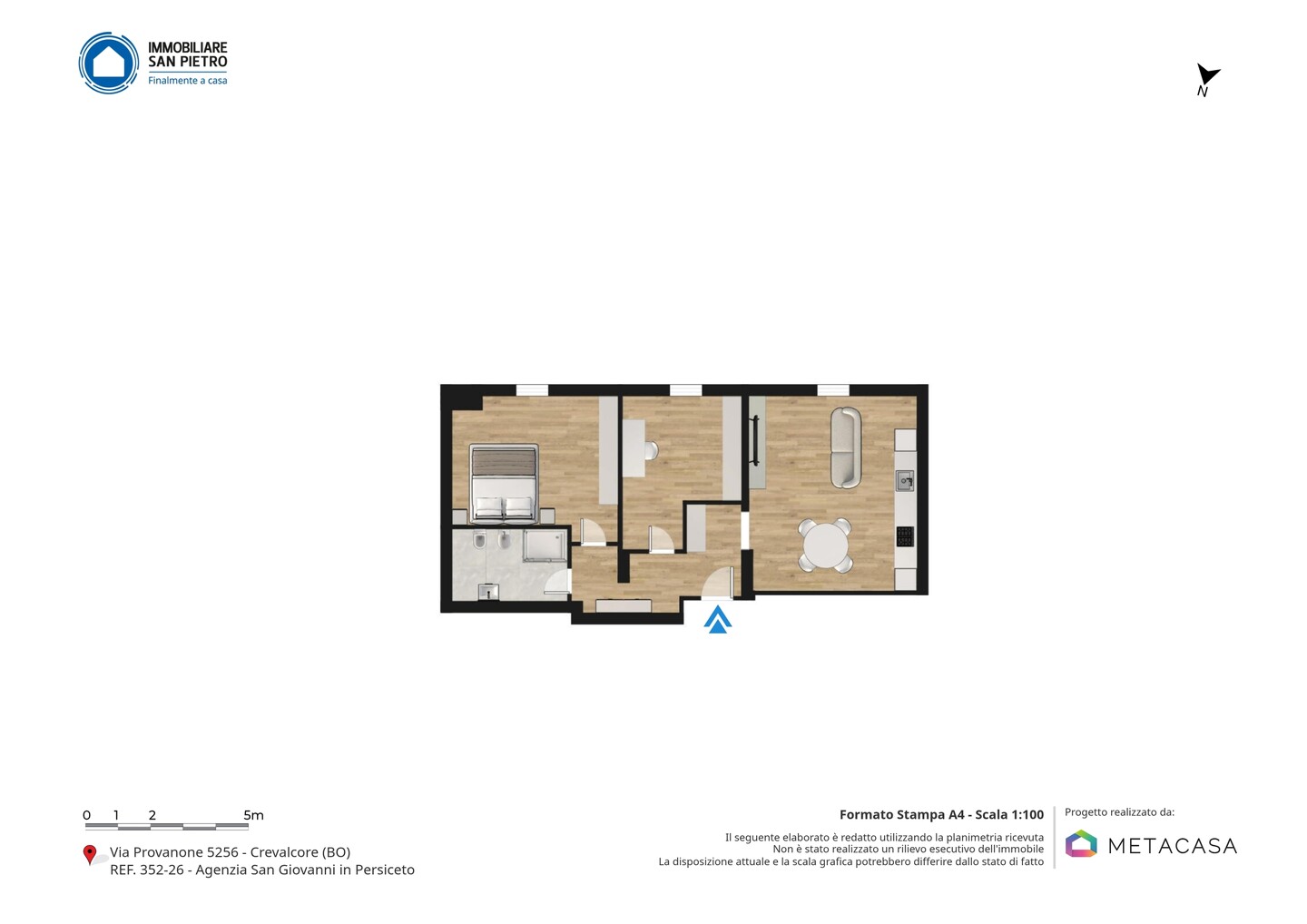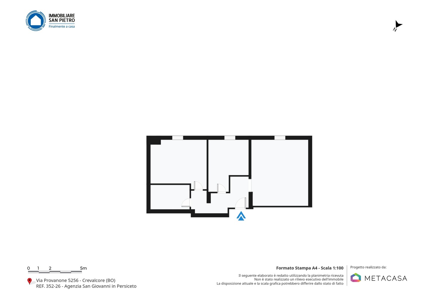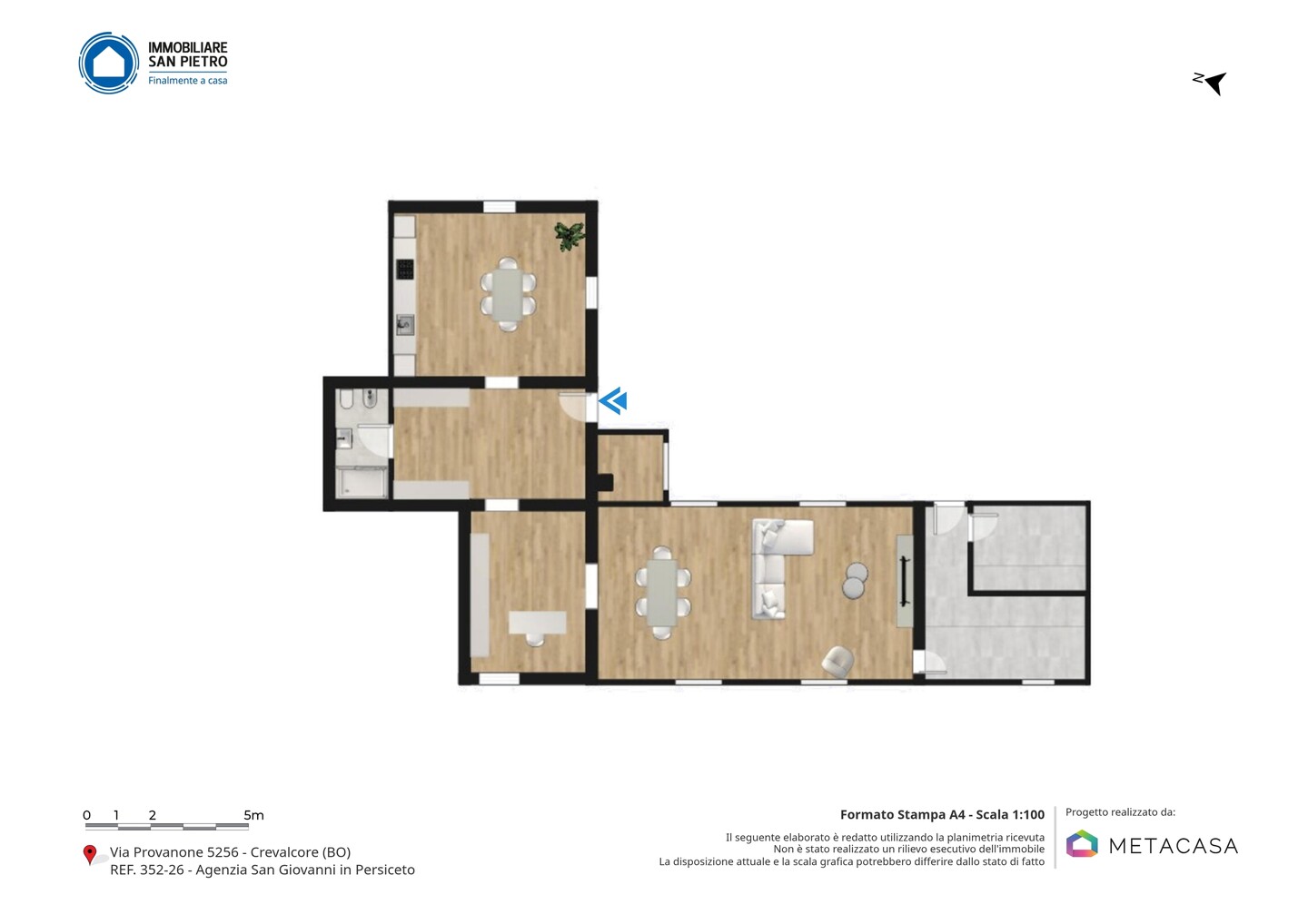 Lo stabile è situato in Via Provanone, nella frazione Palata Pepoli di Crevalcore, in un contesto tranquillo e residenziale immerso nel verde della pianura emiliana. La zona è comoda ai principali collegamenti stradali verso Crevalcore, San Giovanni in Persiceto e Cento, con servizi essenziali, attività commerciali e fermate dei mezzi pubblici raggiungibili in pochi minuti di auto. Il contesto garantisce riservatezza e tranquillità, pur mantenendo una buona accessibilità ai centri abitati limitrofi.