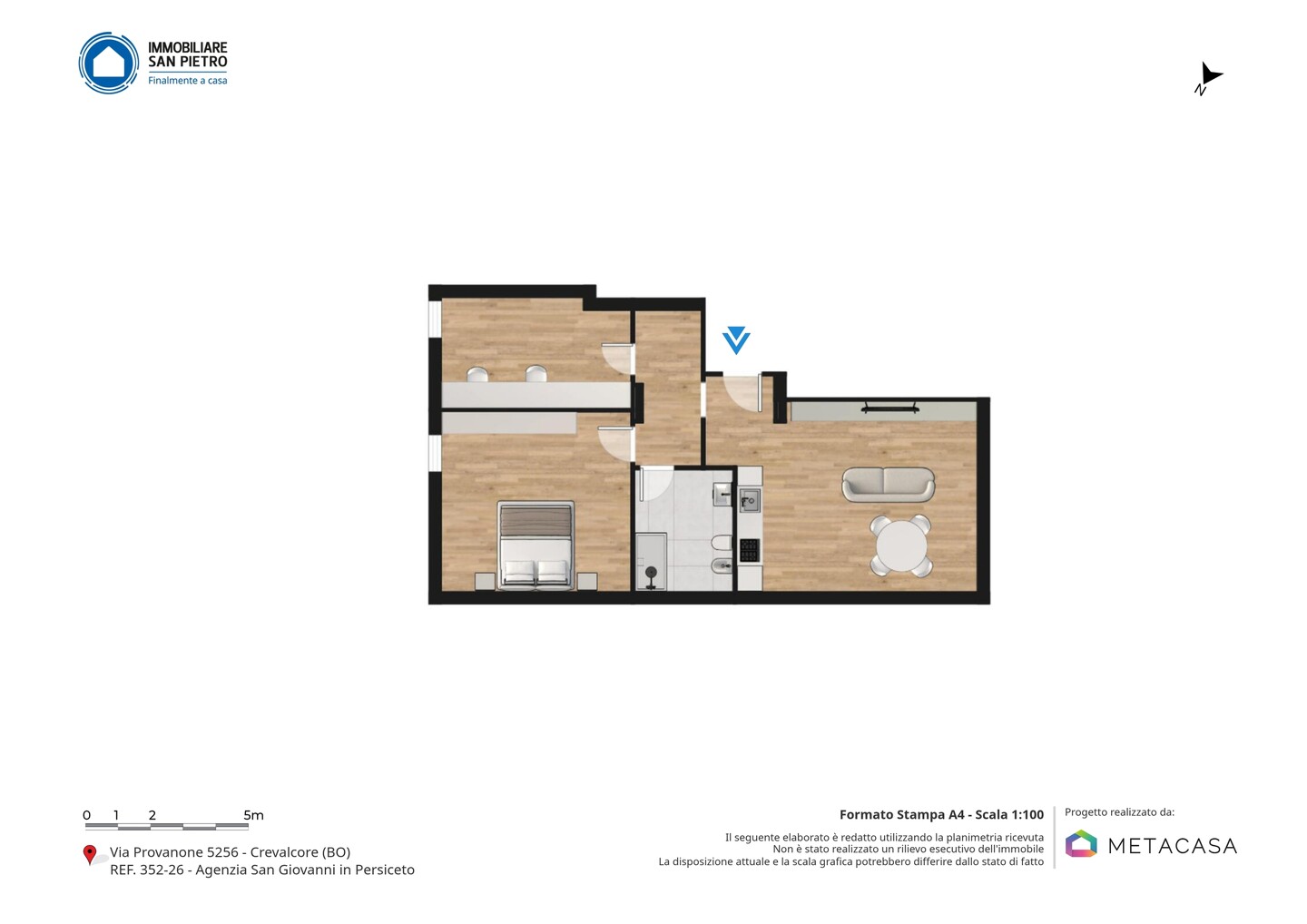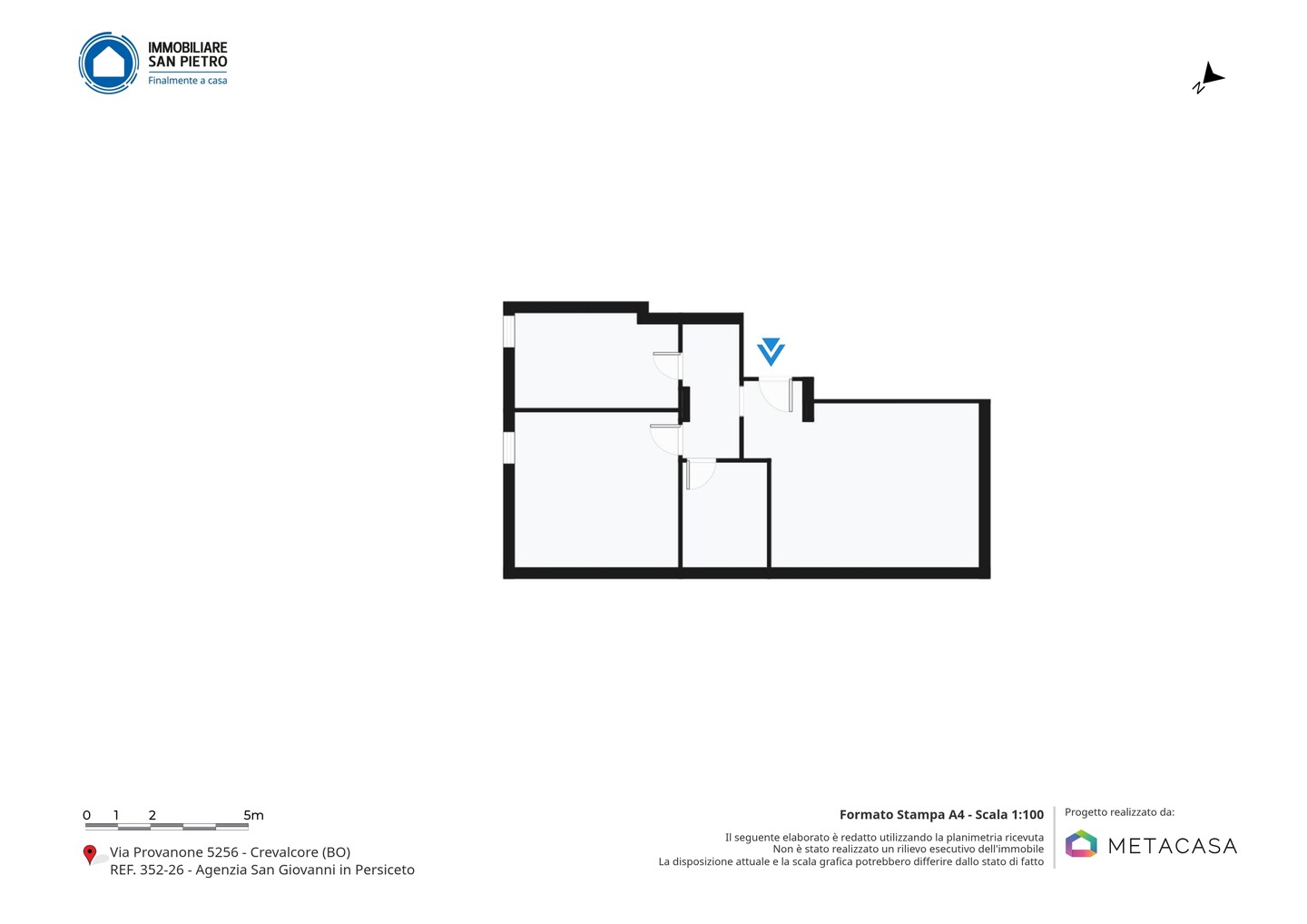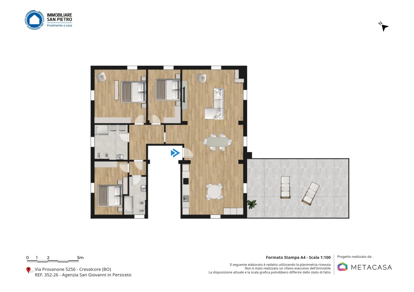 Lo stabile è situato in Via Provanone, nella frazione Palata Pepoli di Crevalcore, in un contesto tranquillo e residenziale immerso nel verde della pianura emiliana. La zona è comoda ai principali collegamenti stradali verso Crevalcore, San Giovanni in Persiceto e Cento, con servizi essenziali, attività commerciali e fermate dei mezzi pubblici raggiungibili in pochi minuti di auto. Il contesto garantisce riservatezza e tranquillità, pur mantenendo una buona accessibilità ai centri abitati limitrofi.