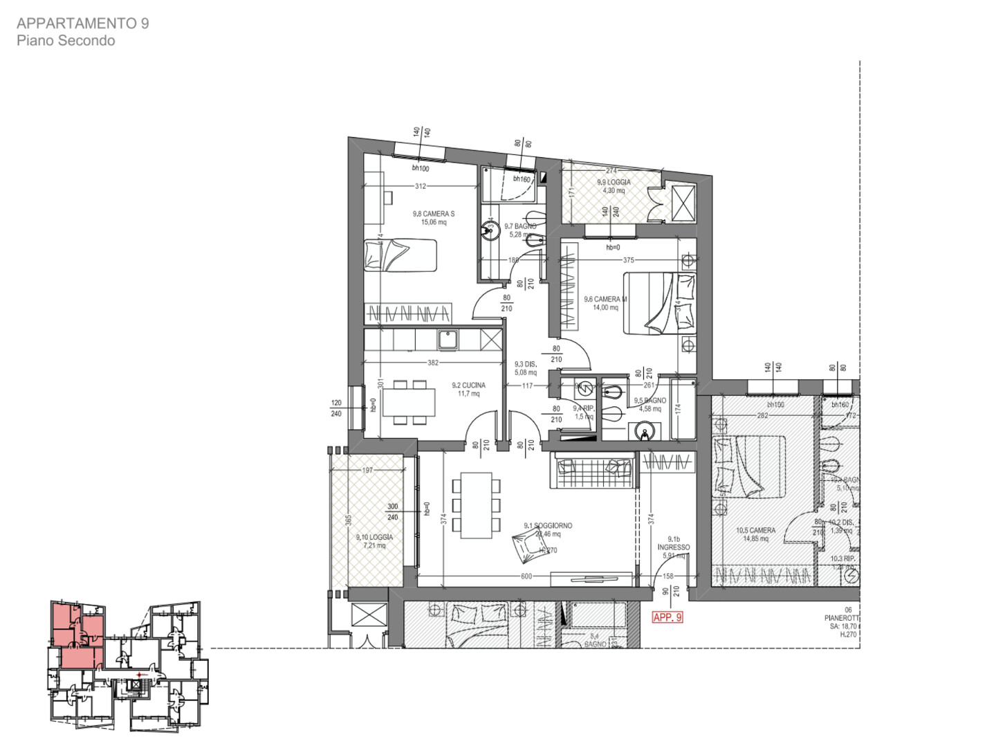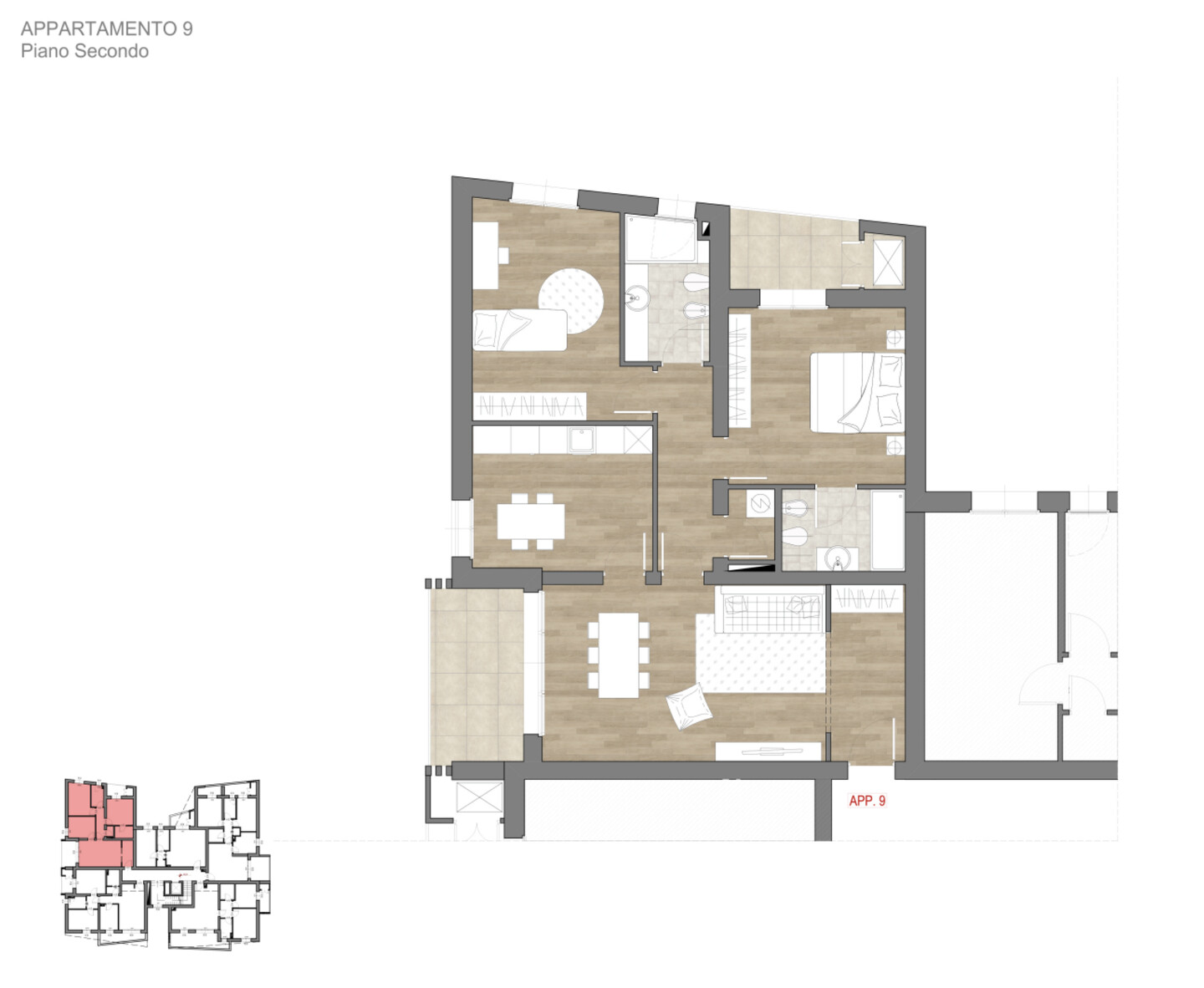 La soluzione proposta è un quadrilocale di circa 114 mq situato al 2° piano e caratterizzato dalla presenza di 2 terrazzi loggiati, che garantiscono luminosità e spazi esterni vivibili.
