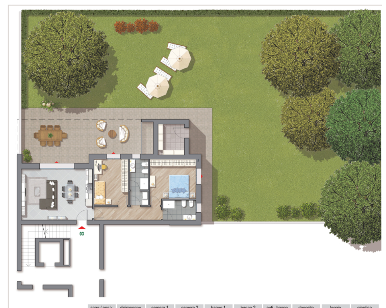 L’appartamento 3 al piano terra è composto da un ingresso su luminosa zona giorno con accesso alla funzionale loggia ed allo splendido giardino, cucina a vista, disimpegno zona notte, camera matrimoniale, una camera singola, antibagno e due bagni finestrati. L’intero appartamento affaccia sull’ampio giardino di proprietà esclusiva comprensivo di vano deposito. Possibilità di acquisto di autorimessa e posti auto a partire da € 15.000. Consegna Primavera 2027.