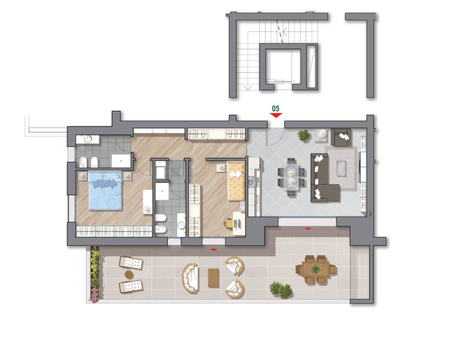 L’appartamento 5 al primo piano è composto da un ingresso su luminosa zona giorno con accesso alla funzionale loggia ed allo splendido terrazzo, cucina a vista, disimpegno zona notte, camera matrimoniale, una camera singola, antibagno e due bagni finestrati.