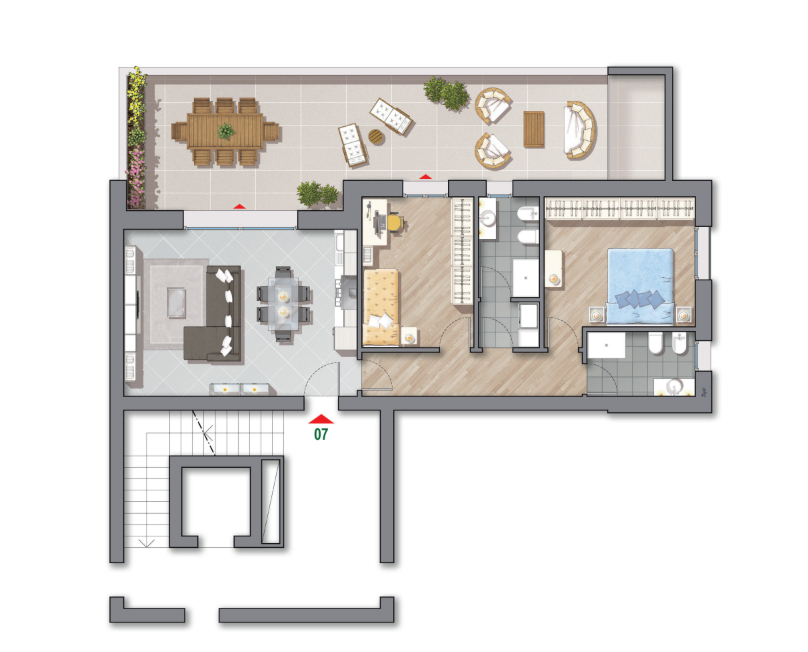 L’appartamento 7 al primo piano è composto da un ingresso su luminosa zona giorno con accesso alla splendida terrazza e cucina a vista, disimpegno zona notte, camera matrimoniale, una camera singola, antibagno e due bagni finestrati.
