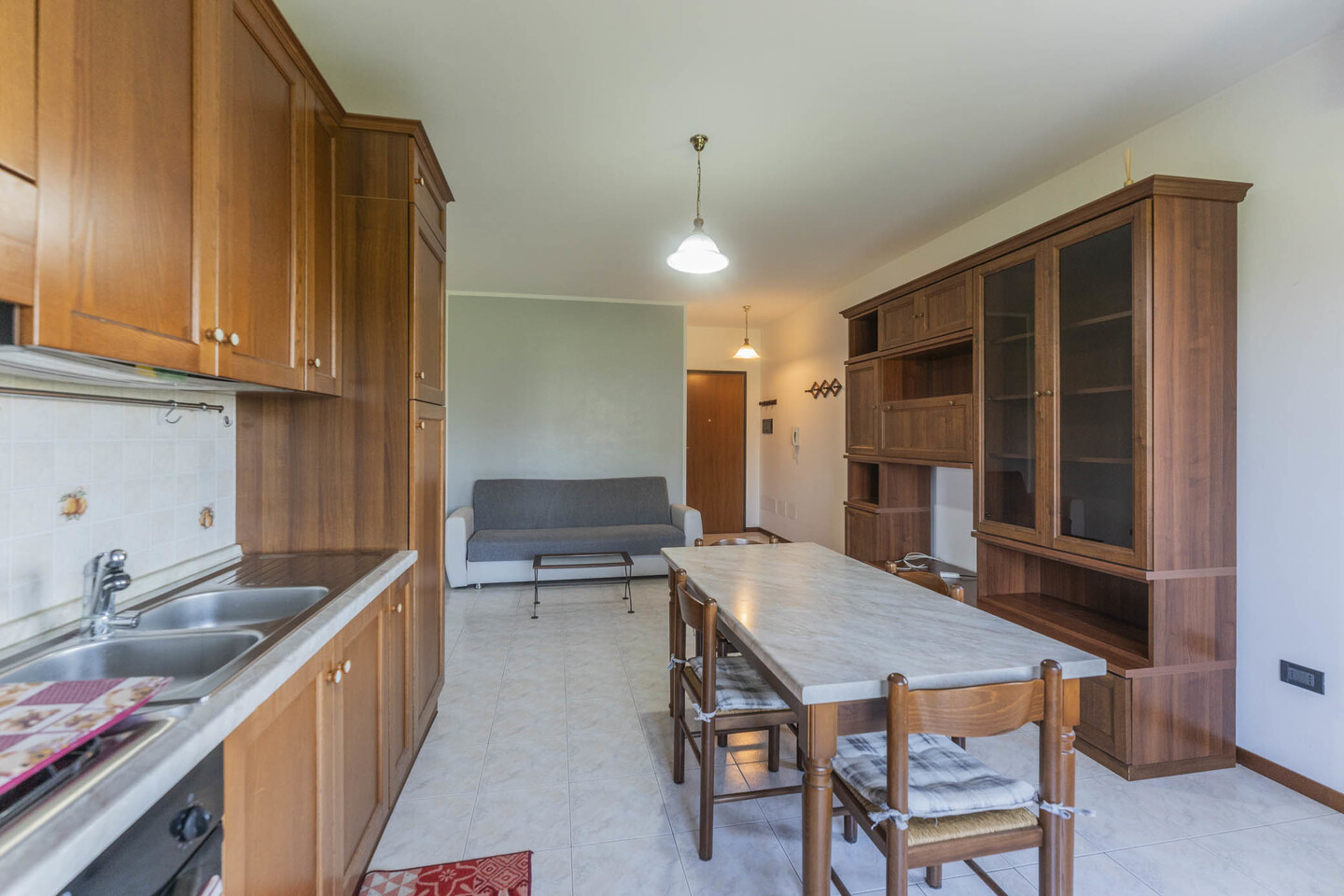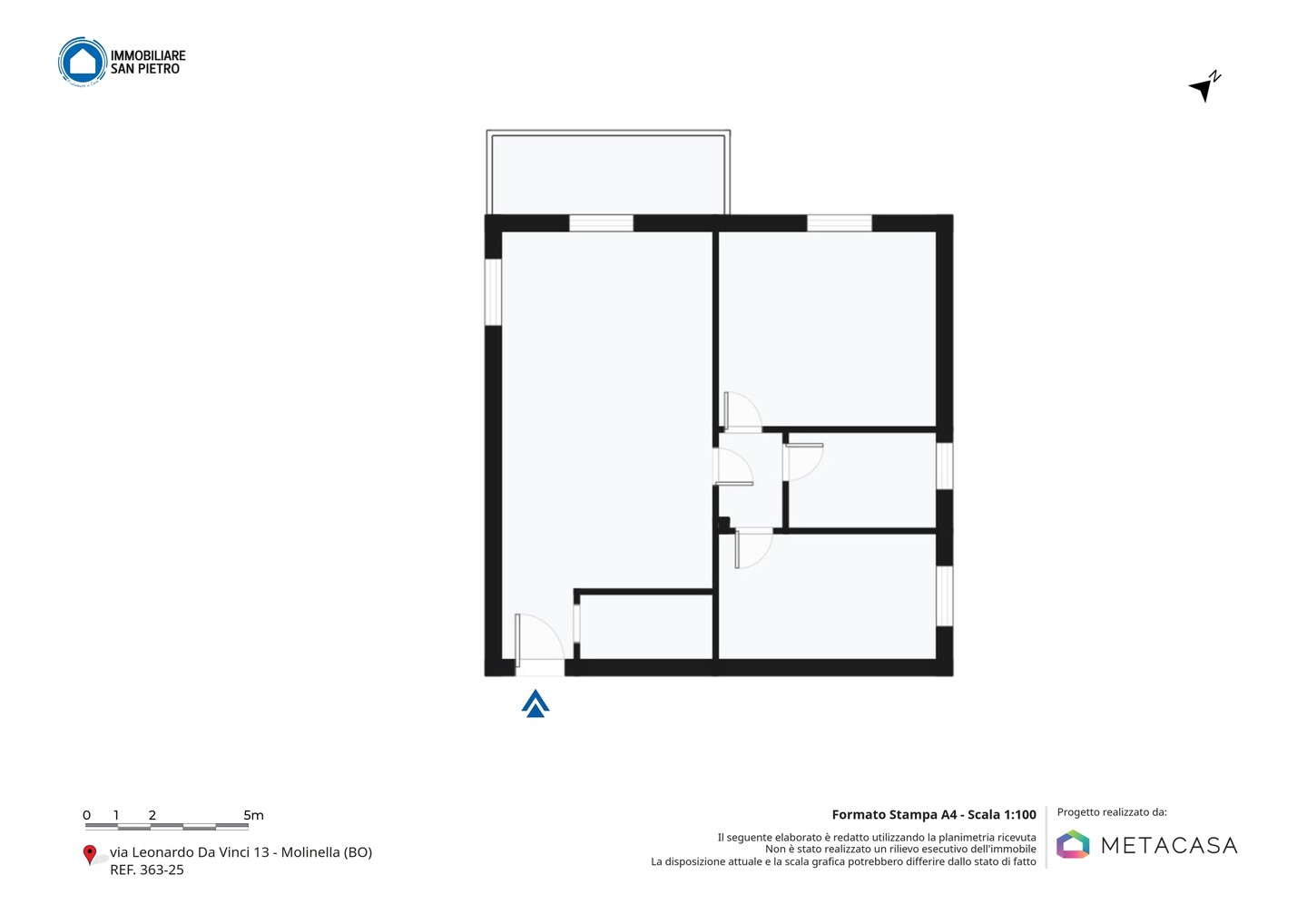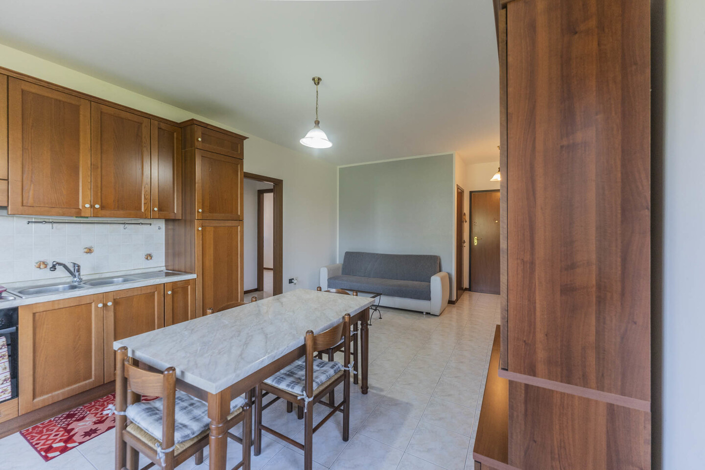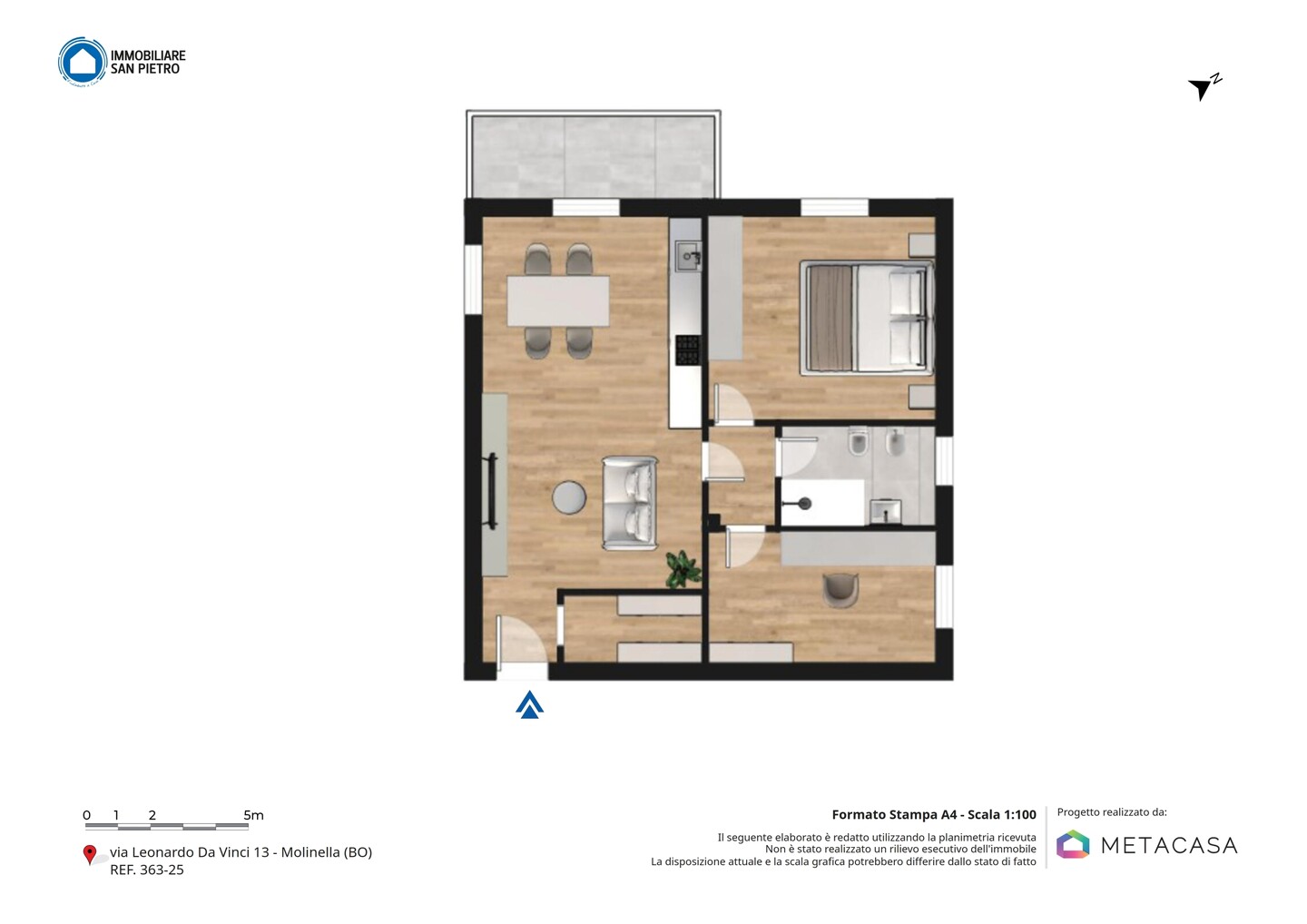L’immobile è situato al primo piano e così composto: ingresso su soggiorno con angolo cottura (dal quale è possibile accedere direttamente al terrazzo), un disimpegno notte divide una camera matrimoniale, una camera studio e un bagno.