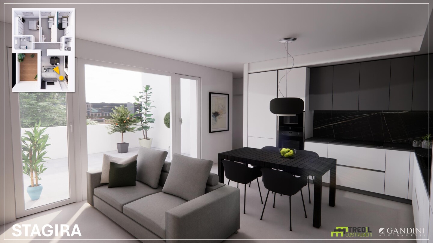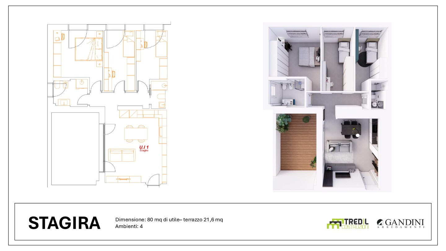 L’edificio è realizzato tramite un’iniziativa ERS: possono essere acquistati esclusivamente da nuclei con ISEE inferiore a € 40.000 e non potranno essere rivenduti prima di 30 anni dalla data di acquisto, secondo quanto previsto dalla convenzione. La tipologia STAGIRA proposta è la perfetta soluzione per vivere comodamente rispettando spazi e necessità di genitori e figli. Si tratta di un quadrilocale di 121 mq posto al 1° piano servito da ascensore, caratterizzato da ambienti ampi, ben distribuiti e luminosi grazie anche alla generosa terrazza di 21 mq, ideale per pranzi all’aperto e momenti di relax. L’ingresso si apre sul soggiorno di circa 29 mq con angolo cottura, valorizzato da un’ampia porta-finestra vetrata che garantisce sempre luce e accesso diretto al terrazzo. La zona notte, ben separata, comprende 1 camera matrimoniale, 2 camere singole e 2 bagni entrambi con doccia. Completano la proprietà un garage singolo al piano terra e un posto auto esterno.