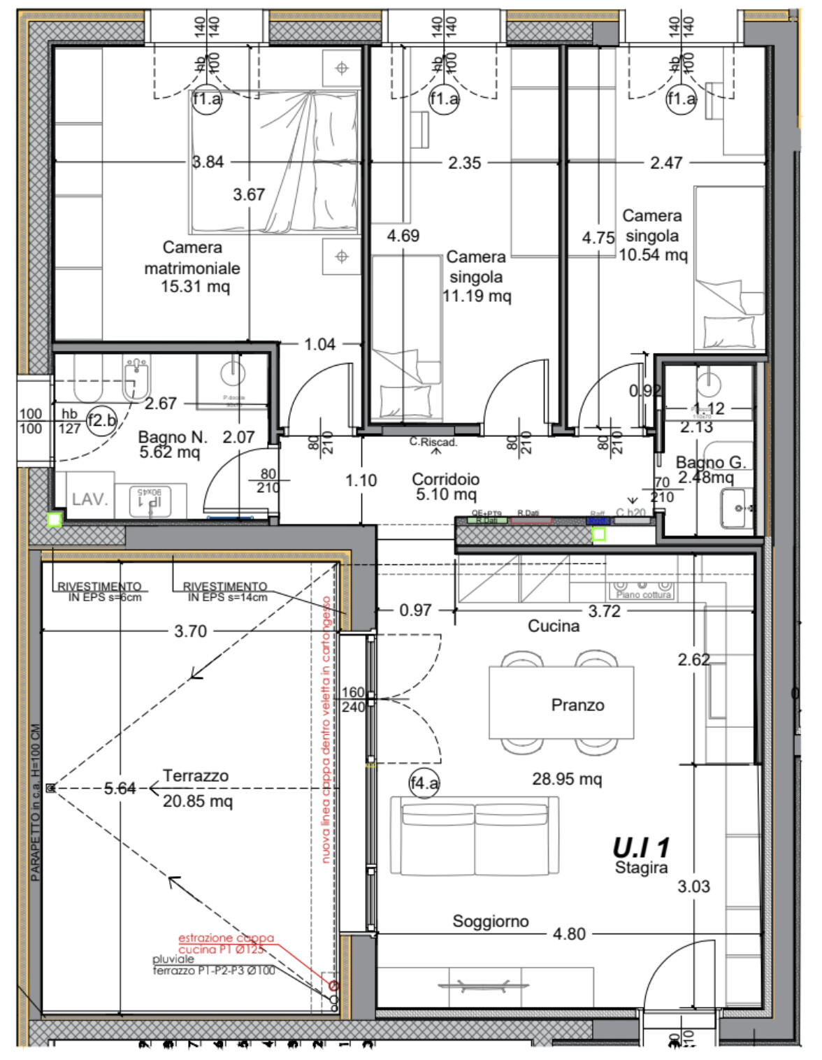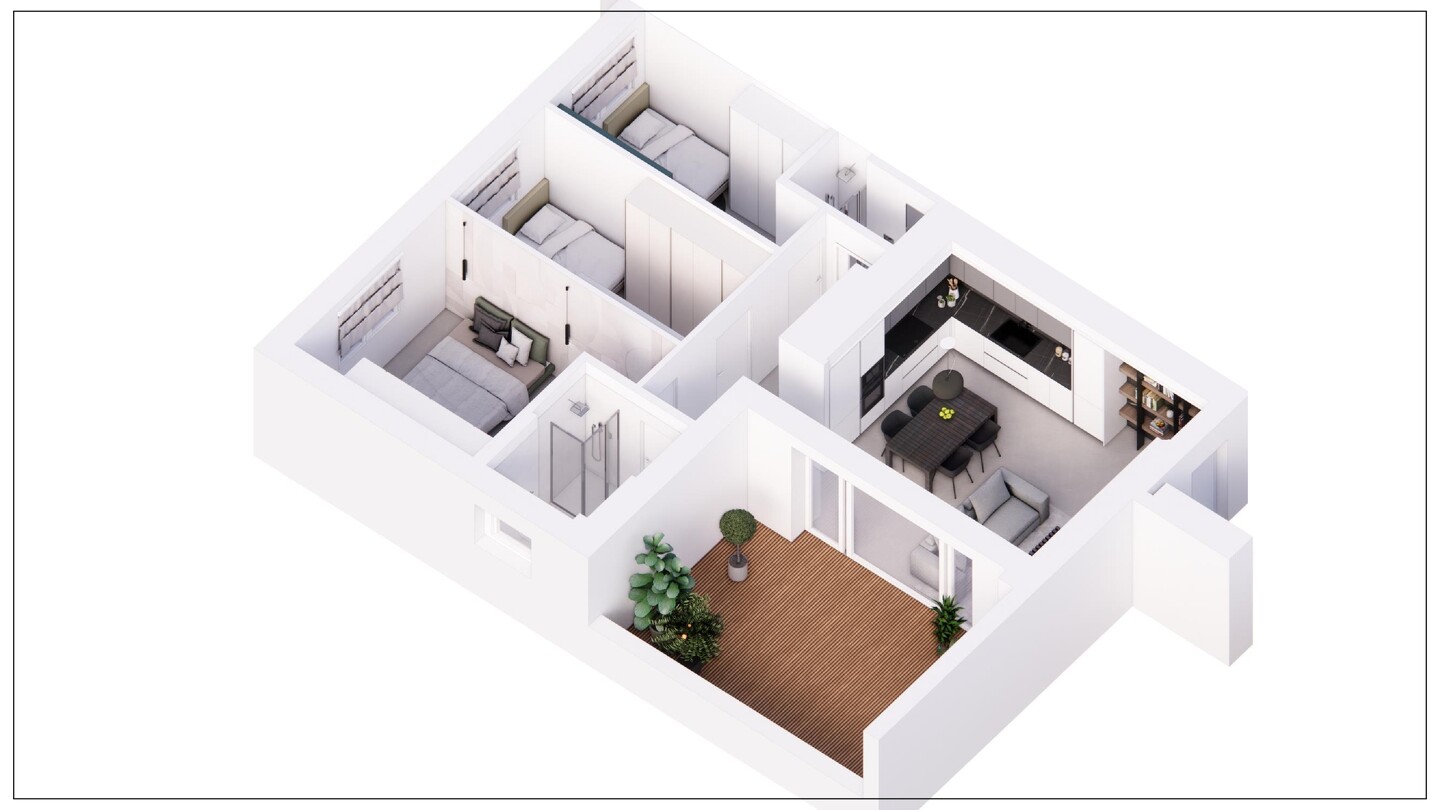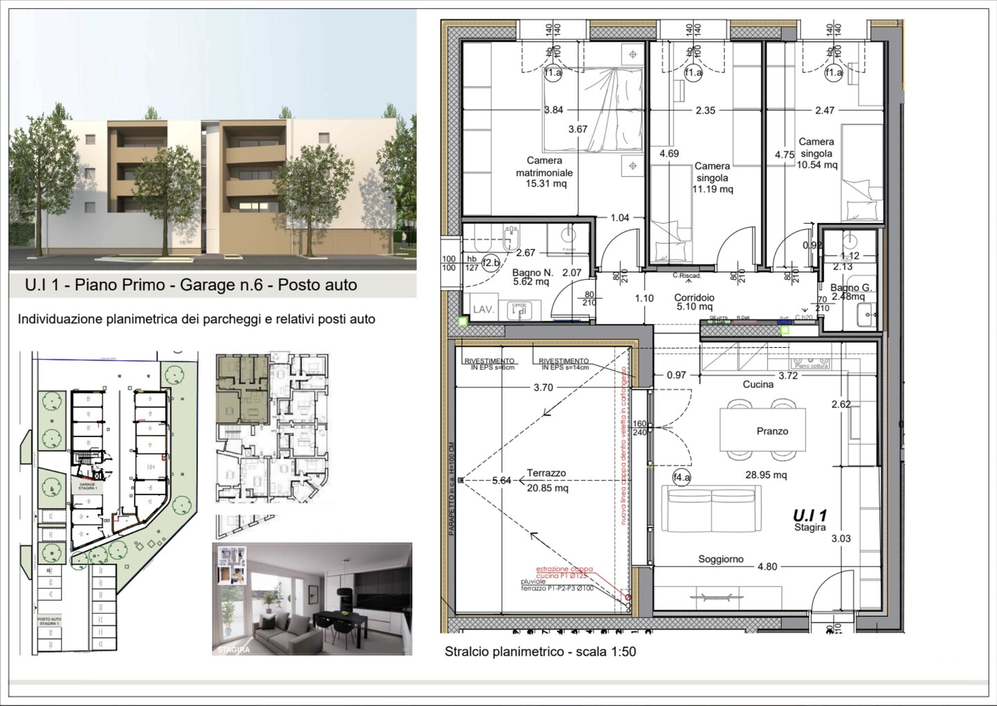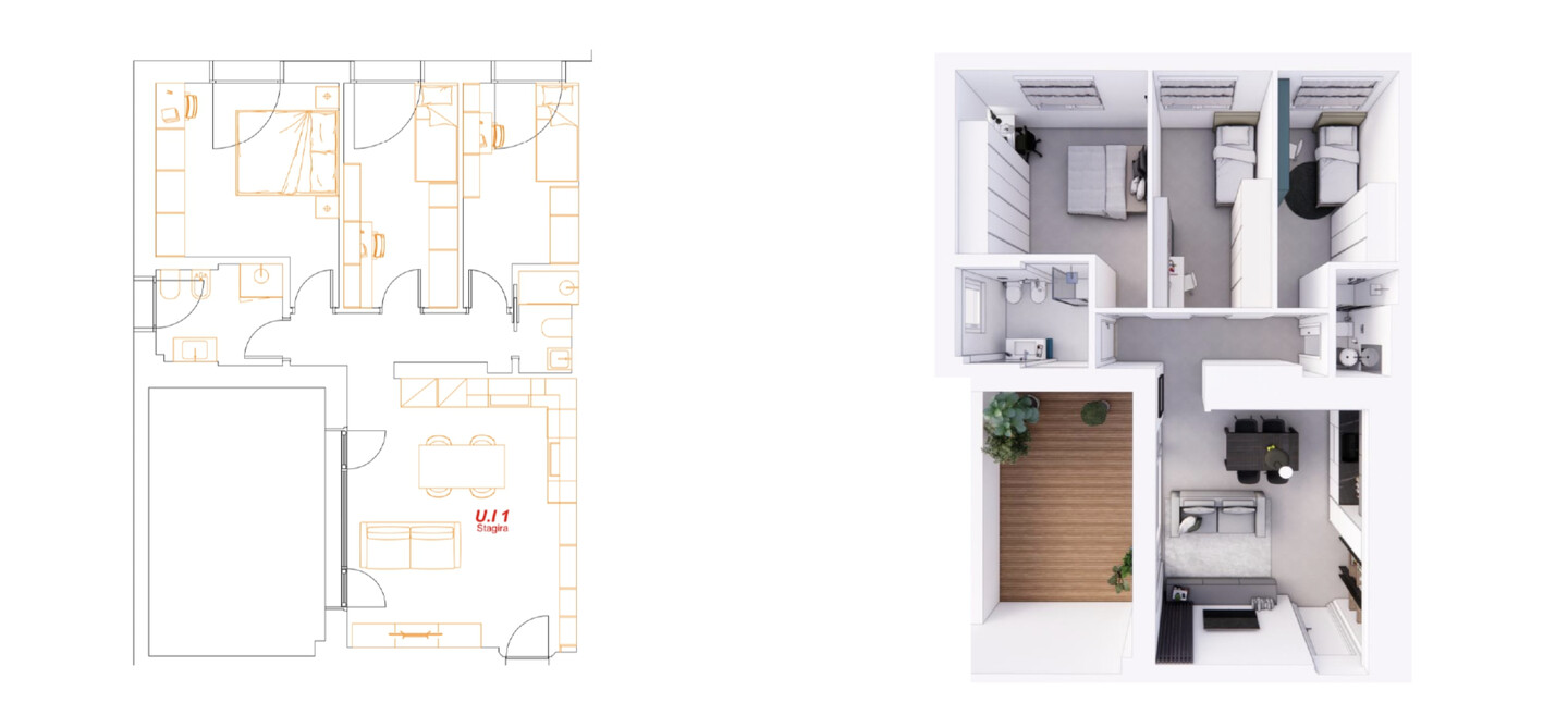 La tipologia STAGIRA proposta è la perfetta soluzione per vivere comodamente rispettando spazi e necessità di genitori e figli. Si tratta di un quadrilocale di 119 mq posto al 1° piano servito da ascensore, caratterizzato da ambienti ampi, ben distribuiti e luminosi grazie anche alla generosa terrazza di 21 mq, ideale per pranzi all’aperto e momenti di relax. L’ingresso si apre sul soggiorno di circa 29 mq con angolo cottura, valorizzato da un’ampia porta-finestra vetrata che garantisce sempre luce e accesso diretto al terrazzo. La zona notte, ben separata, comprende 1 camera matrimoniale, 2 camere singole e 2 bagni entrambi con doccia. Completano la proprietà un garage singolo al piano terra e un posto auto esterno.