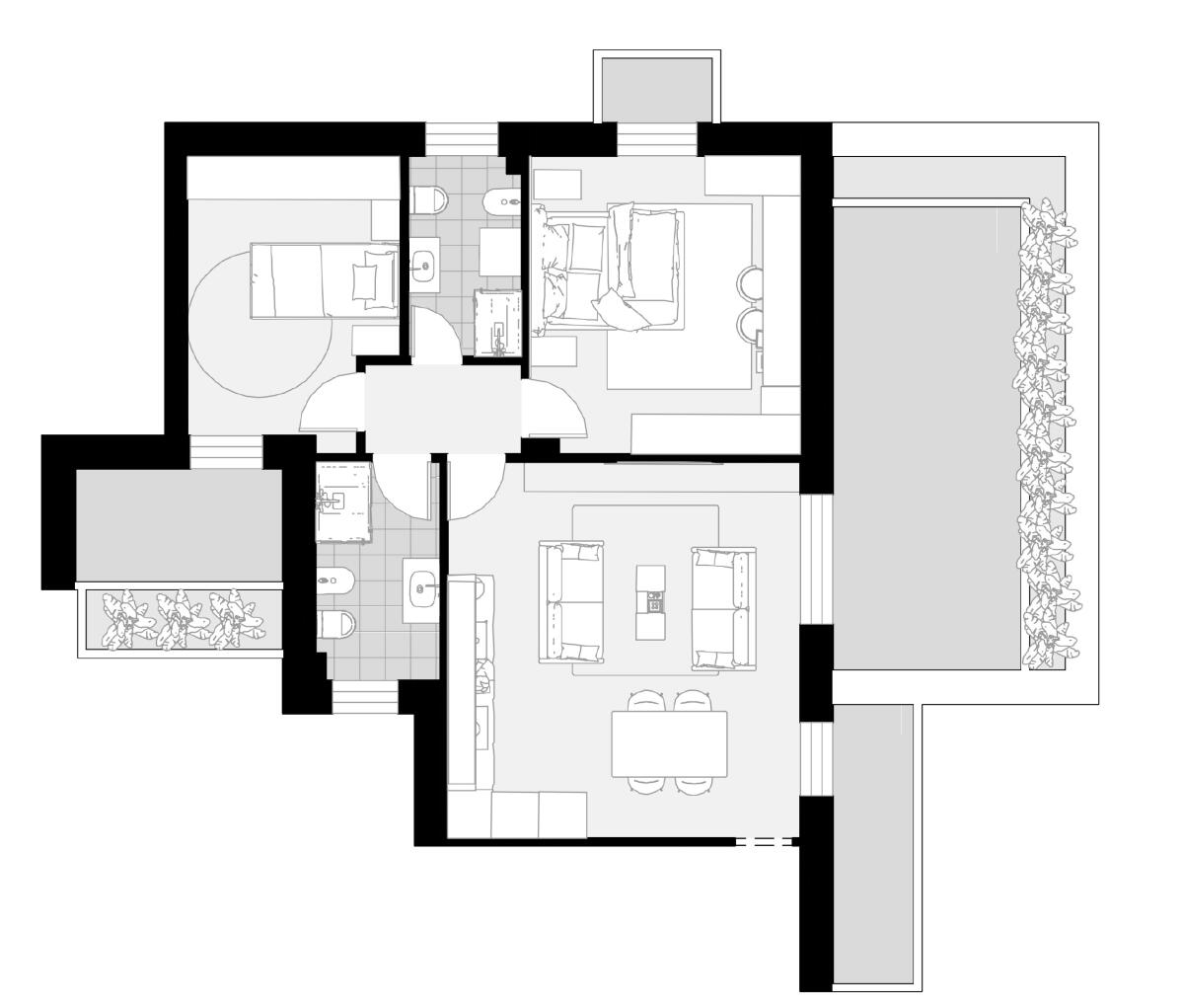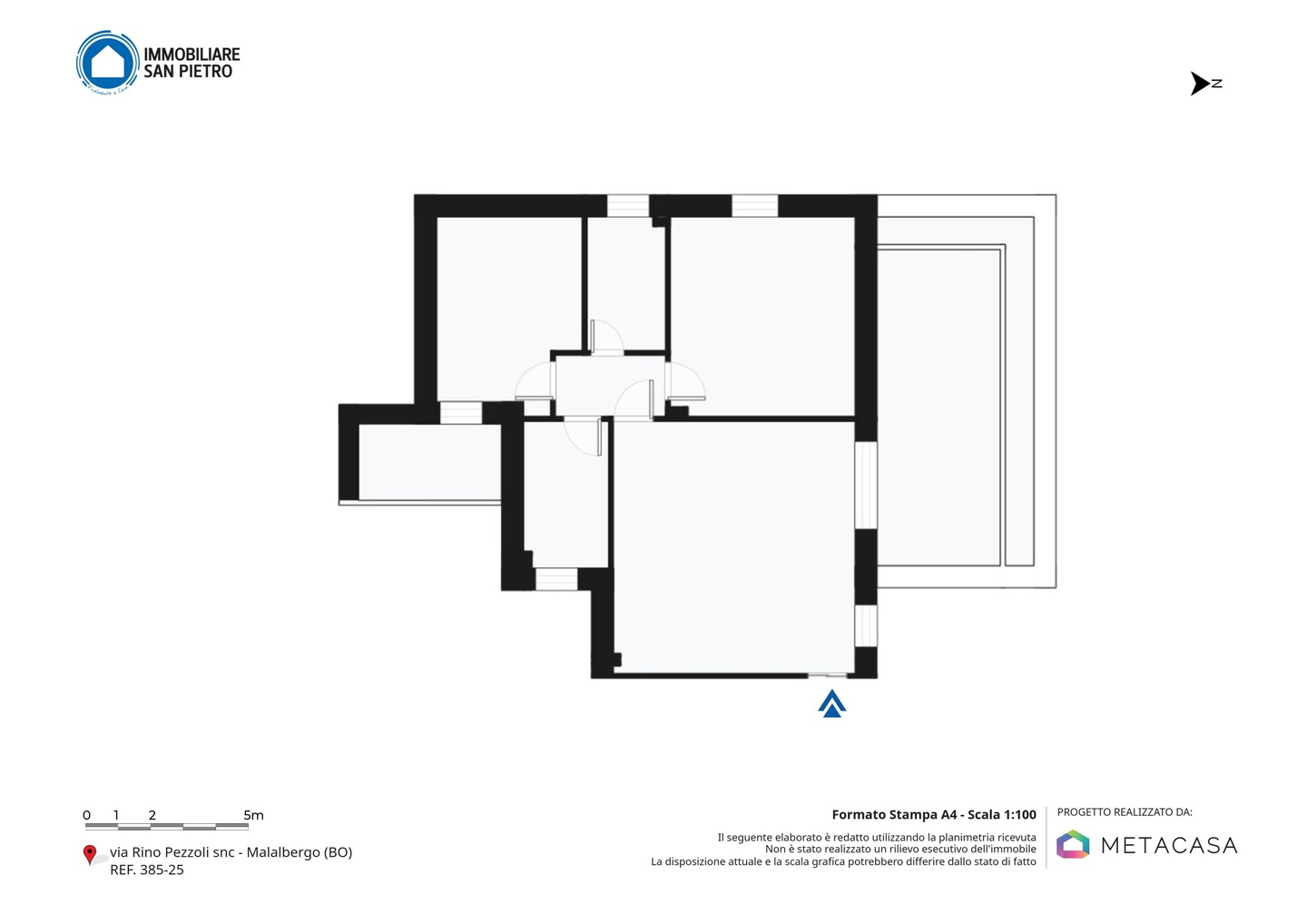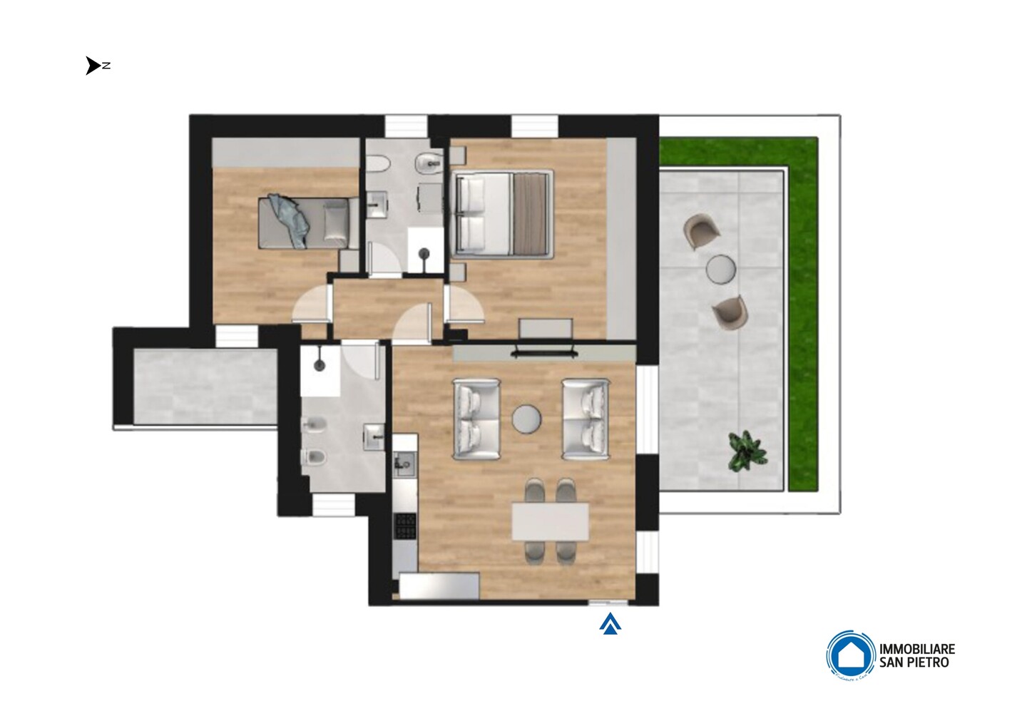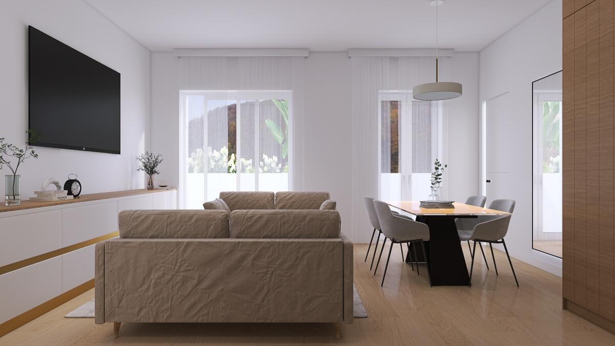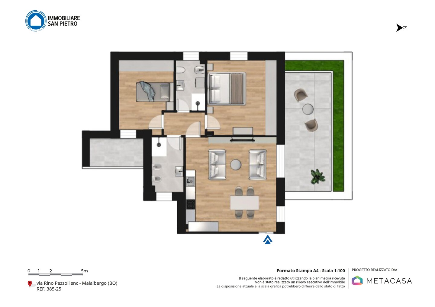 Appartamento trilocale con ingresso al piano terra condiviso con un’altra delle abitazioni presenti nella struttura, sviluppato al primo piano e con esposizione su due lati. Si compone di soggiorno con angolo cottura (dai quali è possibile accedere direttamente al terrazzo), zona notte caratterizzata da una camera matrimoniale, una singola (con accesso diretto al balcone) e 2 bagni. La proprietà include anche un comodo garage, una cantina (adibita a vano tecnico) e un giardino privato, che rappresenta uno spazio esclusivo dove poter trascorrere del tempo all’aperto in totale tranquillità.