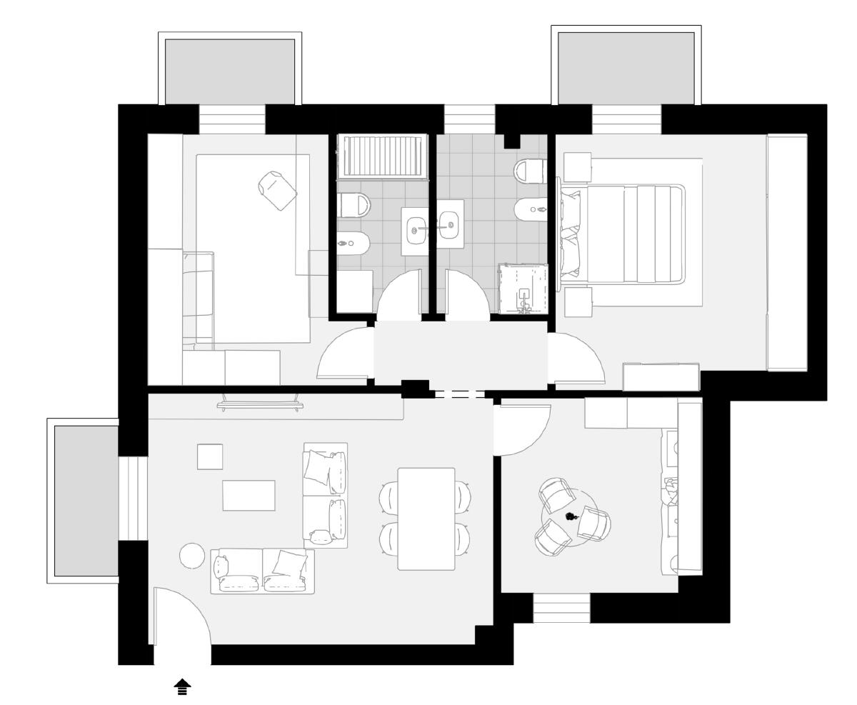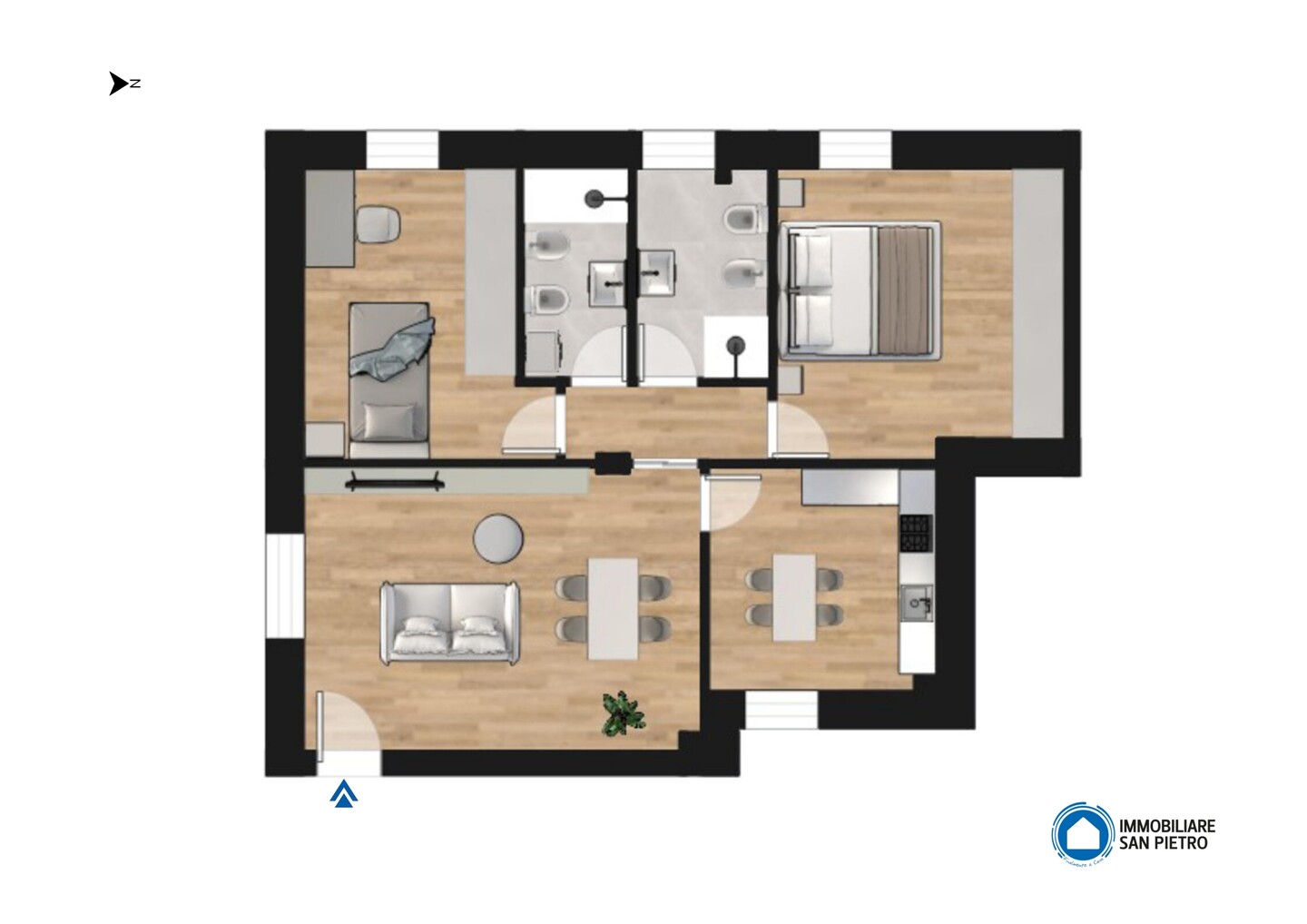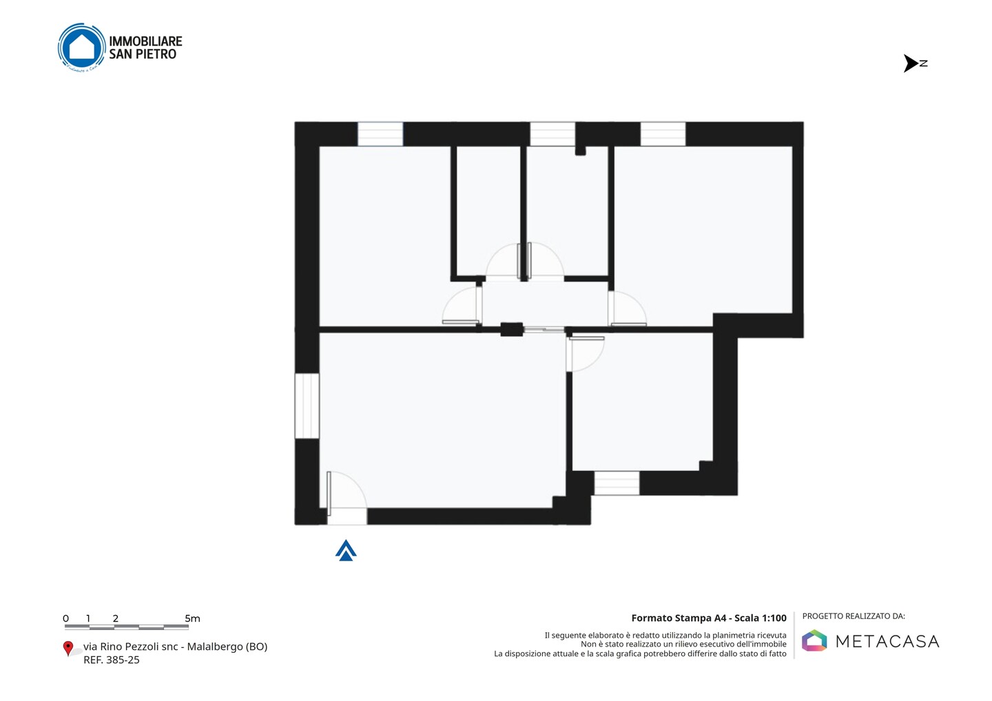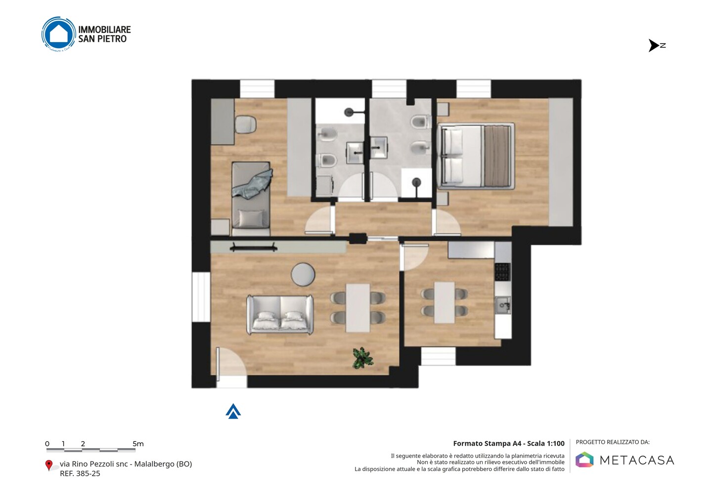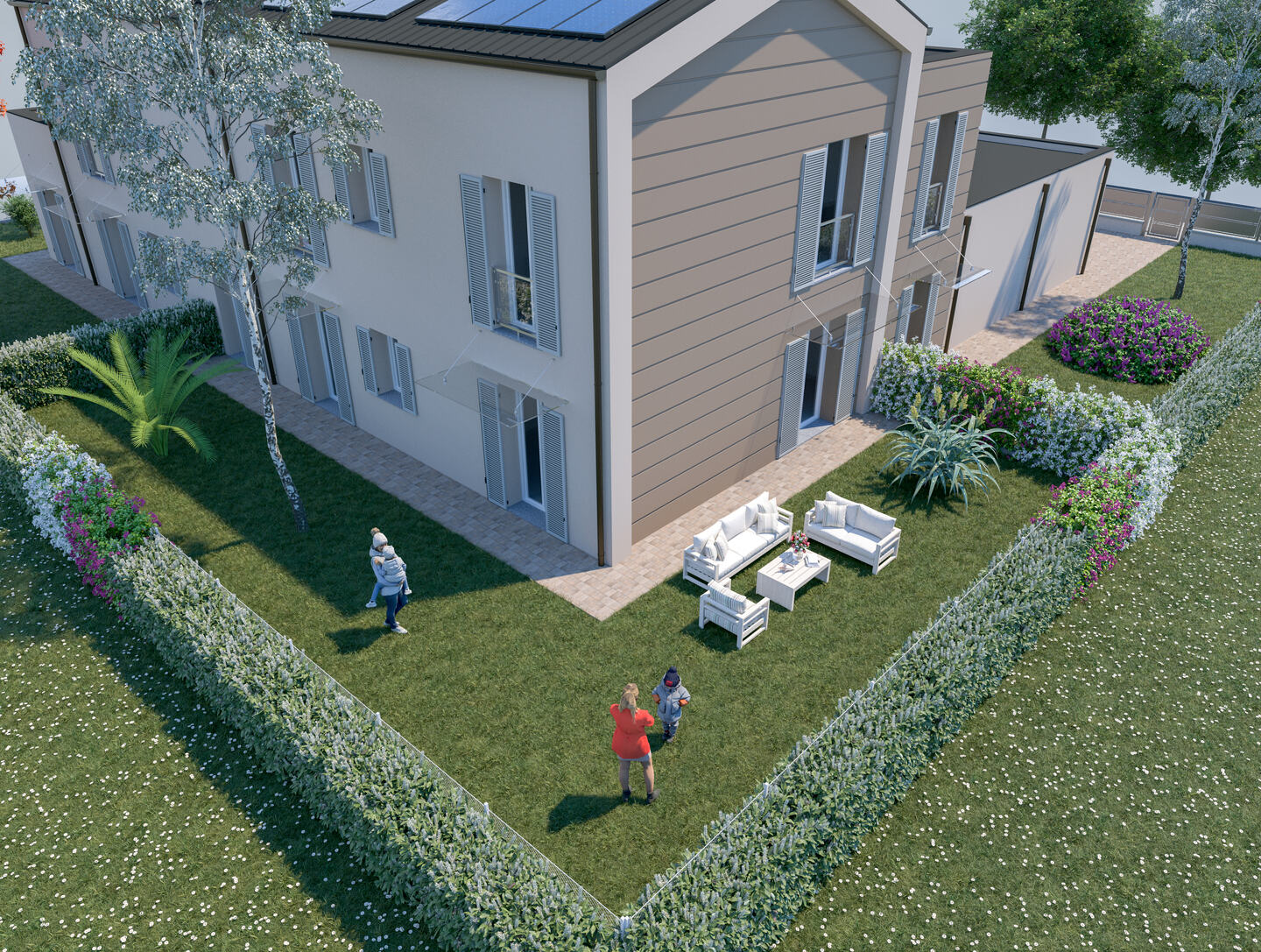 Appartamento quadrilocale con ingresso indipendente al piano terra per garantire la massima privacy, sviluppato al primo piano e con esposizione su tutti e quattro i lati. Si compone di soggiorno e cucina abitabile; la zona notte è composta da una camera matrimoniale, una doppia e 2 bagni. La proprietà include anche un comodo garage, una cantina (adibita a vano tecnico) e un giardino privato, che rappresenta uno spazio esclusivo dove poter trascorrere del tempo all’aperto in totale tranquillità.