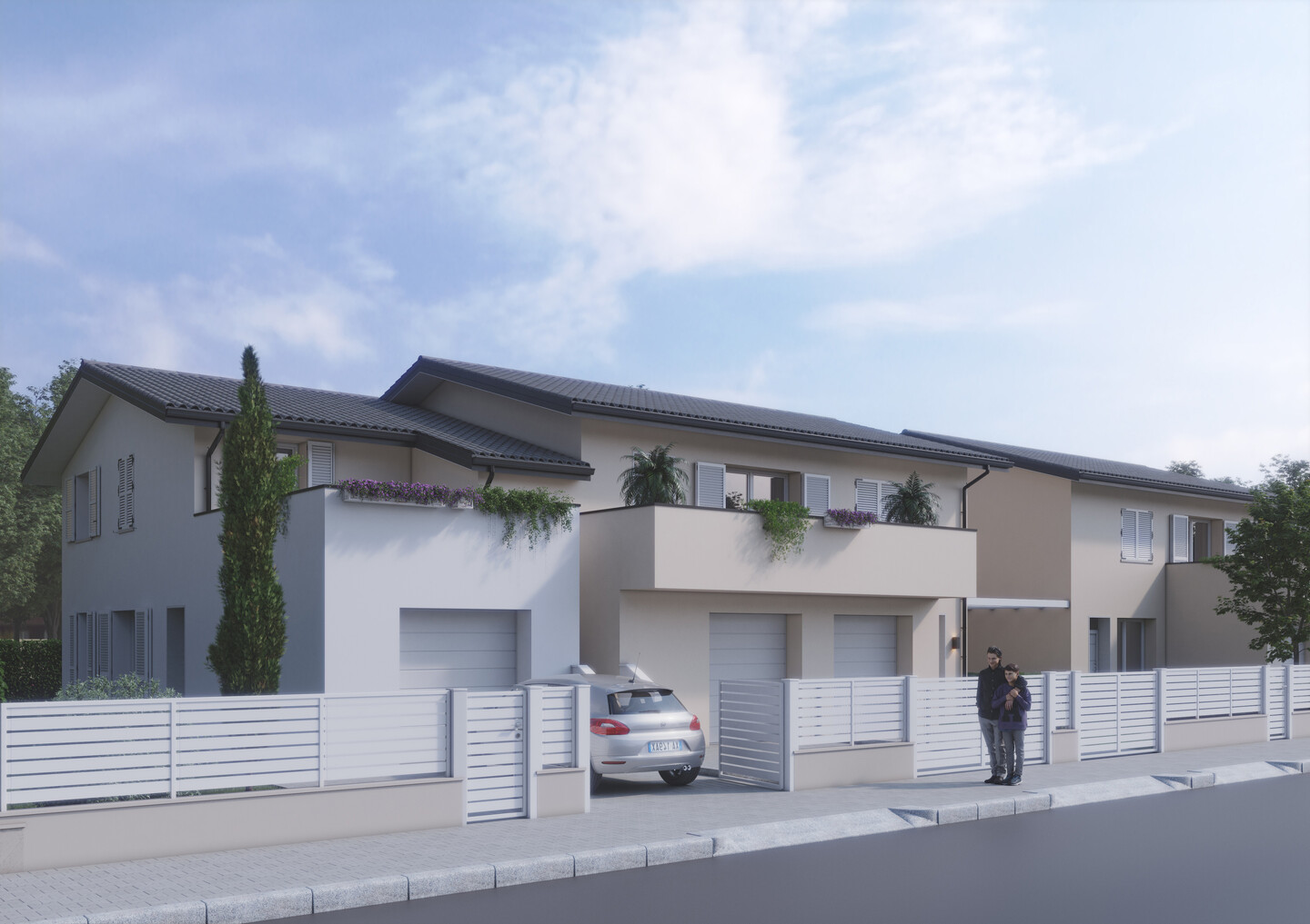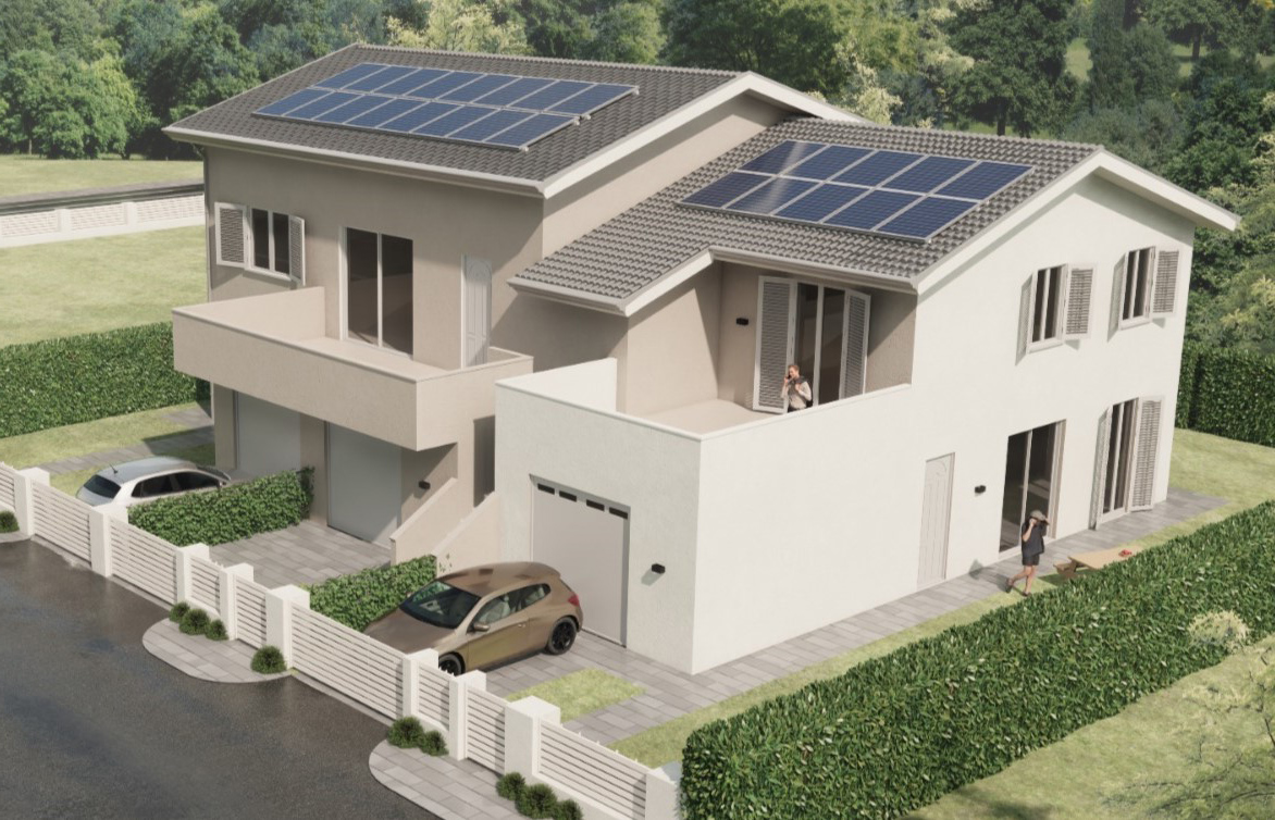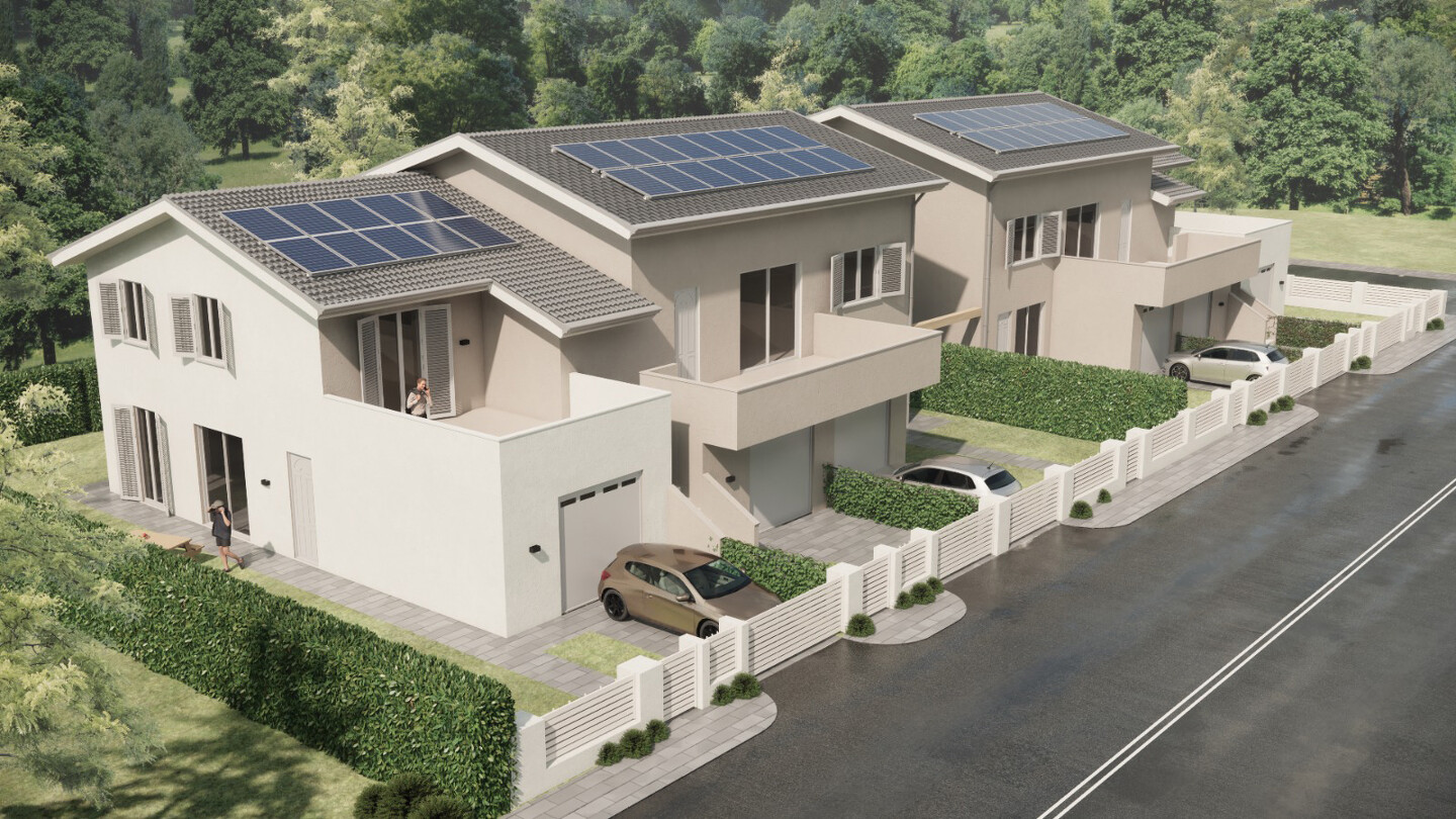 L’immobile (tip. B) è sviluppato interamente al piano terra, caratterizzato da ingresso indipendente e così composto: ingresso su sala con cucina a vista e affaccio sul giardino esclusivo di mq 180, disimpegno zona notte con 2 camere (una matrimoniale e una singola) e un bagno. Completano la proprietà la spaziosa autorimessa, con accesso collegato all’abitazione e la cantina. Oltre all’immobile in oggetto, la villa è composta da una porzione cielo terra con giardino e un attico con terrazza abitabile, tutti con ingresso indipendente ed è stata pensata per unire il massimo risparmio energetico, con tecnologie moderne, impianto fotovoltaico e minimi costi di gestione con classe energetica A4. L’ottimo capitolato con ampia scelta di finiture permettono di poter personalizzare l’immobile in base ai propri gusti ed esigenze.
