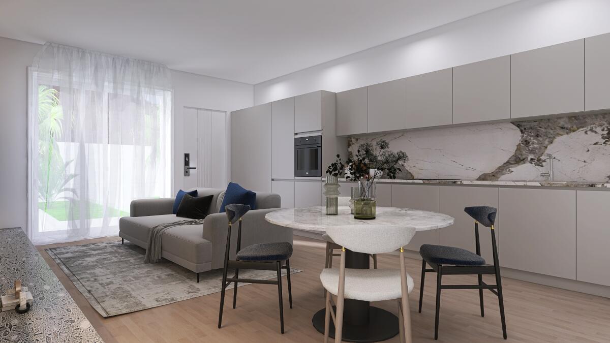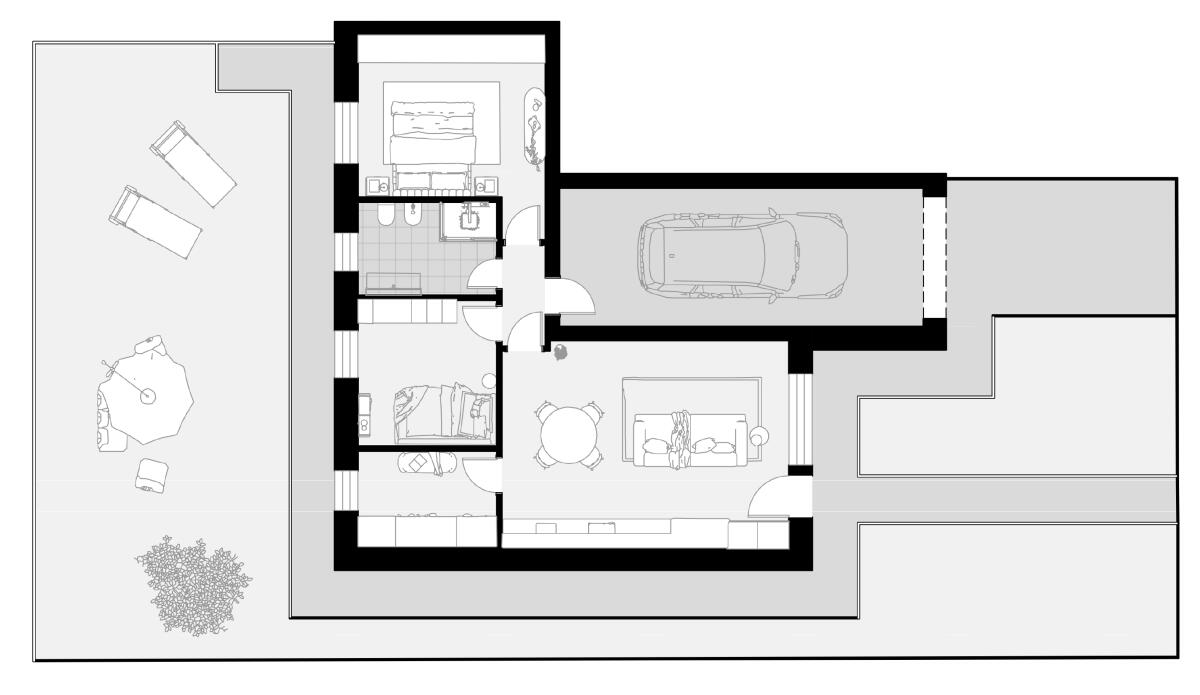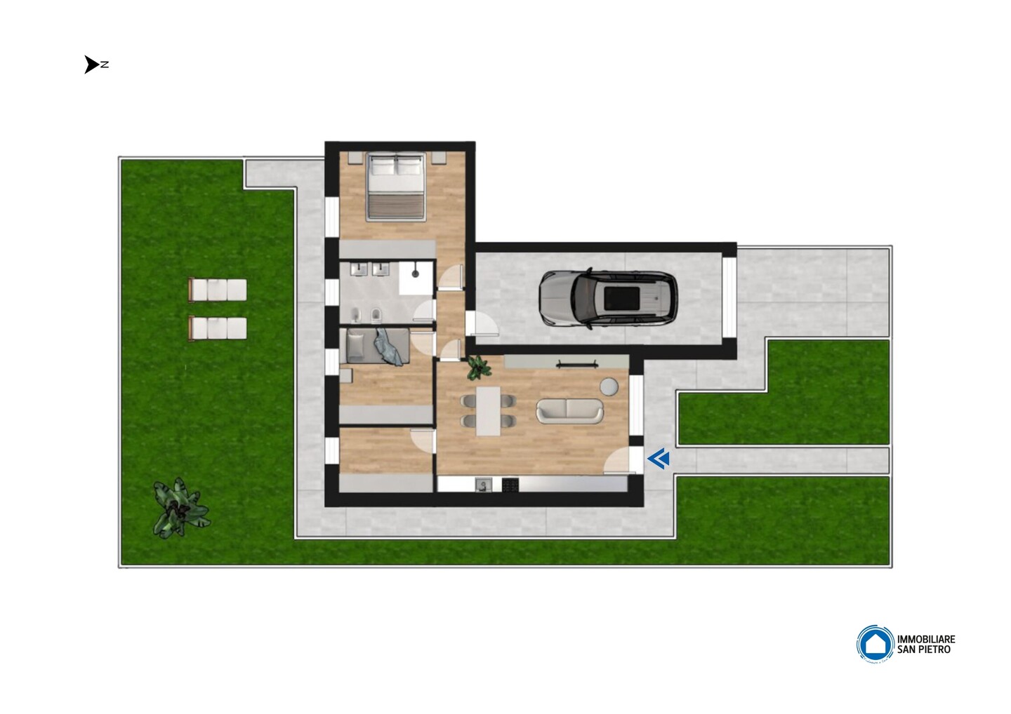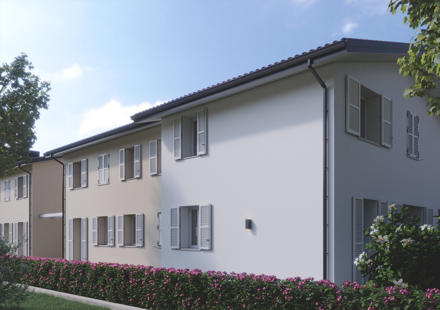 L’immobile (tip. B) è sviluppato interamente al piano terra, caratterizzato da ingresso indipendente e così composto: ingresso su sala con cucina a vista e affaccio sul giardino esclusivo di mq 180, disimpegno zona notte con 2 camere (una matrimoniale e una singola) e un bagno. Completano la proprietà la spaziosa autorimessa, con accesso collegato all’abitazione e la cantina. Oltre all’immobile in oggetto, la villa è composta da una porzione cielo terra con giardino e un attico con terrazza abitabile, tutti con ingresso indipendente ed è stata pensata per unire il massimo risparmio energetico, con tecnologie moderne, impianto fotovoltaico e minimi costi di gestione con classe energetica A4. L’ottimo capitolato con ampia scelta di finiture permettono di poter personalizzare l’immobile in base ai propri gusti ed esigenze.
