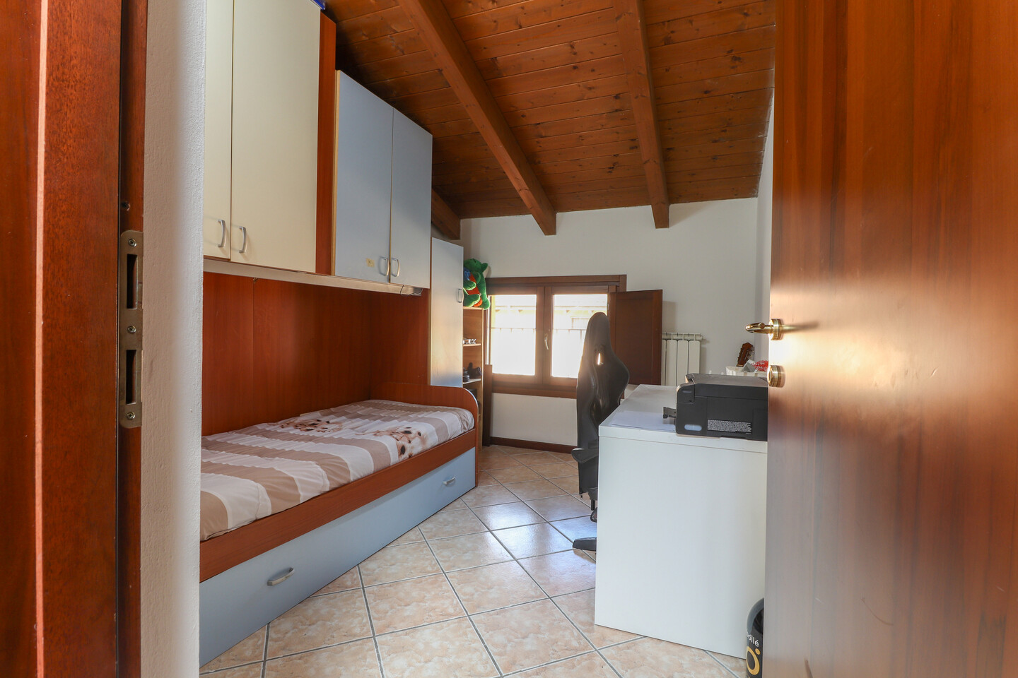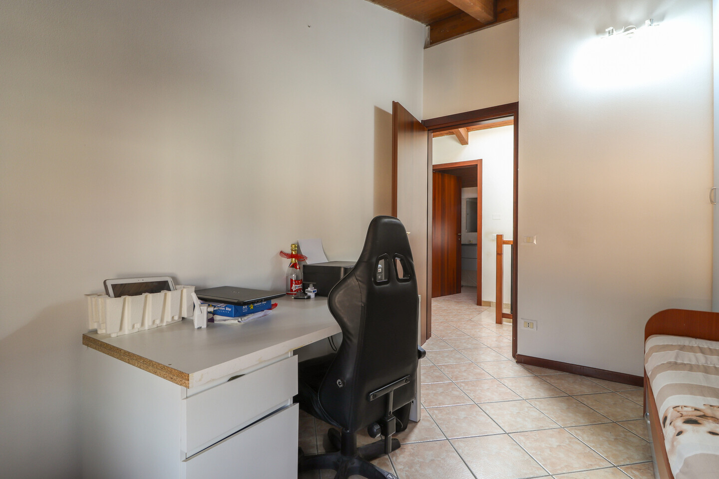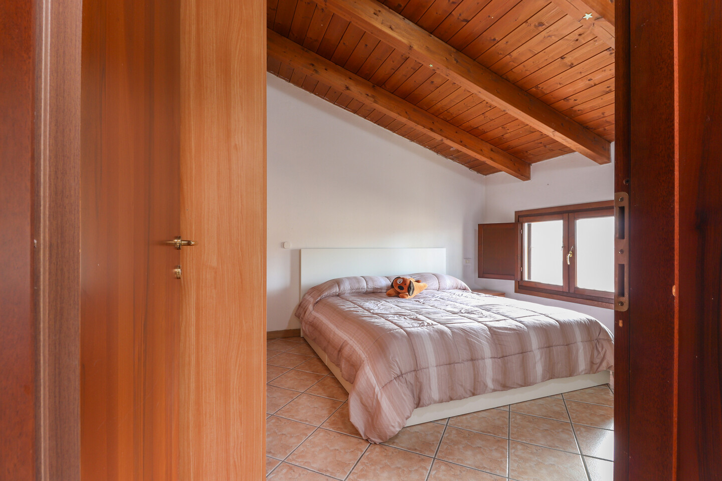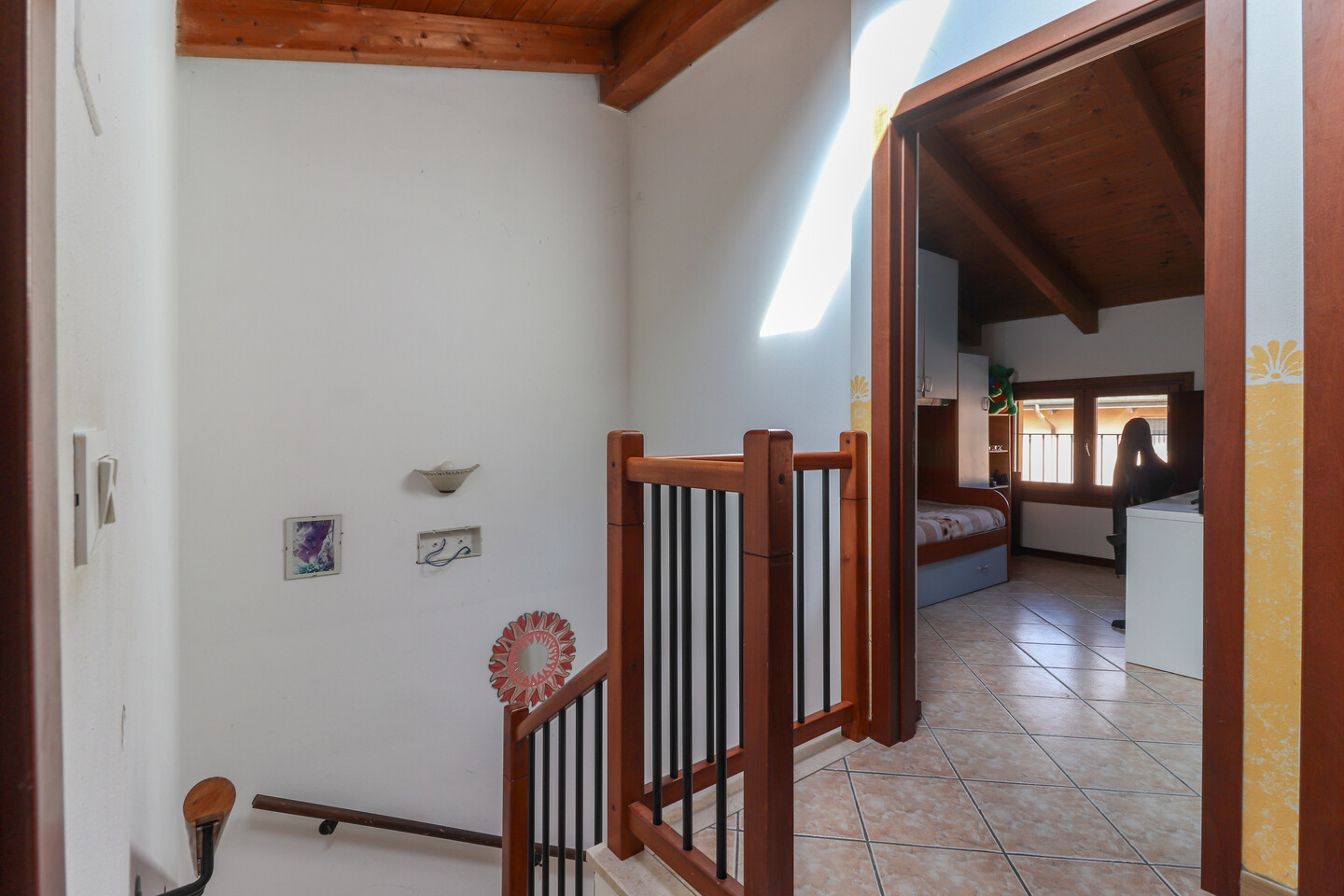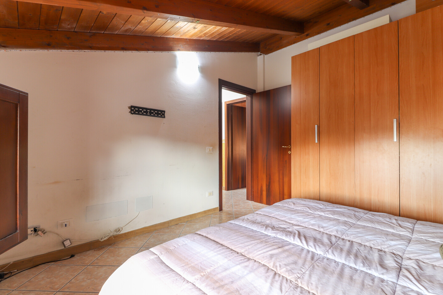 Porzione di casa sviluppata su due livelli; Ingresso al piano primo tramite scala esterna su soggiorno, cucina abitabile, camera da letto e bagno; al piano superiore un sottotetto con ulteriori 3 camere e bagno. A completare la proprietà giardino privato e garage.