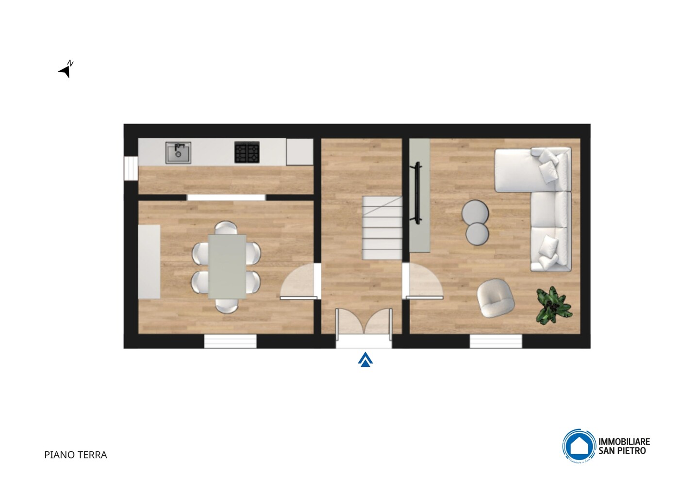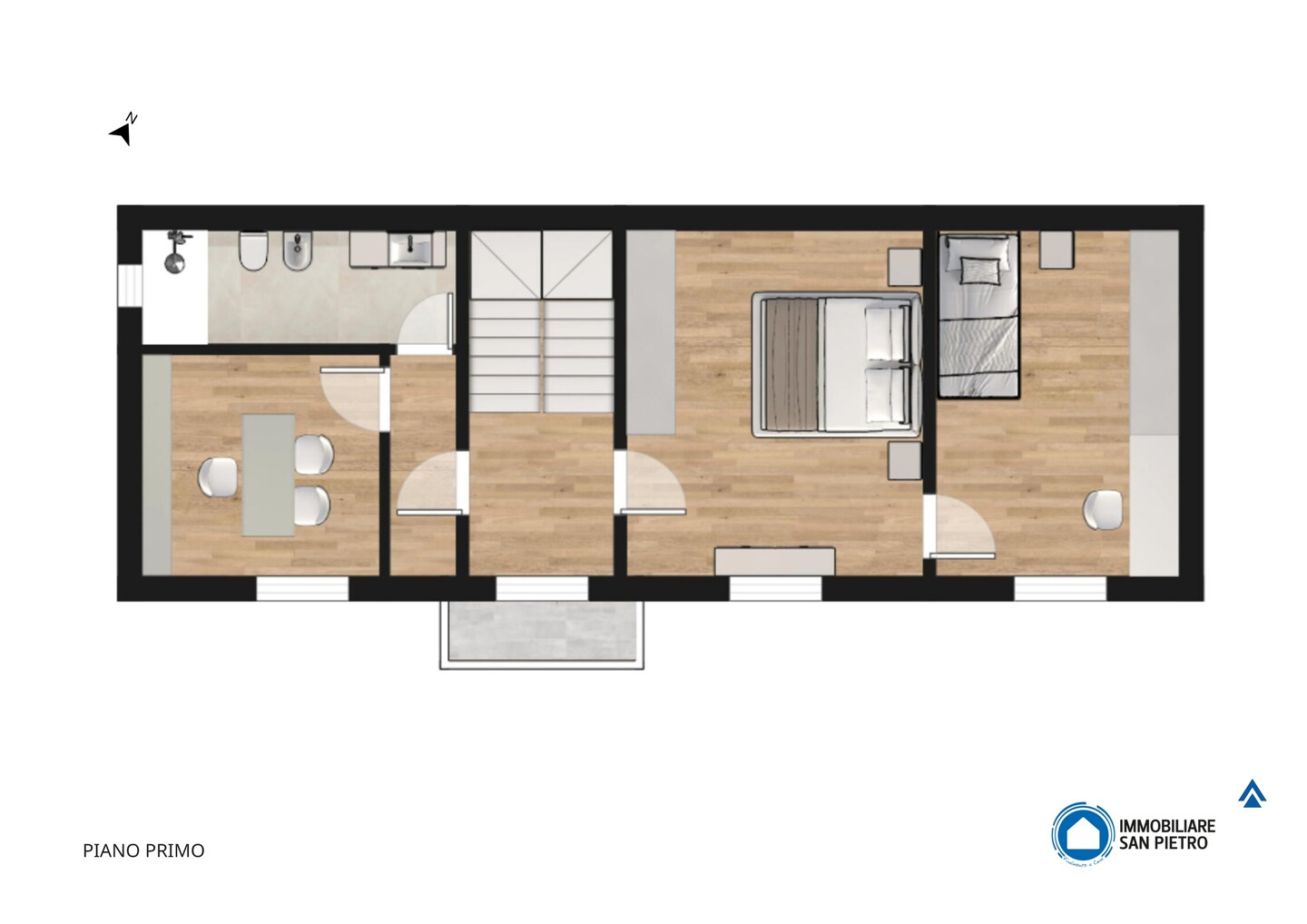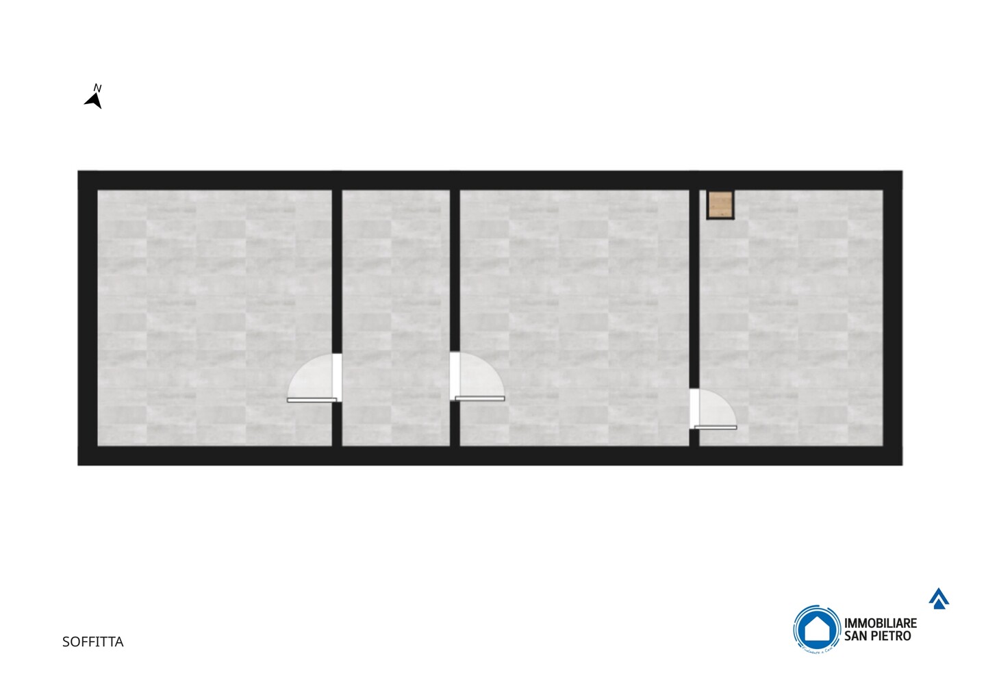L’immobile è disposto su 2 livelli e così composto: ingresso al piano terra su disimpegno arredabile, soggiorno e cucina abitabile. Una scala conduce al primo piano dove troviamo un disimpegno (dal quale è possibile accedere direttamente al balcone) che divide 2 camere matrimoniali, una singola e un bagno. Al terzo ed ultimo piano è presente la soffitta, al momento non accessibile. Completano la proprietà autorimessa e giardino privato.