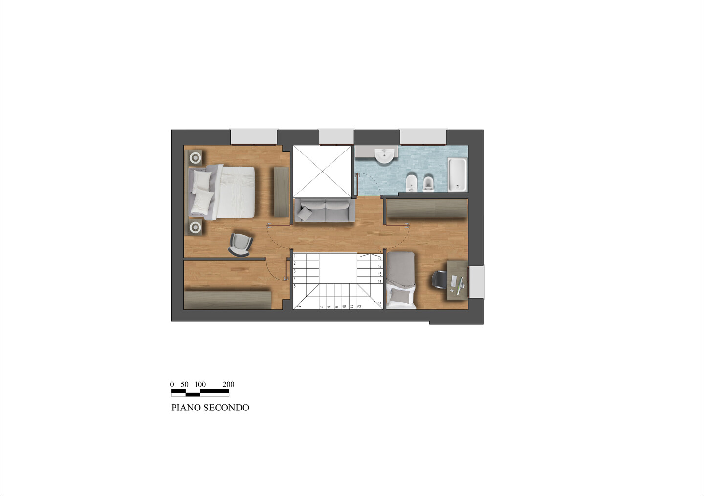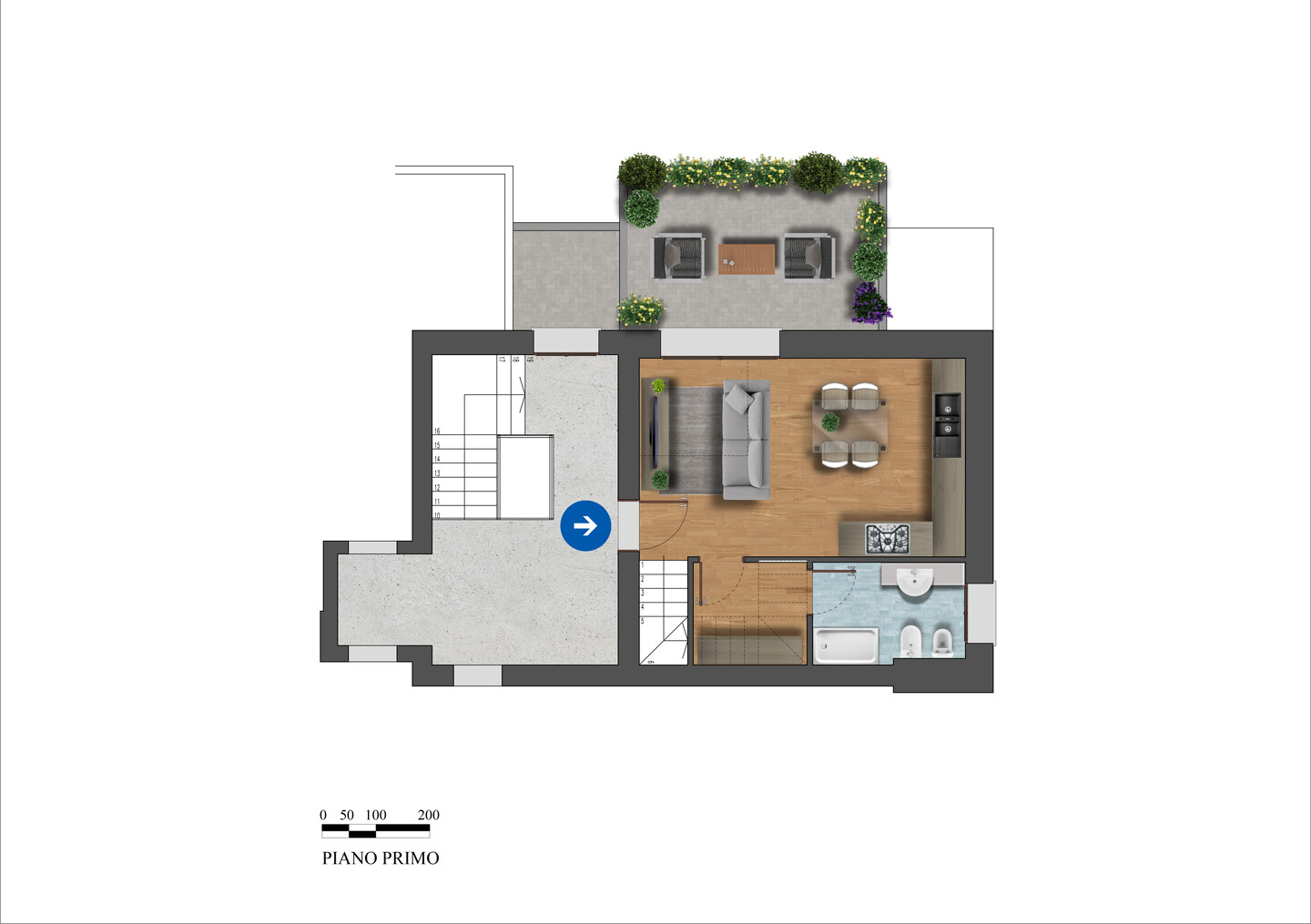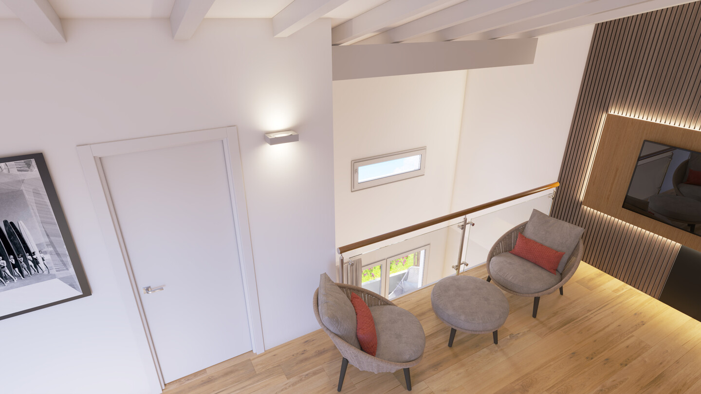 Appartamento (tip. 5) su due livelli, primo e secondo (nonché ultimo) con terrazzo abitabile. Al primo piano troviamo ingresso su sala con accesso diretto allo spazio esterno e un suggestivo doppio volume, perfetto per creare un’atmosfera accogliente, bagno finestrato e scala che conduce al secondo piano, nonché ultimo, dove troviamo camera da letto, cabina armadio e 2 vani sottotetto, uno dei quali ampio e arredabile come ulteriore camera o studio.