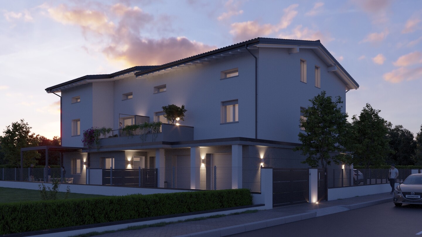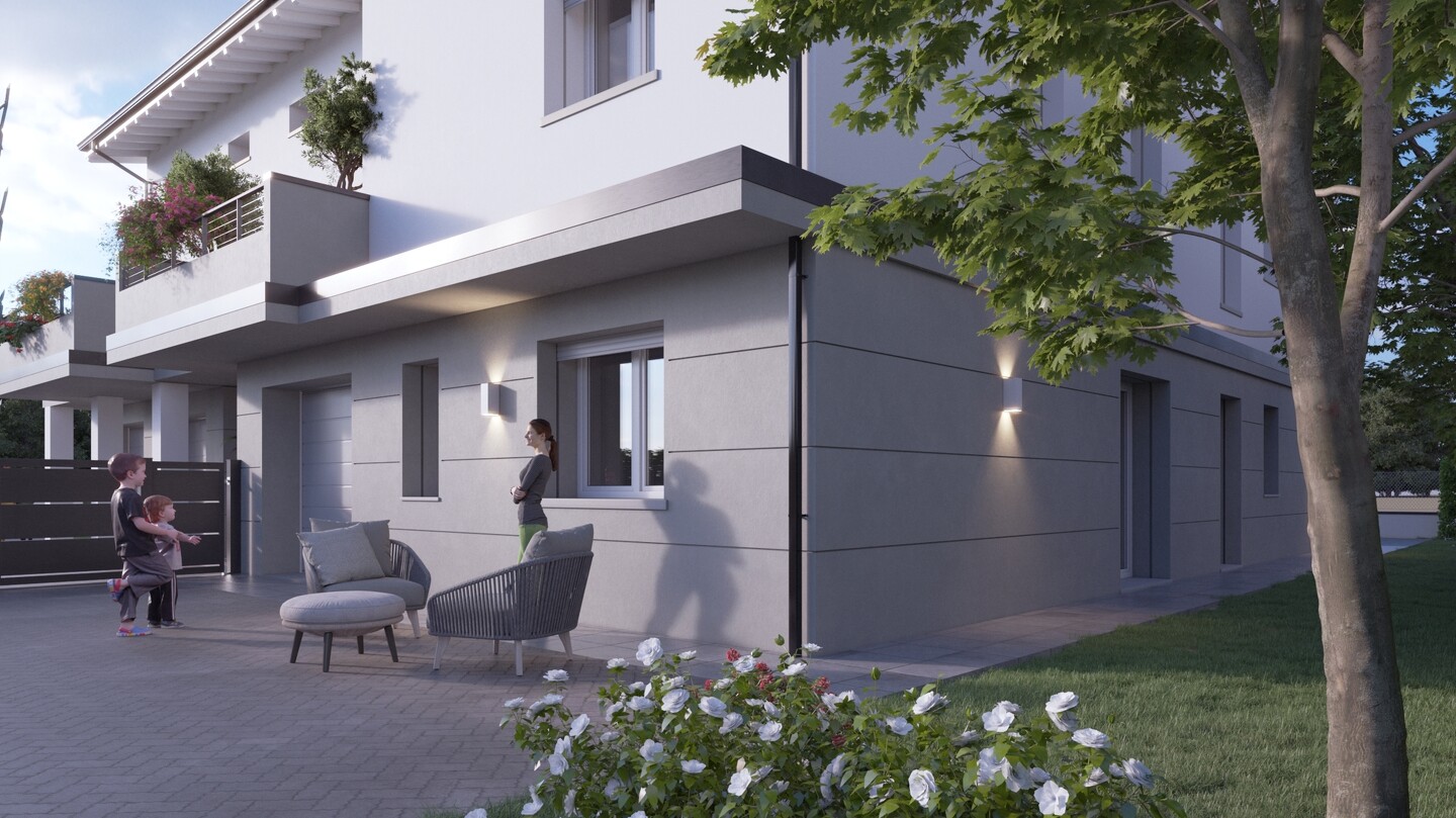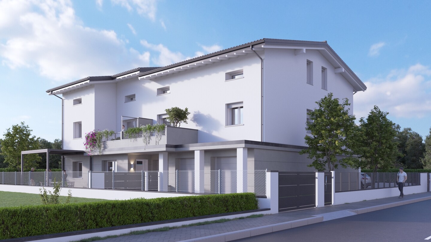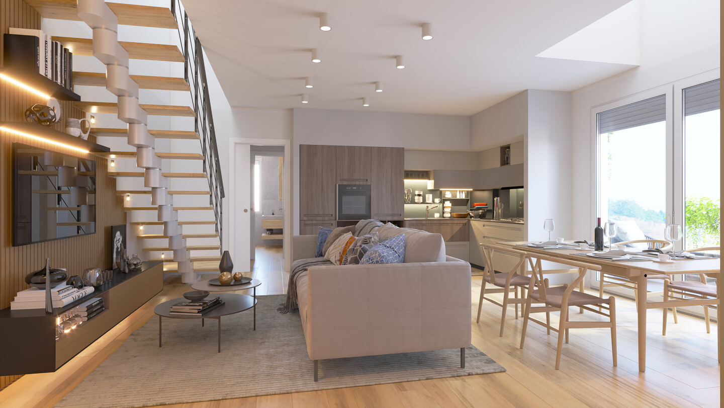 Splendido appartamento (tip. 6), disposto su due livelli e caratterizzato da spazi ben suddivisi e grande luminosità. Al primo piano si compone di ingresso su zona giorno di oltre 27 mq con cucina a vista, doppio volume e affaccio su terrazzo abitabile, disimpegno, camera matrimoniale e bagno finestrato. Tramite elegante scala interna di design si accede al secondo livello con spazioso soppalco, ideale da utilizzare come studio, bagno finestrato e due vani sottotetto, entrambi ampi e arredabili come ulteriori camere. Completano la proprietà l’autorimessa con annessa cantina e posto auto privato. Tutti gli immobili saranno realizzati con finiture di alto livello, con ampia scelta per poter personalizzare al meglio la propria casa e il massimo risparmio energetico (classe A4), con tecnologie di ultima generazione, tra cui dotazione di impianto fotovoltaico per ciascuna unità, predisposizione climatizzazione, riscaldamento a pavimento (assenza totale di gas).