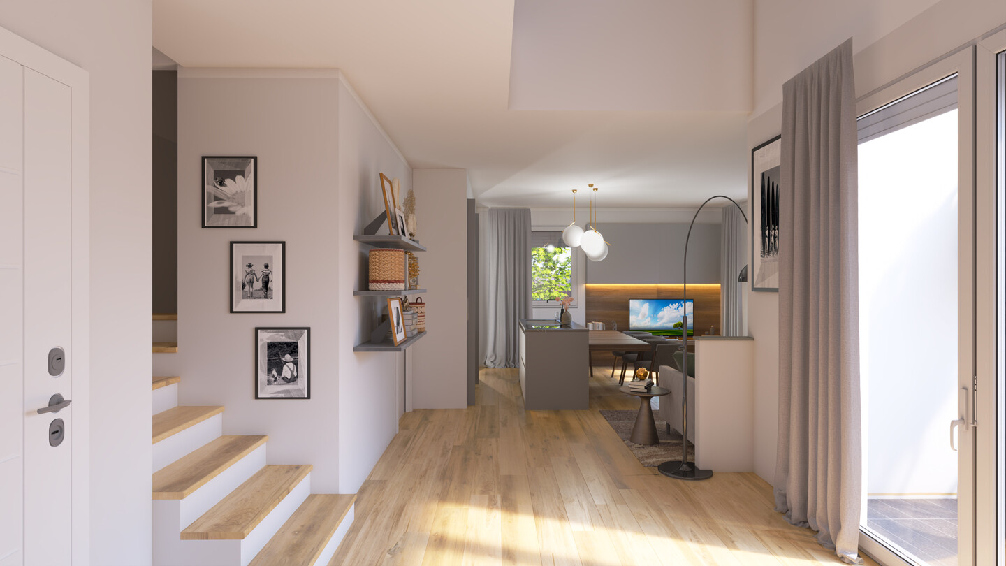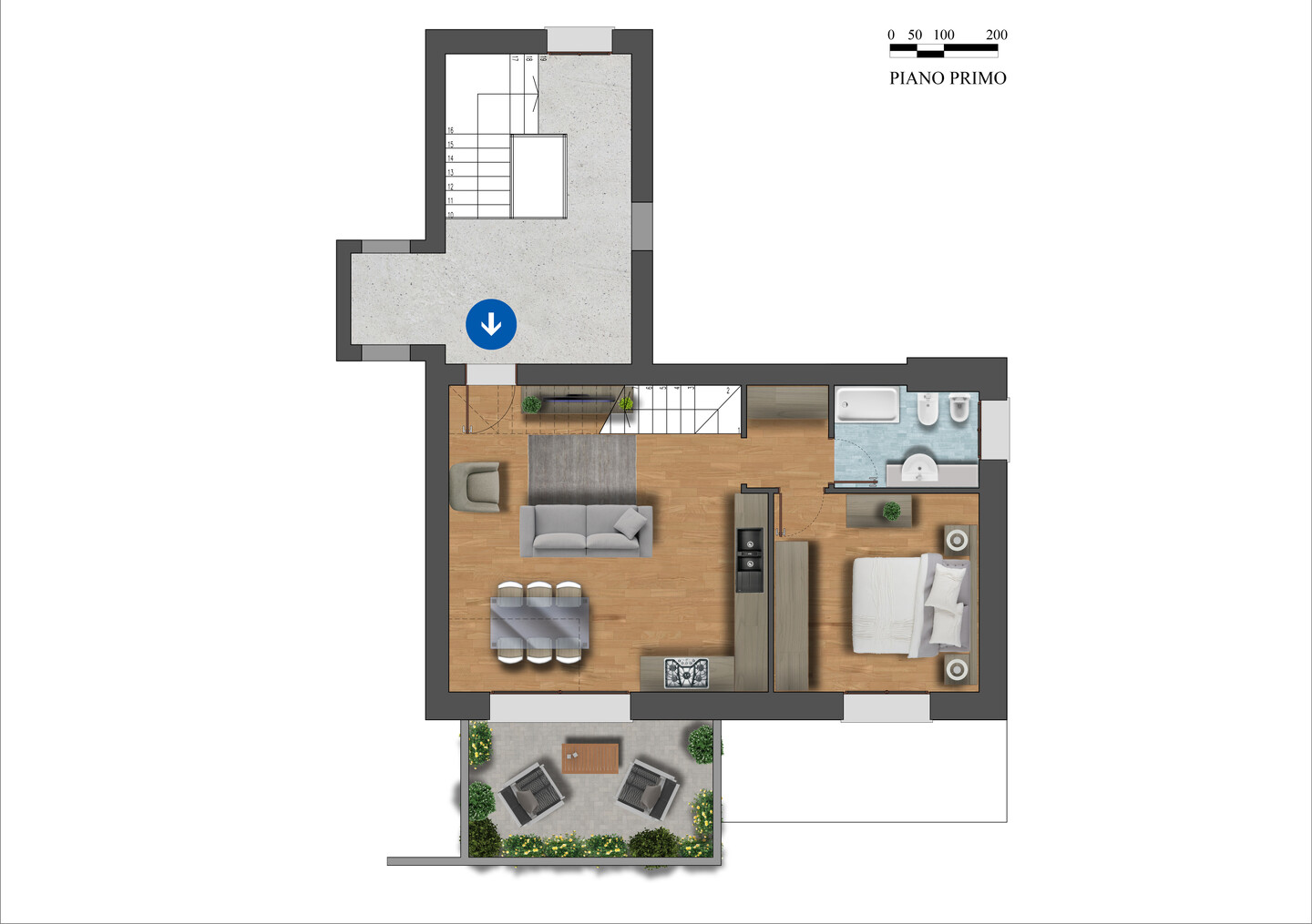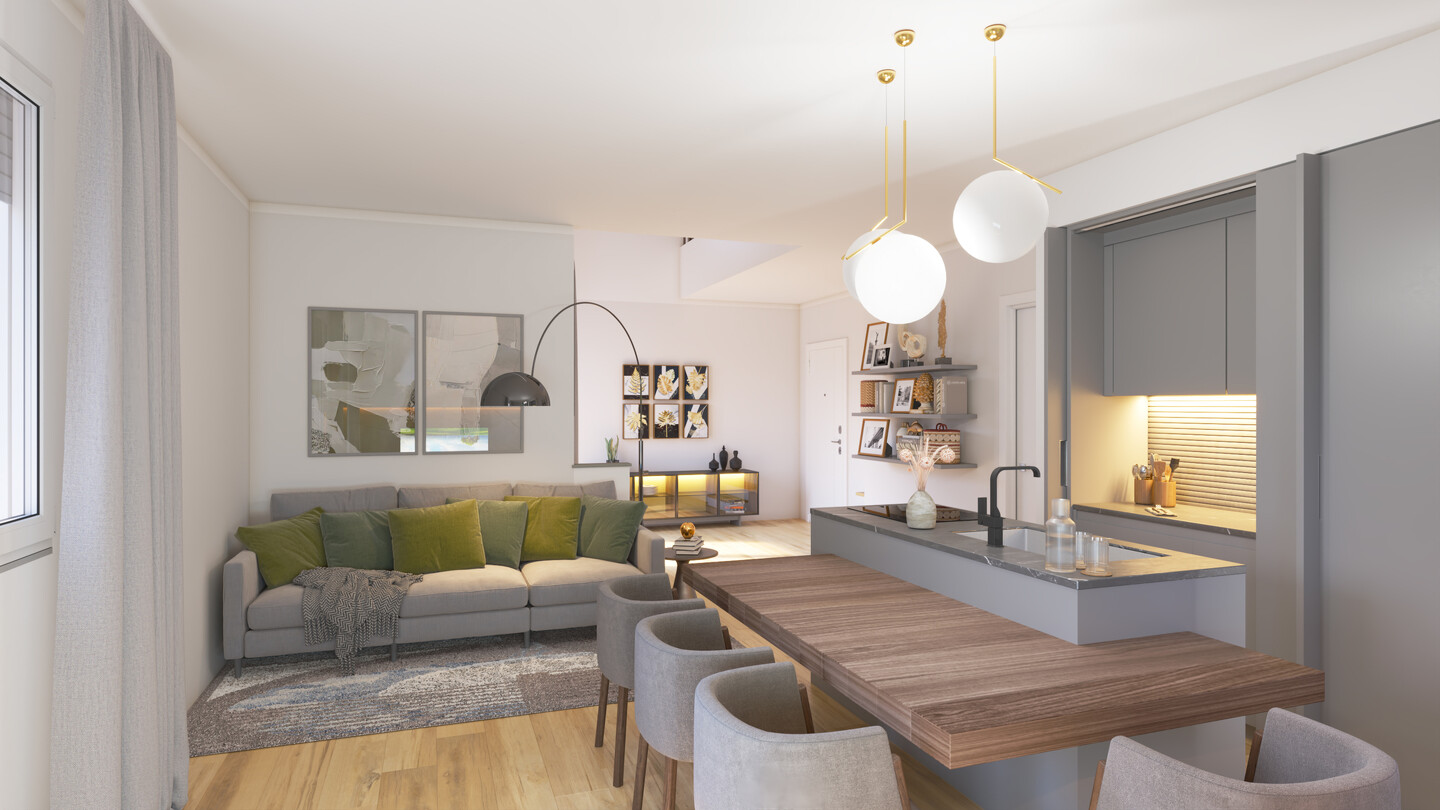 Splendido appartamento (tip. 6), disposto su due livelli e caratterizzato da spazi ben suddivisi e grande luminosità. Al primo piano si compone di ingresso su zona giorno di oltre 27 mq con cucina a vista, doppio volume e affaccio su terrazzo abitabile, disimpegno, camera matrimoniale e bagno finestrato. Tramite elegante scala interna di design si accede al secondo livello con spazioso soppalco, ideale da utilizzare come studio, bagno finestrato e due vani sottotetto, entrambi ampi e arredabili come ulteriori camere. Completano la proprietà l’autorimessa con annessa cantina e posto auto privato. Tutti gli immobili saranno realizzati con finiture di alto livello, con ampia scelta per poter personalizzare al meglio la propria casa e il massimo risparmio energetico (classe A4), con tecnologie di ultima generazione, tra cui dotazione di impianto fotovoltaico per ciascuna unità, predisposizione climatizzazione, riscaldamento a pavimento (assenza totale di gas).