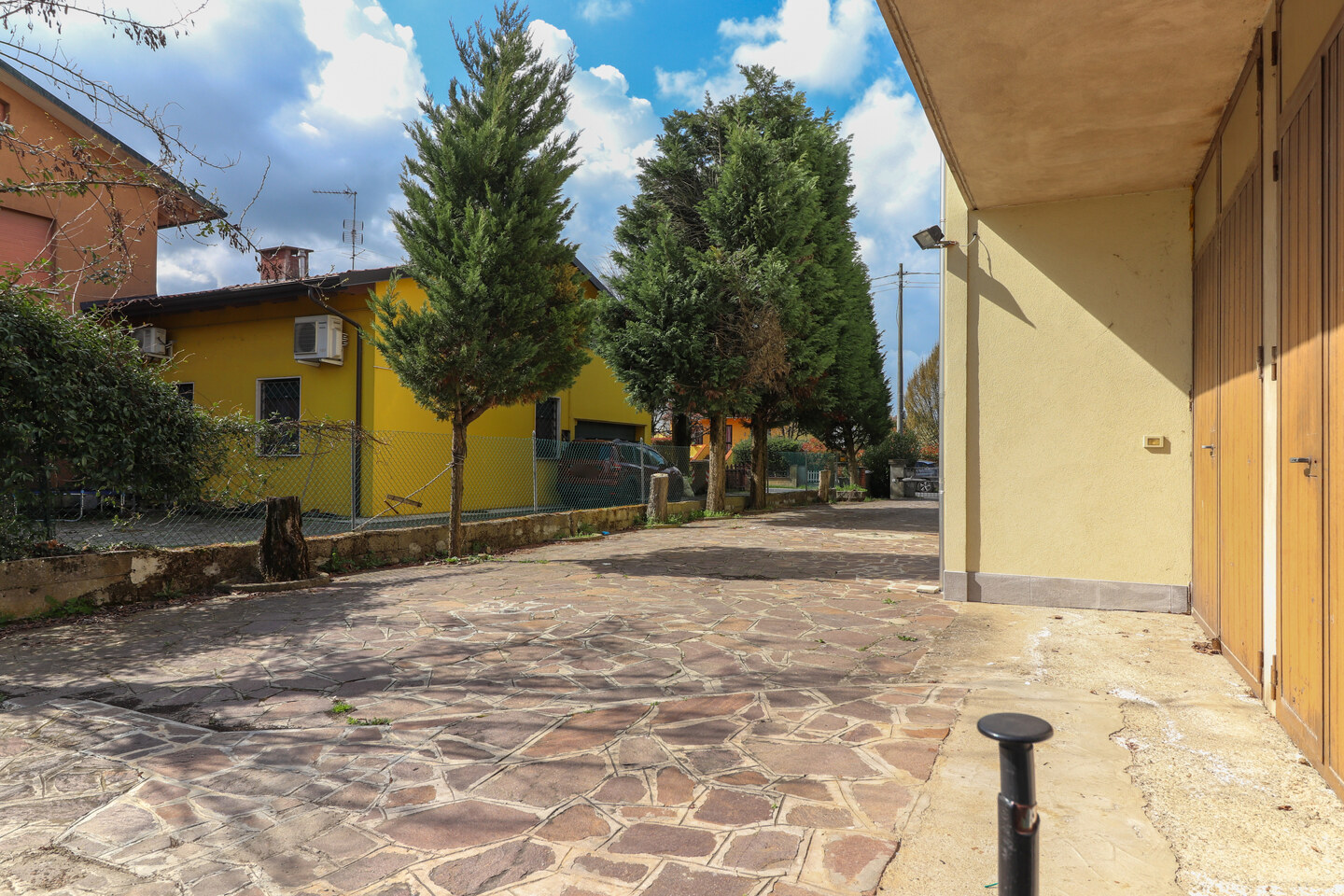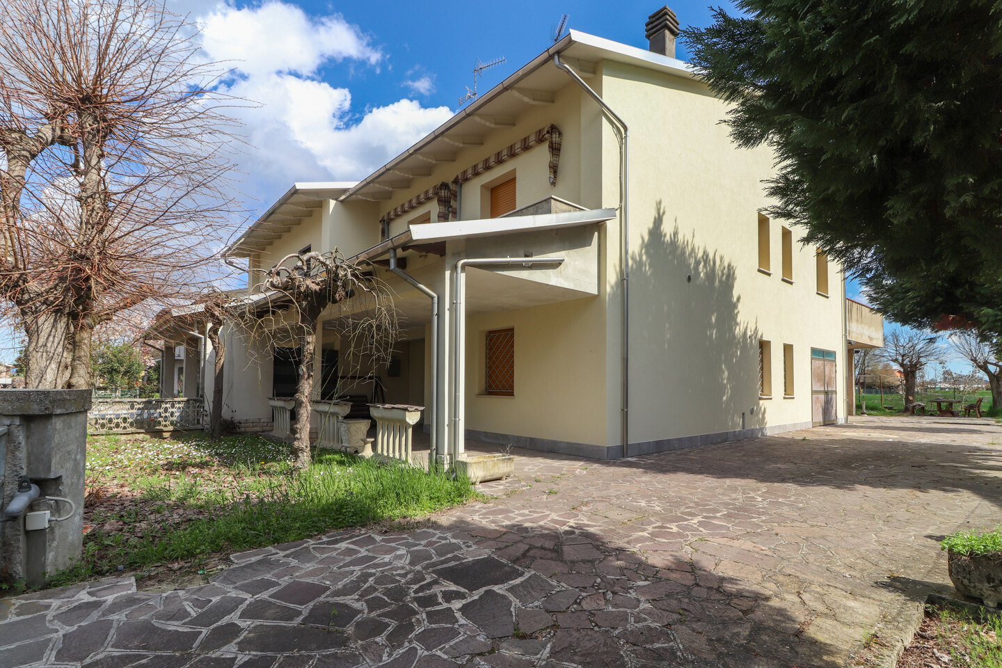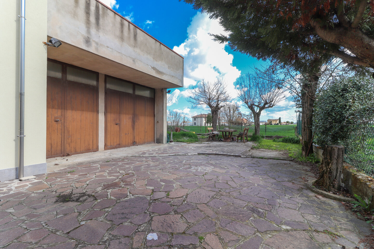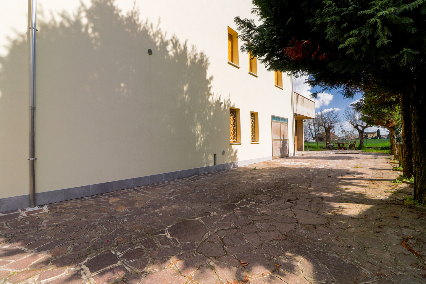 Piano terra: ampio ingresso, disimpegno, camera da letto, bagno, lavanderia; due autorimesse doppie, portico. Area cortiliva di proprietà della partecipanza agraria.