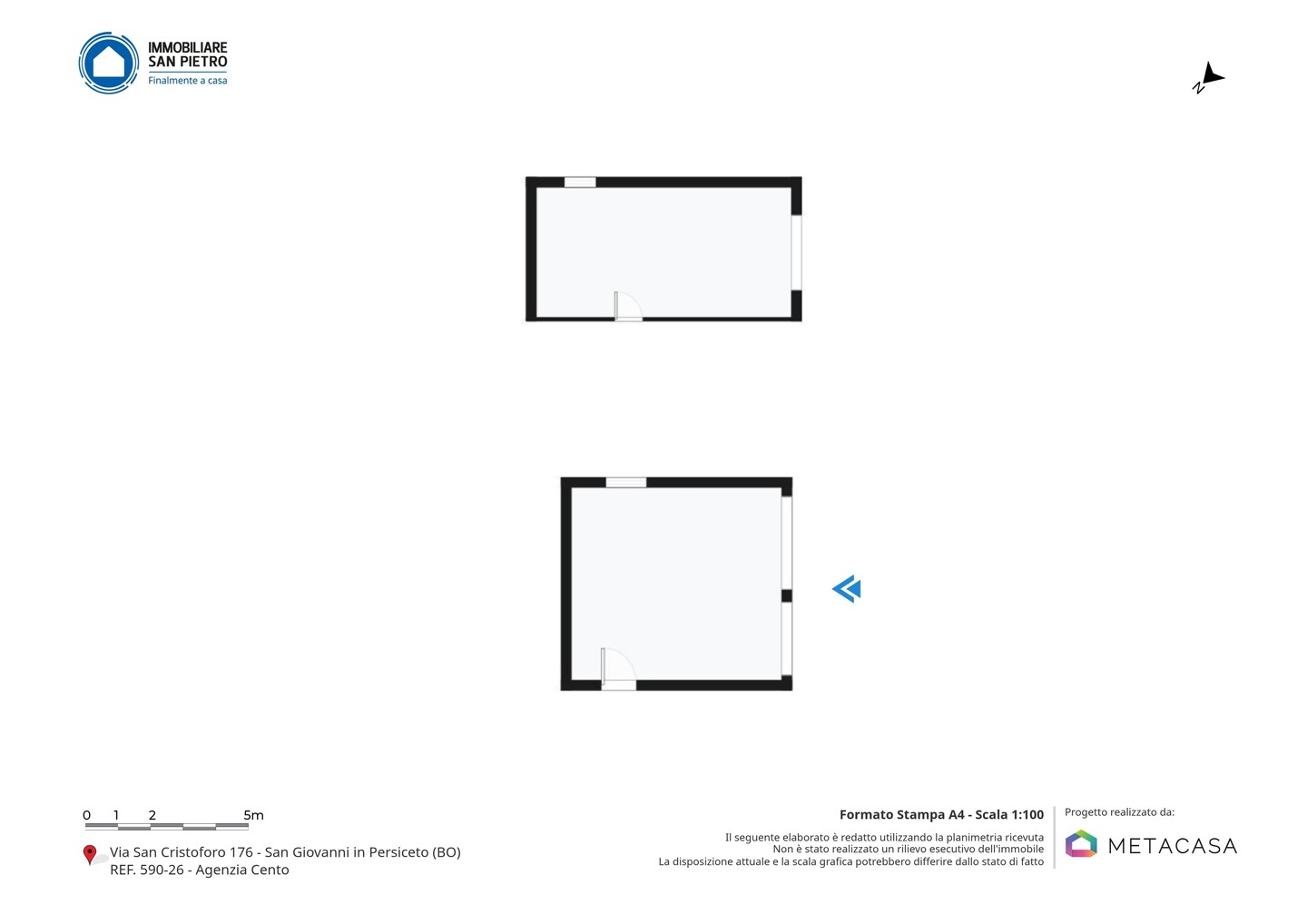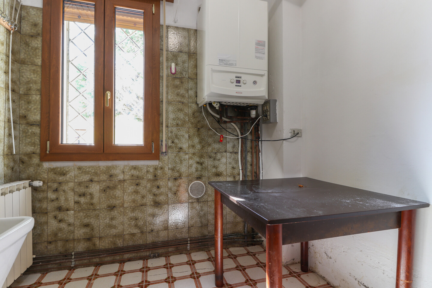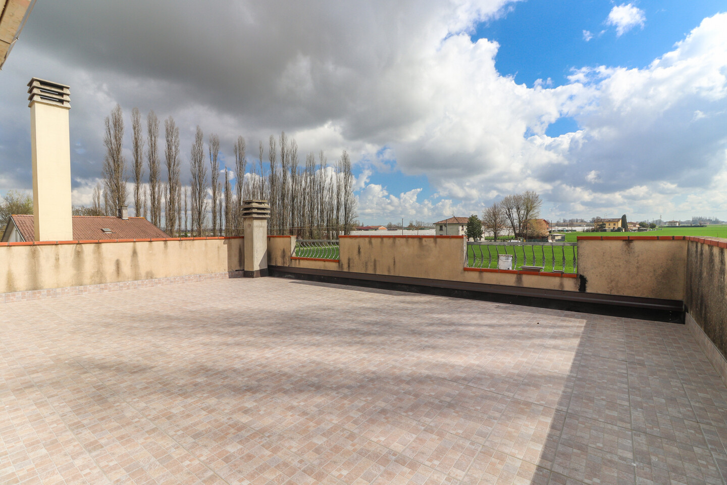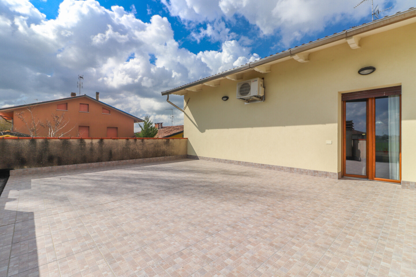 Piano terra: ampio ingresso, disimpegno, camera da letto, bagno, lavanderia; due autorimesse doppie, portico. Area cortiliva di proprietà della partecipanza agraria.