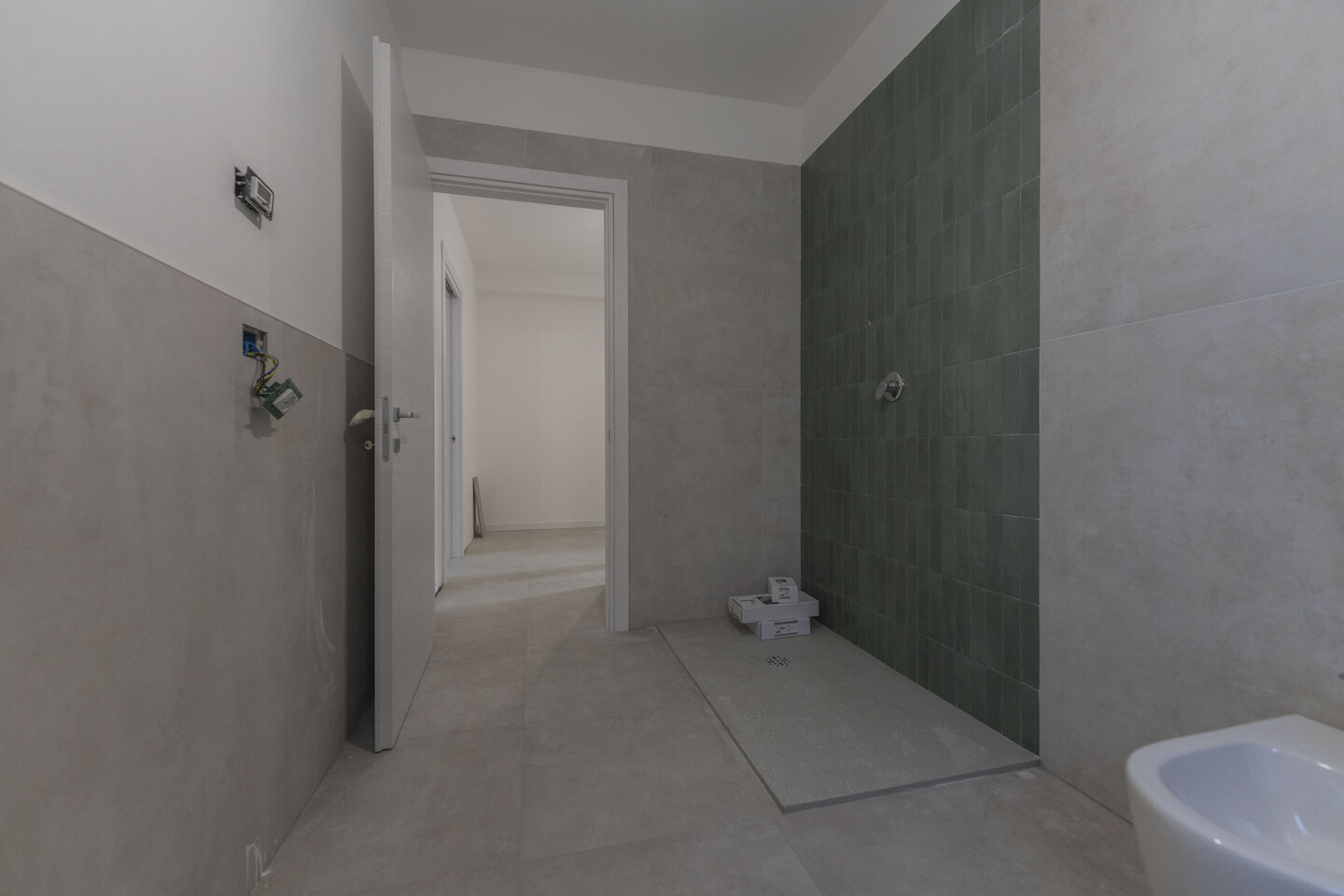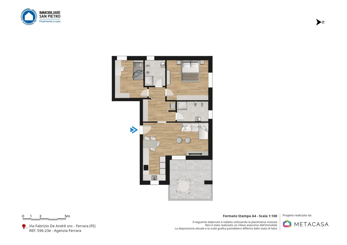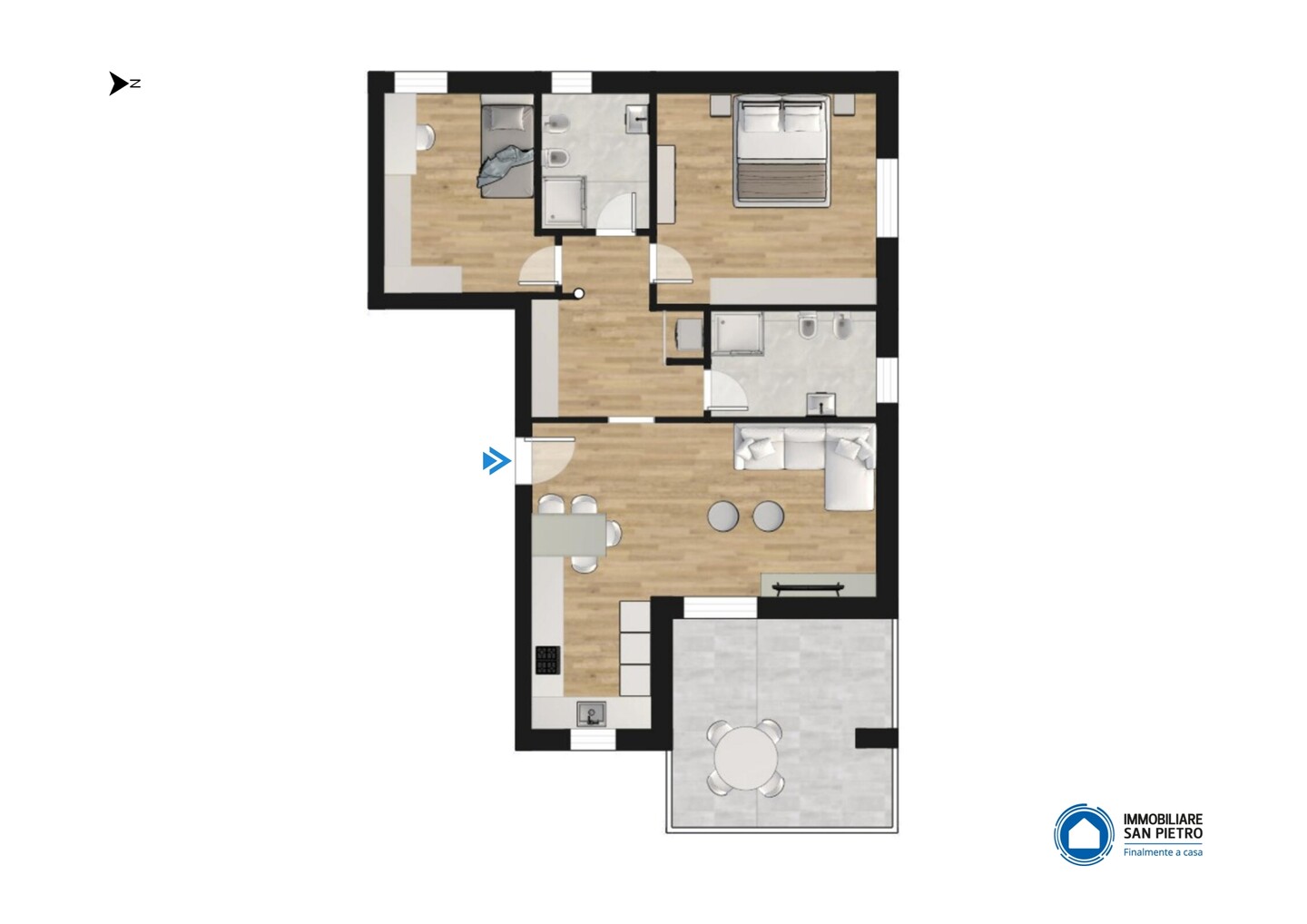 FABBRICATO B, APPARTAMENTO TIPOLOGIA B5, PIANO SECONDO. Ingresso su soggiorno con angolo cucina ed accesso al terrazzo di 16 mq, disimpegno zona notte arredabile, 2 camere da letto e 2 bagni. Garage compreso.
