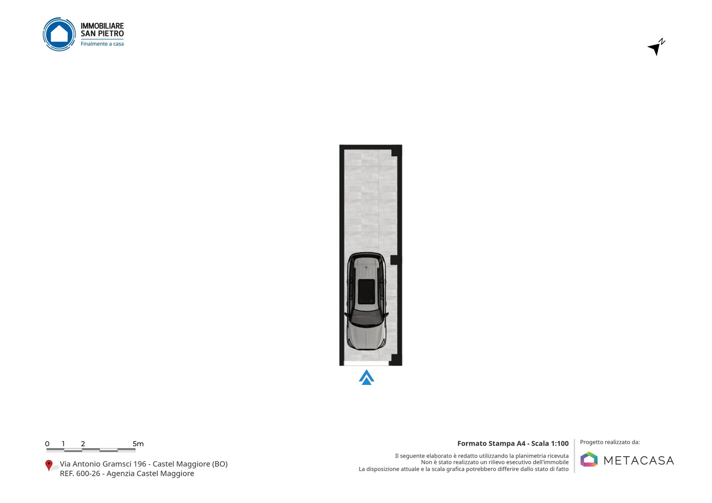 Garage al piano seminterrato di circa 26 mq, ideale per ospitare comodamente un’auto e una moto. Lo spazio consente anche un’agevole area di manovra e possibilità di utilizzo come deposito accessorio.