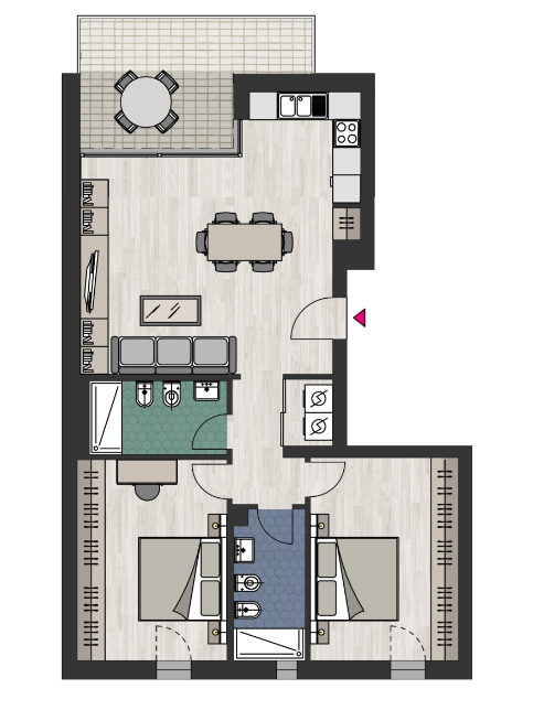 Appartamento E6 scala D composto da ingresso su ampia zona living con angolo cottura ed affaccio su terrazzo parzialmente loggiato, due camere matrimoniali zona lavanderia, due bagni, cantina a partire da €.5.000+iva. Possibilità di acquistare a parte Autorimessa a partire da €.35.000+iva e Posto Auto a partire da €.25.000+iva. Consegna Gennaio 2026.