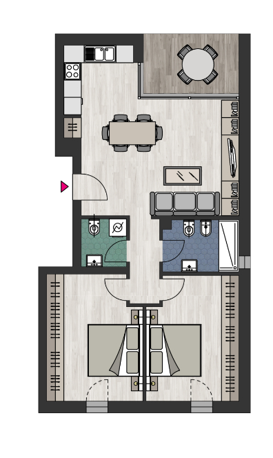 Appartamento ultimo piano, composto da ingresso su zona living con angolo cottura ed affaccio su terrazzo loggiato, due camere matrimoniali, due bagni di cui uno finestrato, cantina a partire da €.5.000+iva. Possibilità di acquistare a parte Autorimessa a partire da €.35.000+iva e Posto Auto a partire da €.25.000+iva. Consegna Gennaio 2026.