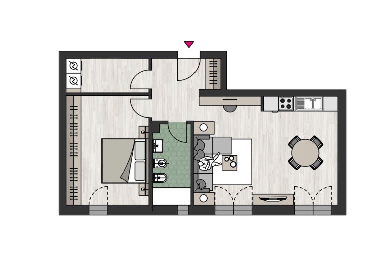 Appartamento ultimo piano, composto da ingresso arredabile, ampia zona living con angolo cottura, una camera matrimoniale, una zona lavanderia ed un bagno, cantina a partire da €.5.000 +iva.