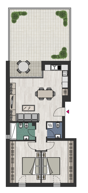 Appartamento composto da ingresso su ampia zona living con angolo cottura ed affaccio su corte esclusiva parzialmente loggiata, due camere matrimoniali, ampia lavanderia e un bagno finestrato. Possibilità di acquistare a parte Autorimessa a partire da €.35.000,00 e cantina a partire da €.5.000. Consegna Gennaio 2026.