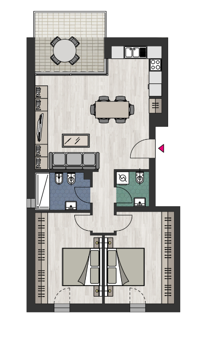 Appartamento A14 scala A ultimo piano: composto da ingresso su zona living con angolo cottura ed affaccio su terrazzo + loggia abitabile, due camere matrimoniali, due bagni, cantina a partire da €.5.000+iva. Possibilità di acquistare a parte Autorimessa a partire da €.35.000+iva e Posto Auto a partire da €.25.000+iva. Consegna Gennaio 2026.
