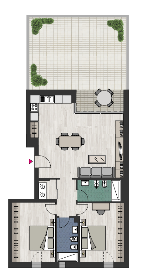 Appartamento D1 scala B composto da ingresso su ampia zona living con angolo cottura ed affaccio su terrazzo verde + loggia abitabile, due camere matrimoniali, lavanderia e due bagni, cantina a partire da €.5.000+iva. Possibilità di acquistare a parte Autorimessa a partire da €.35.000+iva e Posto Auto a partire da €.25.000+iva. Consegna Gennaio 2026.