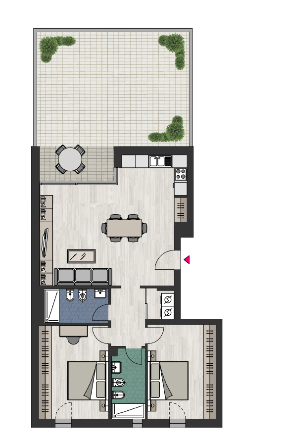 Appartamento C2 scala B composto da ingresso su ampia zona living con angolo cottura ed affaccio su terrazzo verde + loggia abitabile, due camere matrimoniali, zona lavanderia e due bagni, cantina a partire da €.5.000+iva Possibilità di acquistare Autorimessa a partire da €.35.000+iva e Posto Auto a partire da €.25.000+iva. Consegna Gennaio 2026.