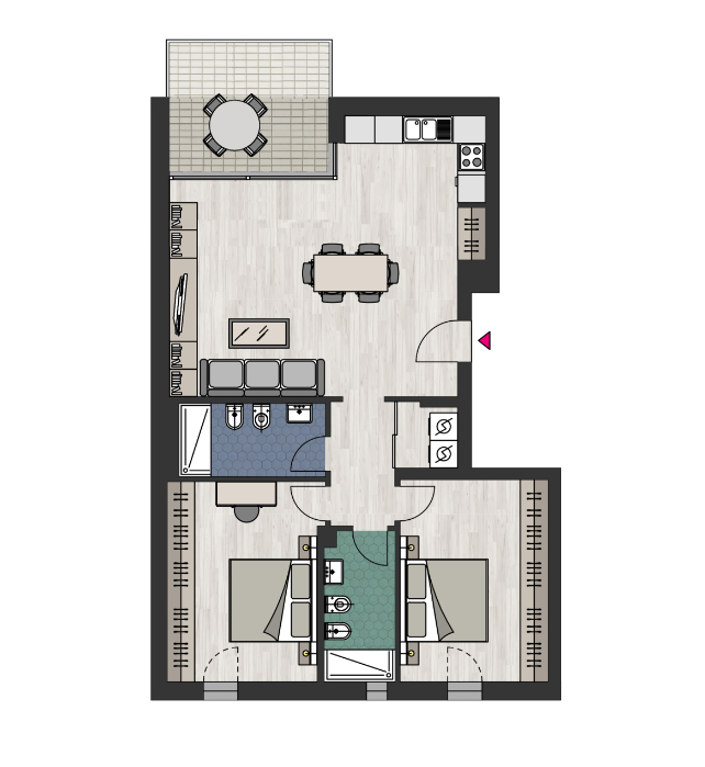 Appartamento R2 scala C composto da ingresso su ampia zona living con angolo cottura ed affaccio su terrazzo verde + loggia abitabile, due camere matrimoniali, zona lavanderia e due bagni, cantina a partire da €.5.000+iva. Possibilità di acquistare a parte Autorimessa a partire da €.35.000+iva e Posto Auto a partire da €.25.000+iva. Consegna Gennaio 2026.