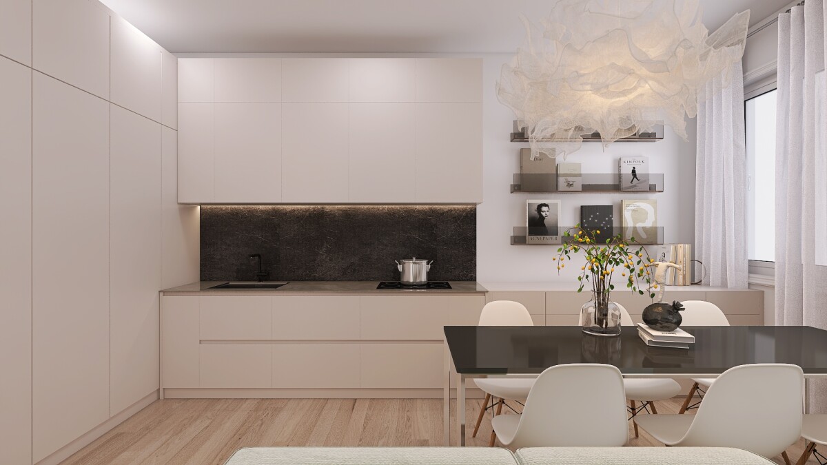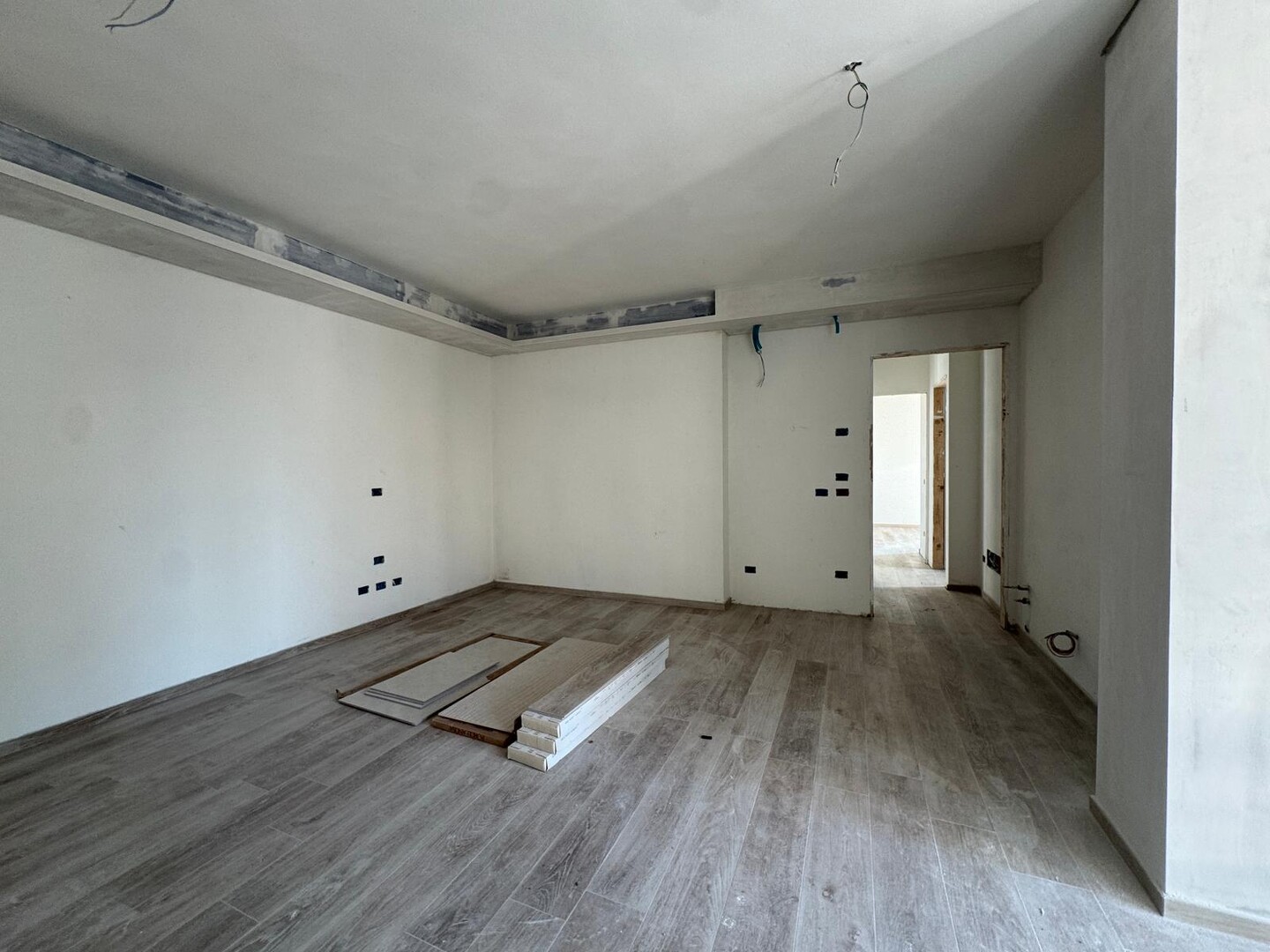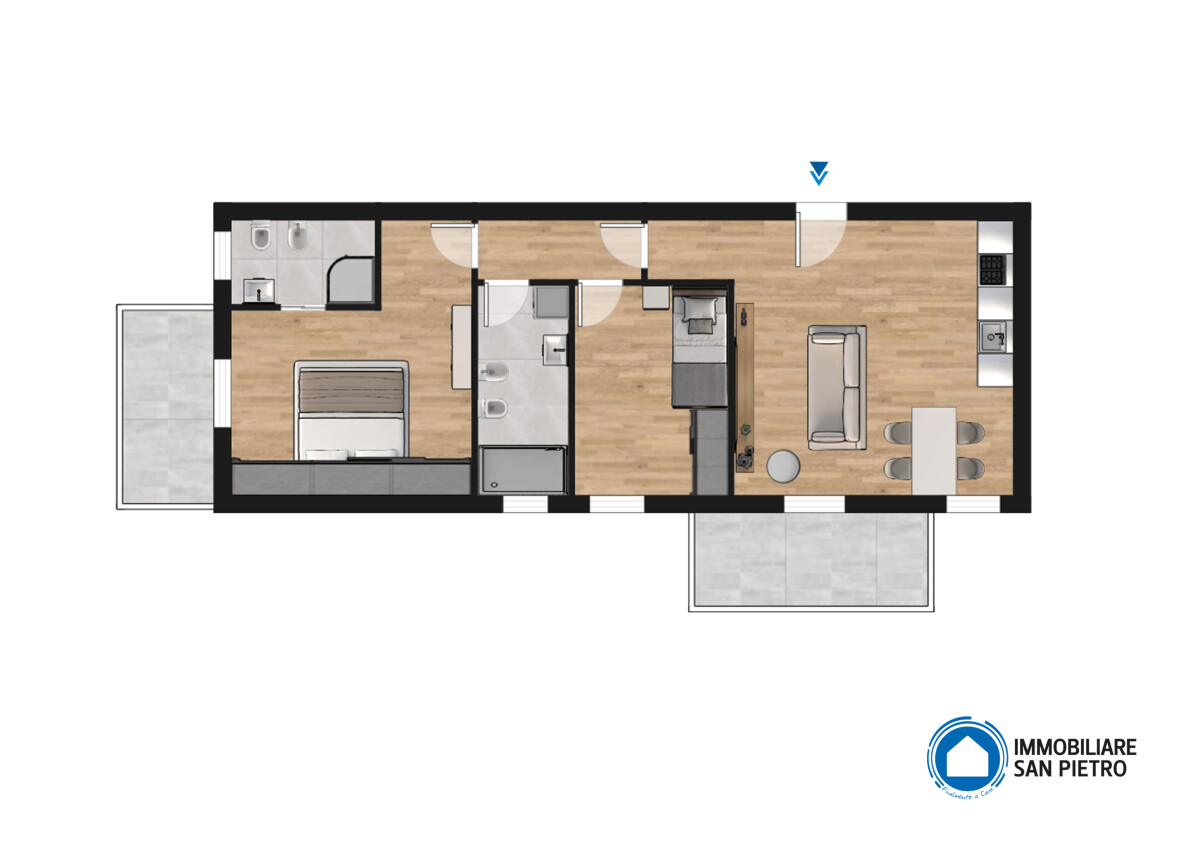 ingresso su soggiorno con angolo cottura ed accesso al balcone, disimpegno, 1 camera da letto matrimoniale con bagno privato e balcone, 1 camera da letto singola e secondo bagno.
