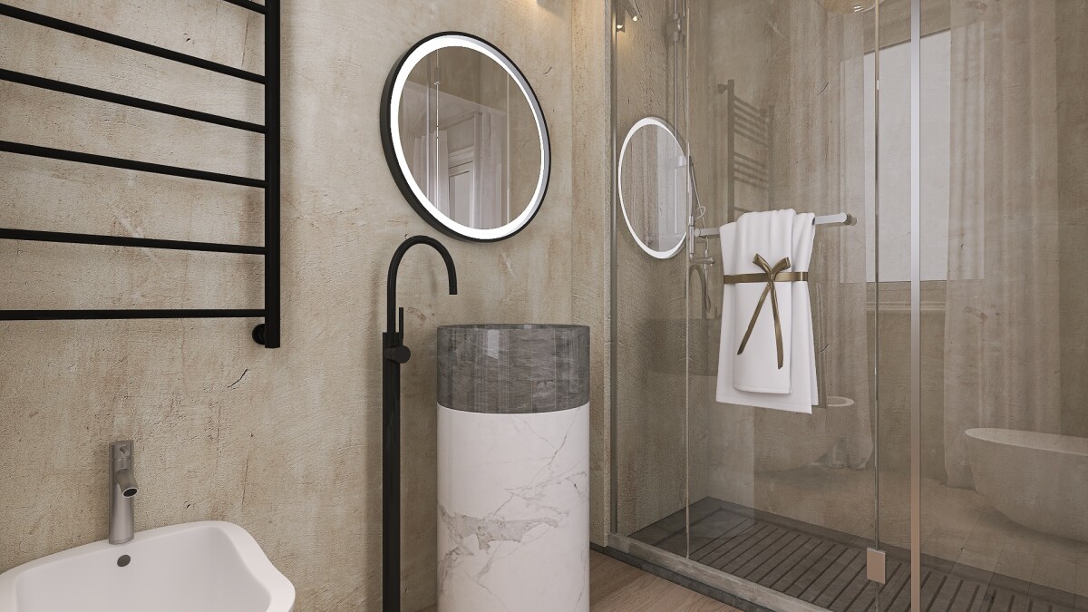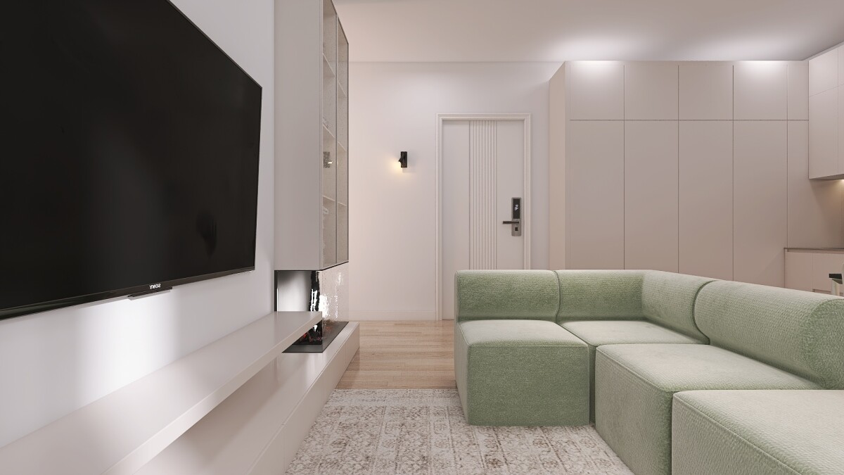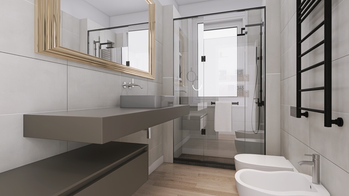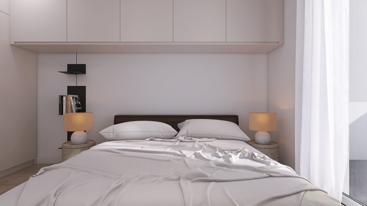 ingresso su soggiorno con angolo cottura ed accesso al balcone, disimpegno, 1 camera da letto matrimoniale con bagno privato e balcone, 1 camera da letto singola e secondo bagno.