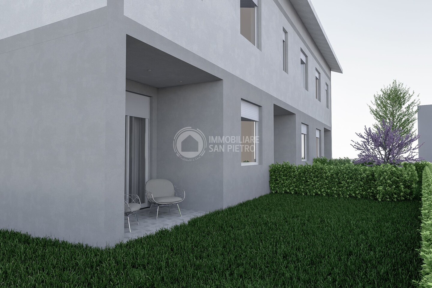 In elegante villa trifamiliare, si propone porzione di testa, cielo-terra, disposta su tre piani con giardino privato su tre lati. Al piano terra si sviluppa la zona giorno di 35 mq, composta da una sala rettangolare luminosa grazie alle finestre su tre lati e con accesso al giardino tramite un grazioso portico, cucina abitabile separata e un funzionale bagno.