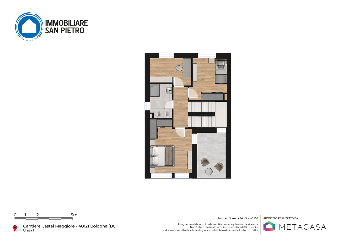 Una comoda scala conduce al primo piano, dove si trovano tre camere da letto (una matrimoniale, una doppia e una singola), un ampio bagno finestrato e un terrazzo abitabile di 11 mq.
