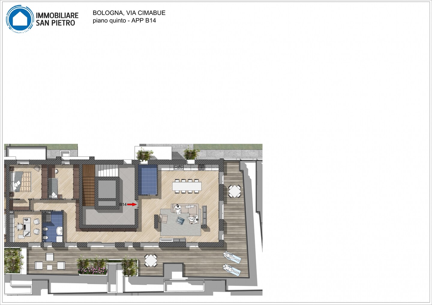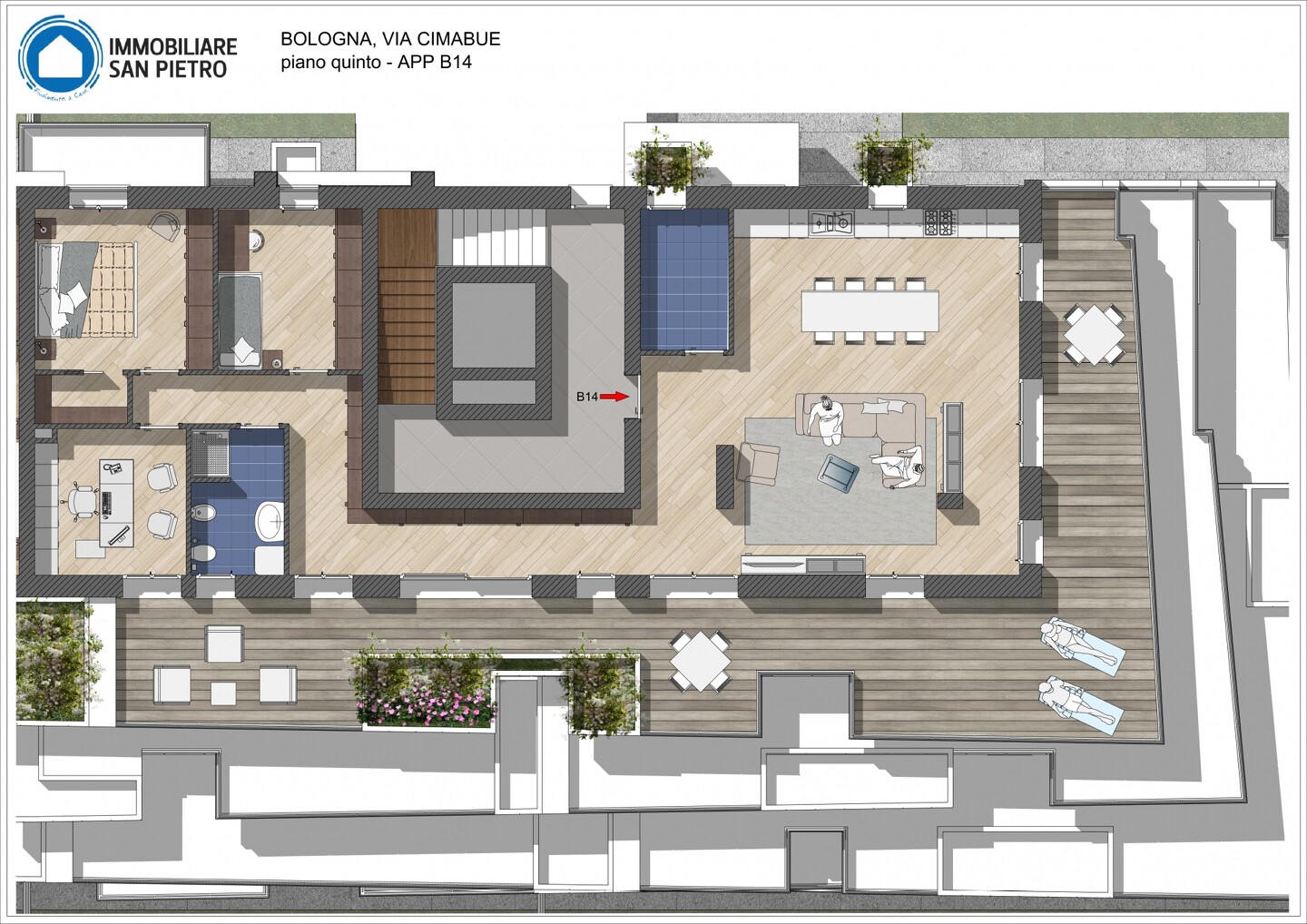 In elegante palazzina in costruzione, splendido attico panoramicissimo al piano quinto con meravigliosa vista San Luca, costruzione in bioedilizia in legno con tecnologia XLAM, con altissime prestazioni energetiche per garantire il miglior comfort abitativo ed elevate performance antisismiche, composto da ingresso su ampio soggiorno con angolo cottura di mq 46 che affaccia su ampio terrazzo abitabile, disimpegno zona notte, 2 camere di cui una matrimoniale con cabina armadio, uno studio, due ampi bagni finestrati.