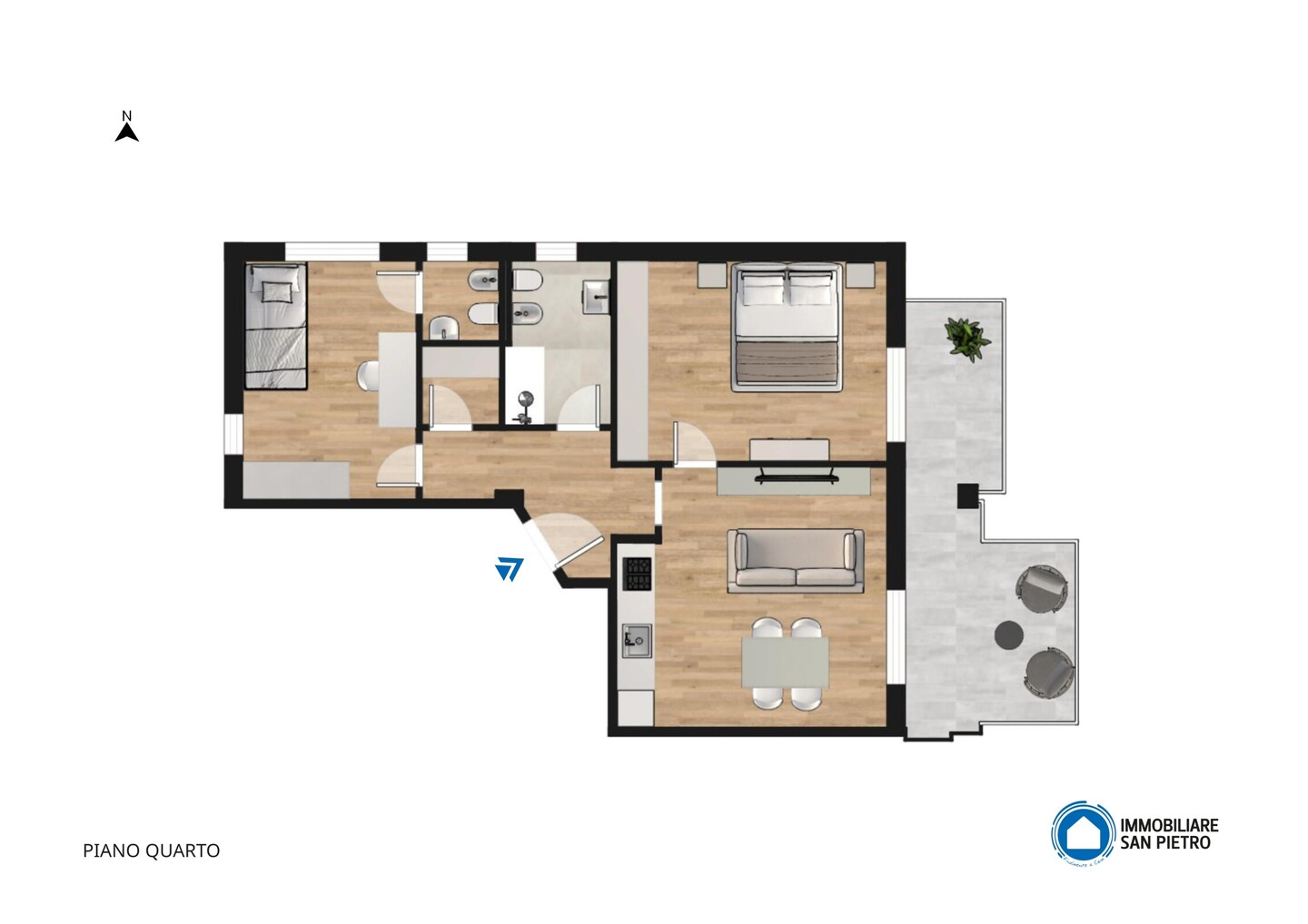 La proprietà comprende una camera matrimoniale, due bagni e la possibilità di ricavare una seconda camera da letto. Possibilità di parcheggiare un auto nell’area condominiale.