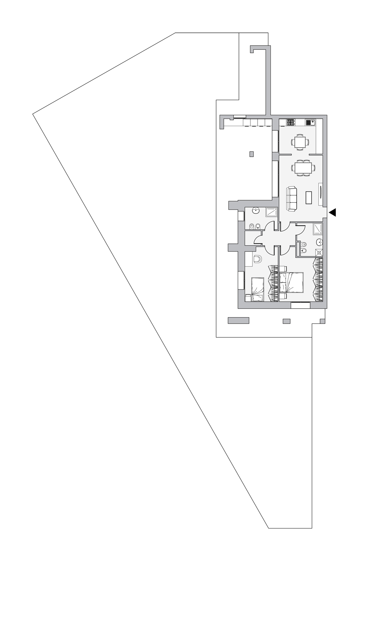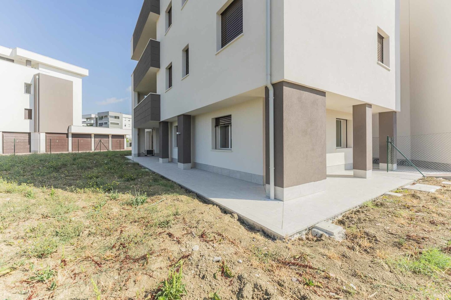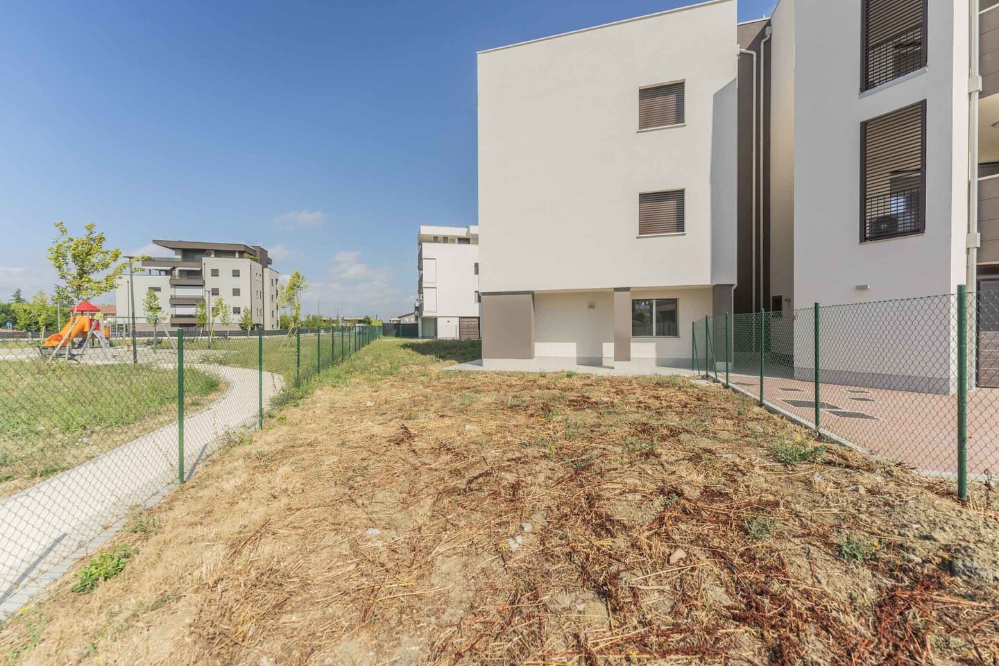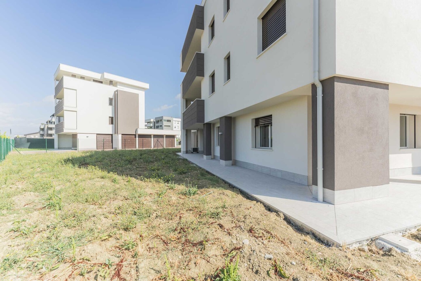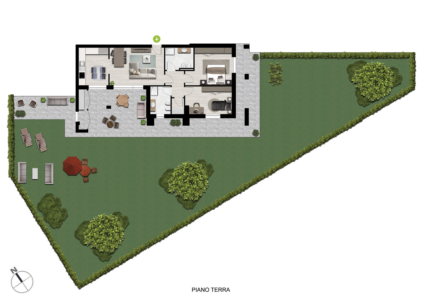 In piccola palazzina con ascensore, di sole sette unità abitative, elegante appartamento posto al piano terra con giardino privato di grandi dimensioni (tip. A1). La soluzione si compone di ingresso su zona giorno di quasi 30 mq con sala e cucina abitabile, disimpegno zona notte, 2 camere, 2 bagni e funzionale ripostiglio. La zona giorno è arricchita da due vetrate portafinestra che danno accesso alla grande loggia che porta al giardino, che circonda l’abitazione, compreso nel prezzo posto auto di proprietà.