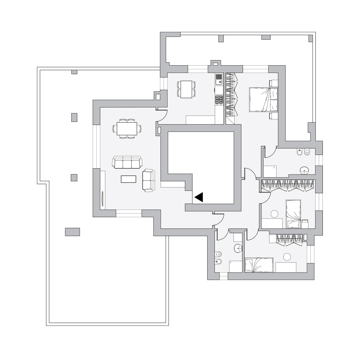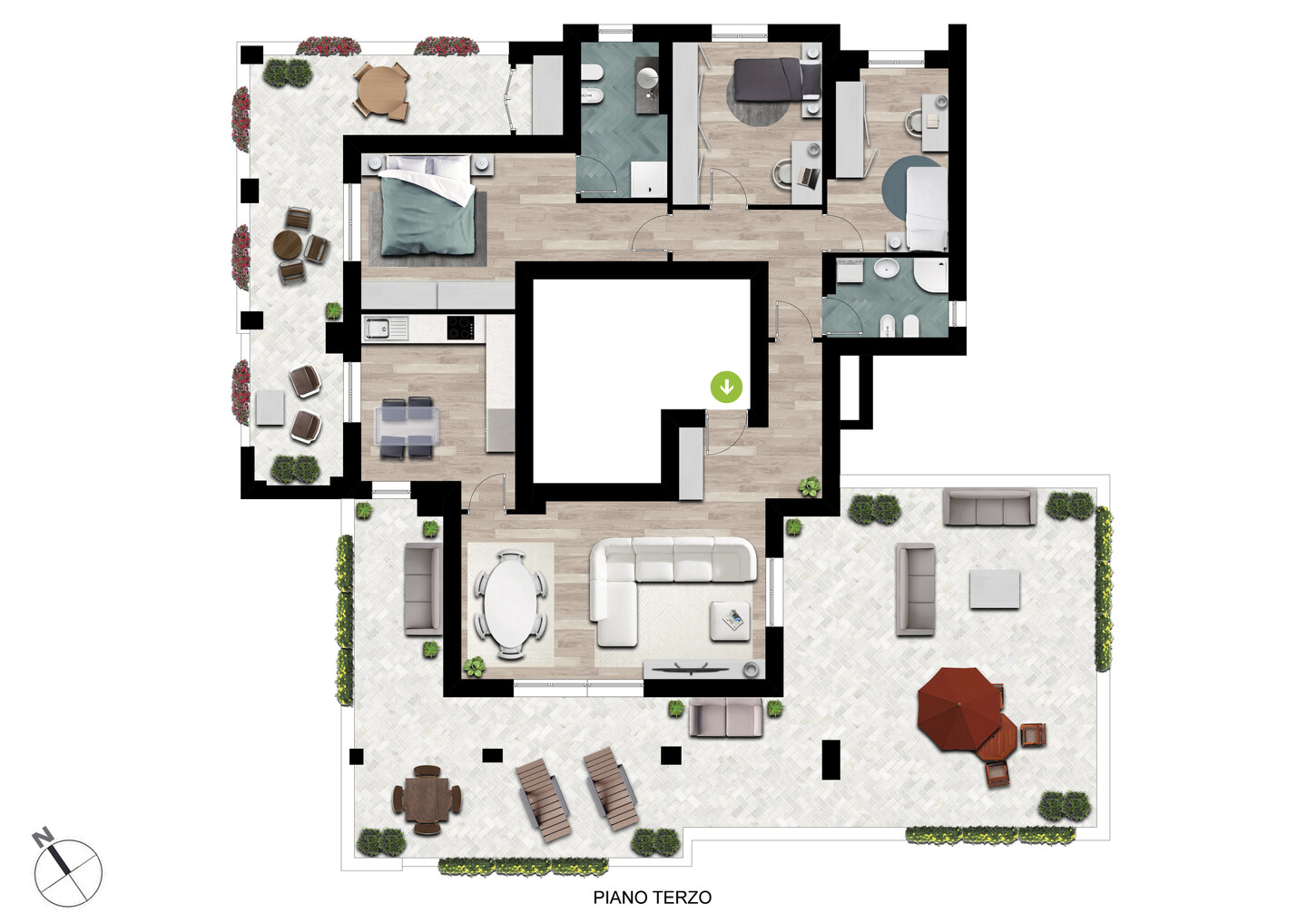 In piccola palazzina di tre piani con ascensore e di sole sette unità abitative, immersa nel verde, elegante ATTICO (tip. A7), unico appartamento al piano con esposizione su quattro lati e grande luminosità ad ogni ora del giorno. Peculiarità di questa soluzione è la grandissima zona giorno di quasi 50 mq, con ingresso, salone con terrazza abitabile di quasi 95 mq e cucina abitabile con ulteriore terrazza abitabile di quasi 26 mq.