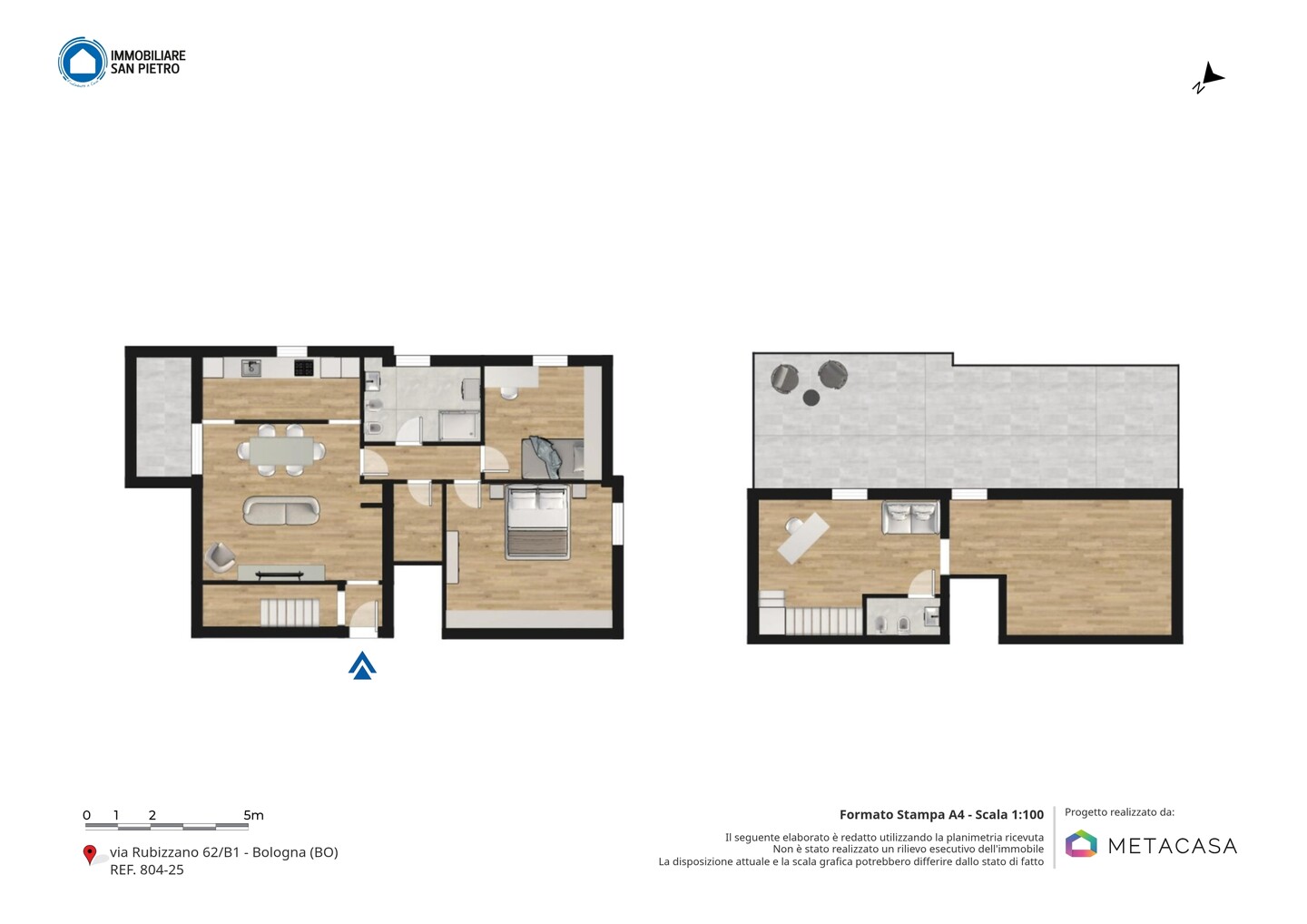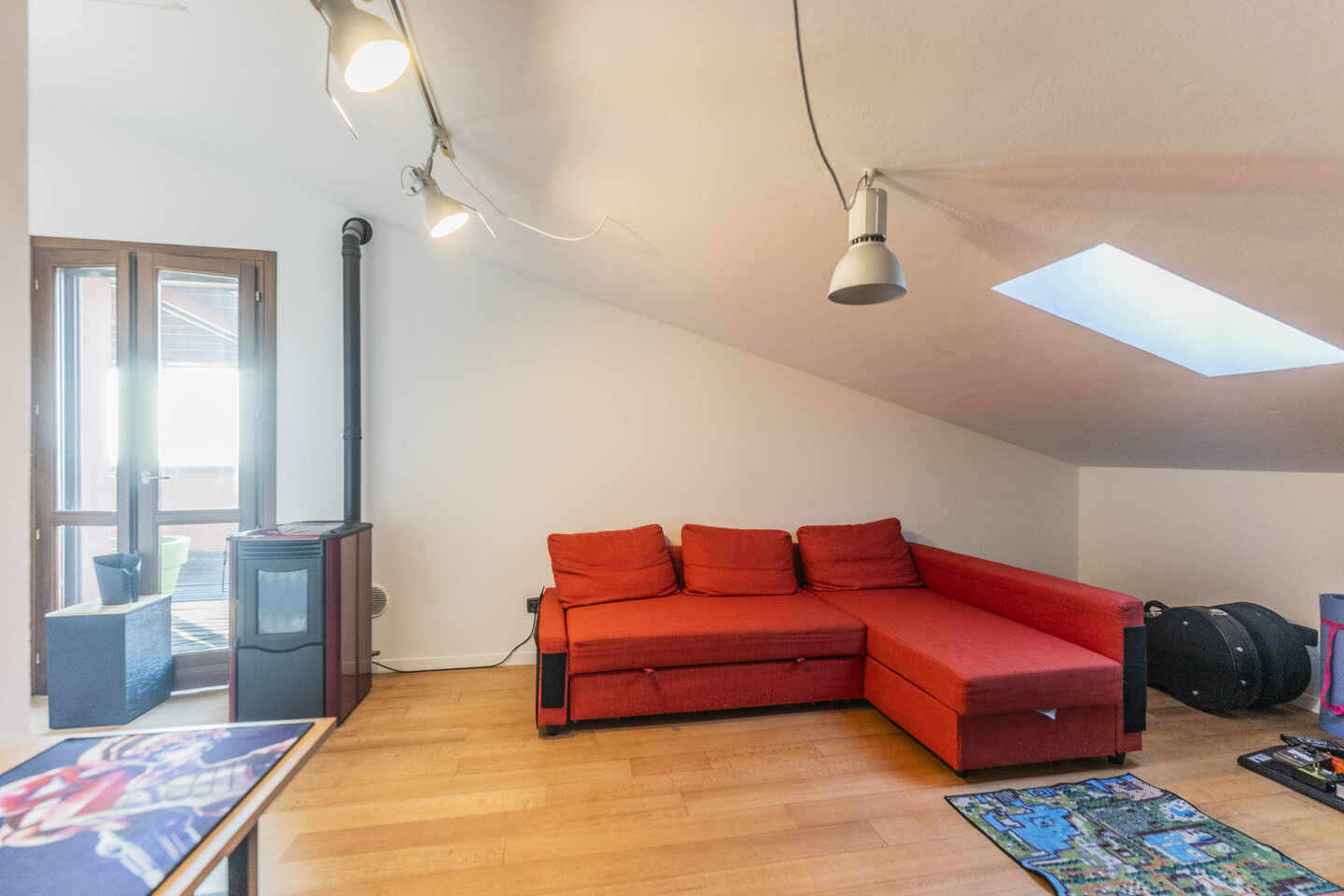 Situato al secondo e terzo piano (ultimo) di una palazzina edificata nel 2005, con tinteggiatura esterna in rifacimento, questo appartamento duplex offre un ingresso accogliente che si apre su un luminoso soggiorno-pranzo, con cucina semi-abitabile e terrazzo coperto. La zona notte comprende 2 camere, di cui una matrimoniale e una doppia, oltre un bagno e un ripostiglio. Tramite elegante scala interna in legno si accede al piano di sopra dove troviamo una pratica camera/studio, un ripostiglio di ampie dimensioni (attualmente arredato come ulteriore zona svago) e un piccolo bagno di servizio. Da qui accediamo al fantastico terrazzo di 40 mq, un’oasi perfetta di pace e relax. Completa la proprietà un garage di 20mq al piano terra. L’immobile si presenta in ottimo stato di manutenzione interna, con impianti a norma, termo autonomo e climatizzatore con pompa di calore.
