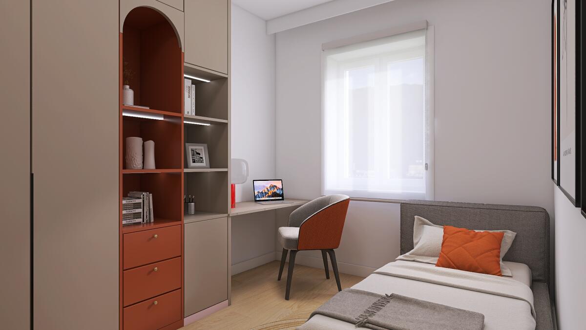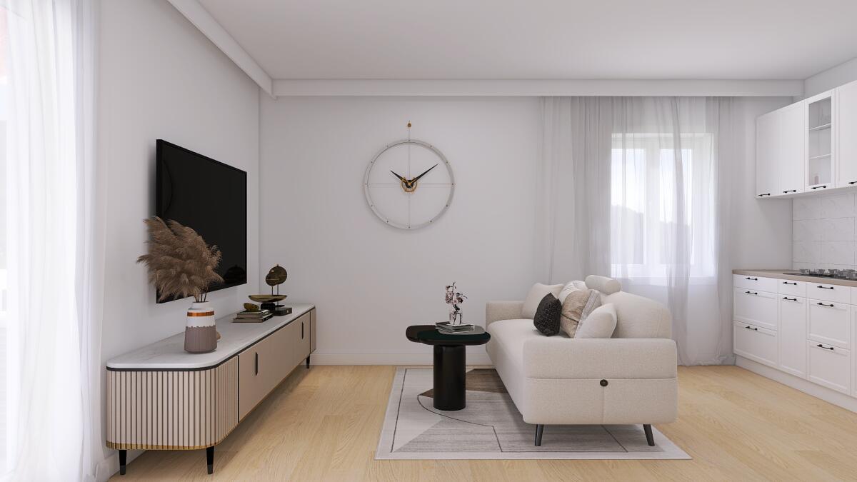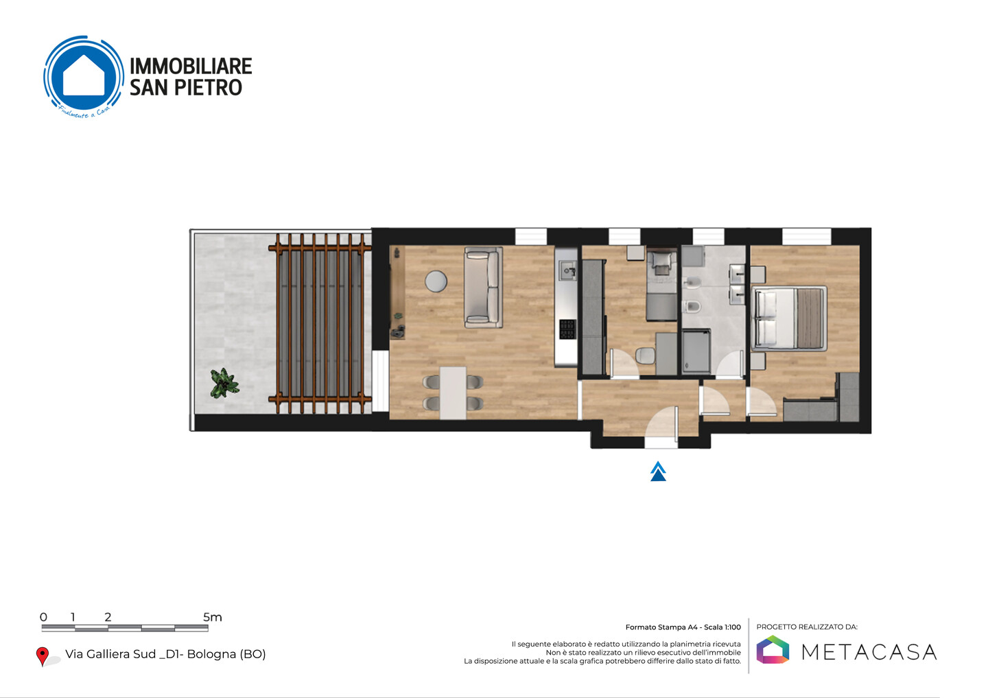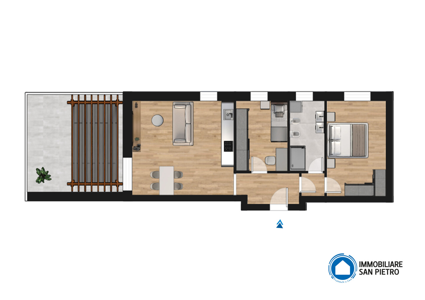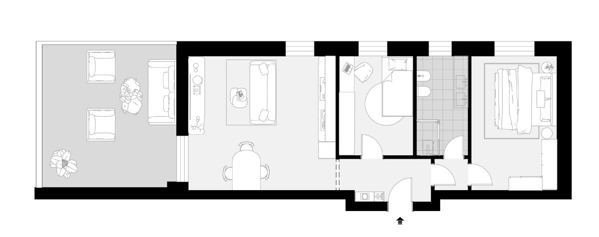 Appartamento al primo piano, con ascensore, che offre un’organizzazione degli spazi ottimale. L’ingresso conduce a un’ampia zona giorno (più di 24 mq) con cucina a vista, dalla quale si accede a un terrazzo abitabile, un valore aggiunto per godere dell’esterno. La disposizione interna prevede due camere da letto (una matrimoniale e una singola) e un bagno finestrato. L’immobile include, al piano terra, un’autorimessa e un posto auto, risolvendo comodamente le esigenze di parcheggio.