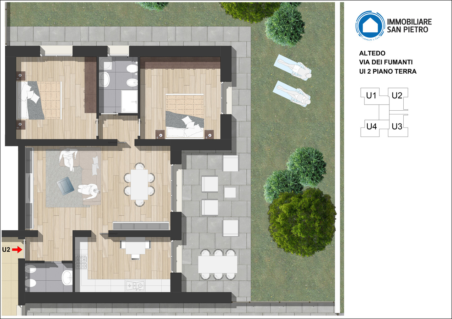 L’intervento in oggetto consiste nella realizzazione di una palazzina sviluppata su 2 livelli di ultima generazione. L’appartamento numero 2 è interamente sviluppato al piano terra e così strutturato: ingresso su un piccolo disimpegno, soggiorno, cucina abitabile, 2 camere matrimoniali e 2 bagni. Completano la proprietà un portico esterno, giardino, autorimessa e cantina a parte su richiesta. Sono infine presenti 4,5 kW di impianto fotovoltaico per ogni appartamento.