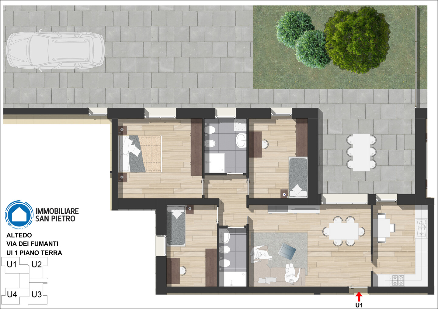 L’intervento in oggetto consiste nella realizzazione di una palazzina sviluppata su 2 livelli di ultima generazione. L’appartamento in questione è interamente sviluppato al piano terra e così strutturato: ingresso su un piccolo disimpegno, soggiorno, cucina abitabile, 2 camere matrimoniali e 2 bagni. Completano la proprietà un portico esterno, giardino, autorimessa e cantina a parte su richiesta. Sono infine presenti 4,5 kW di impianto fotovoltaico per ogni appartamento.